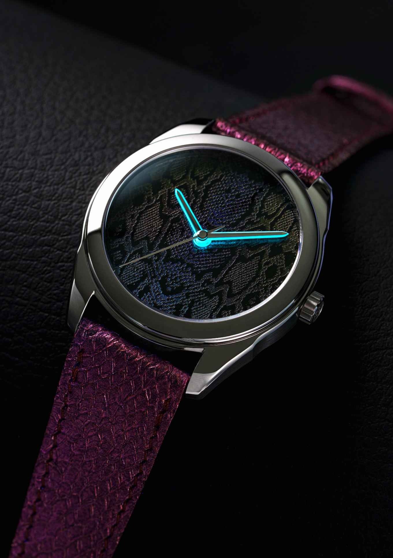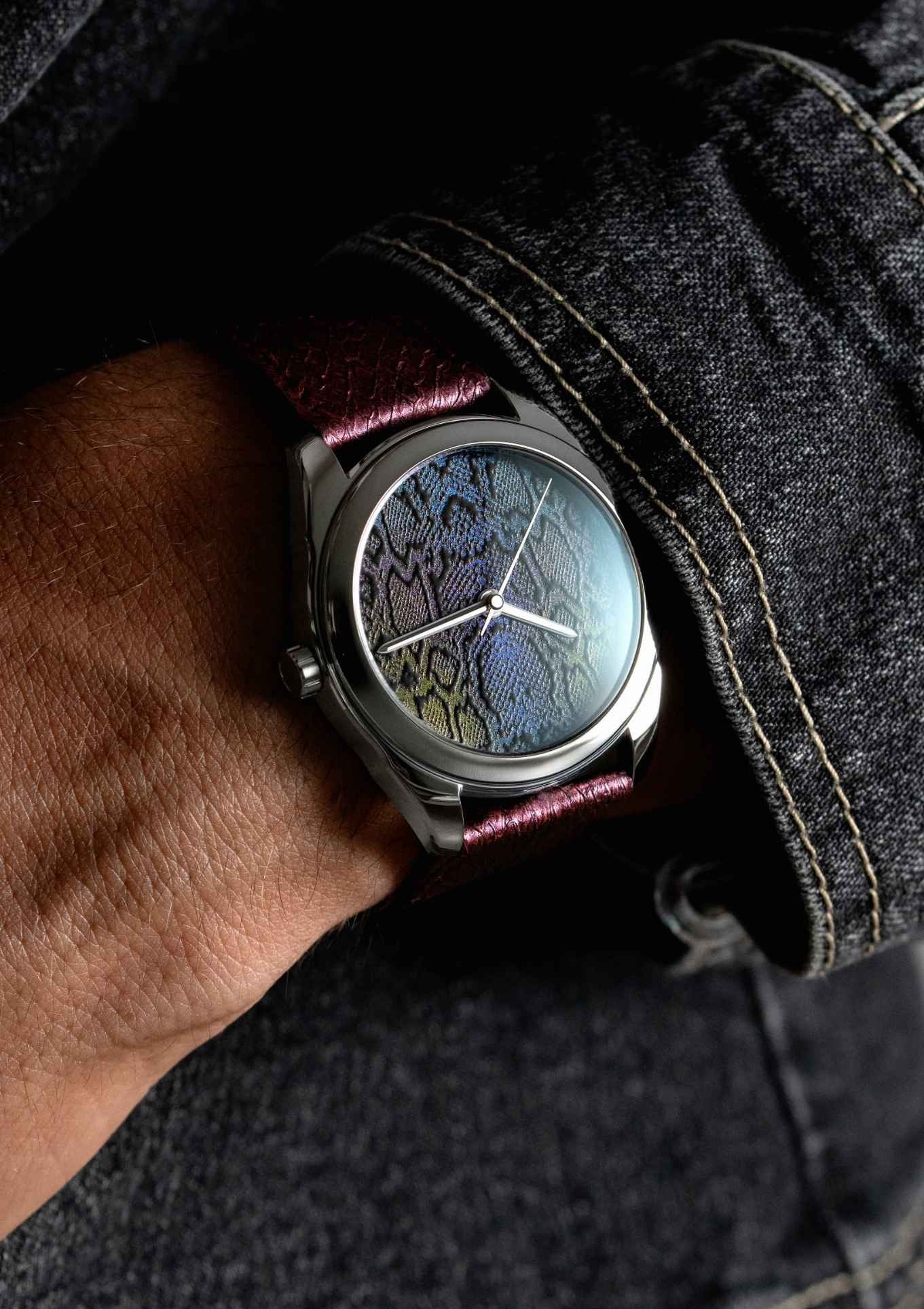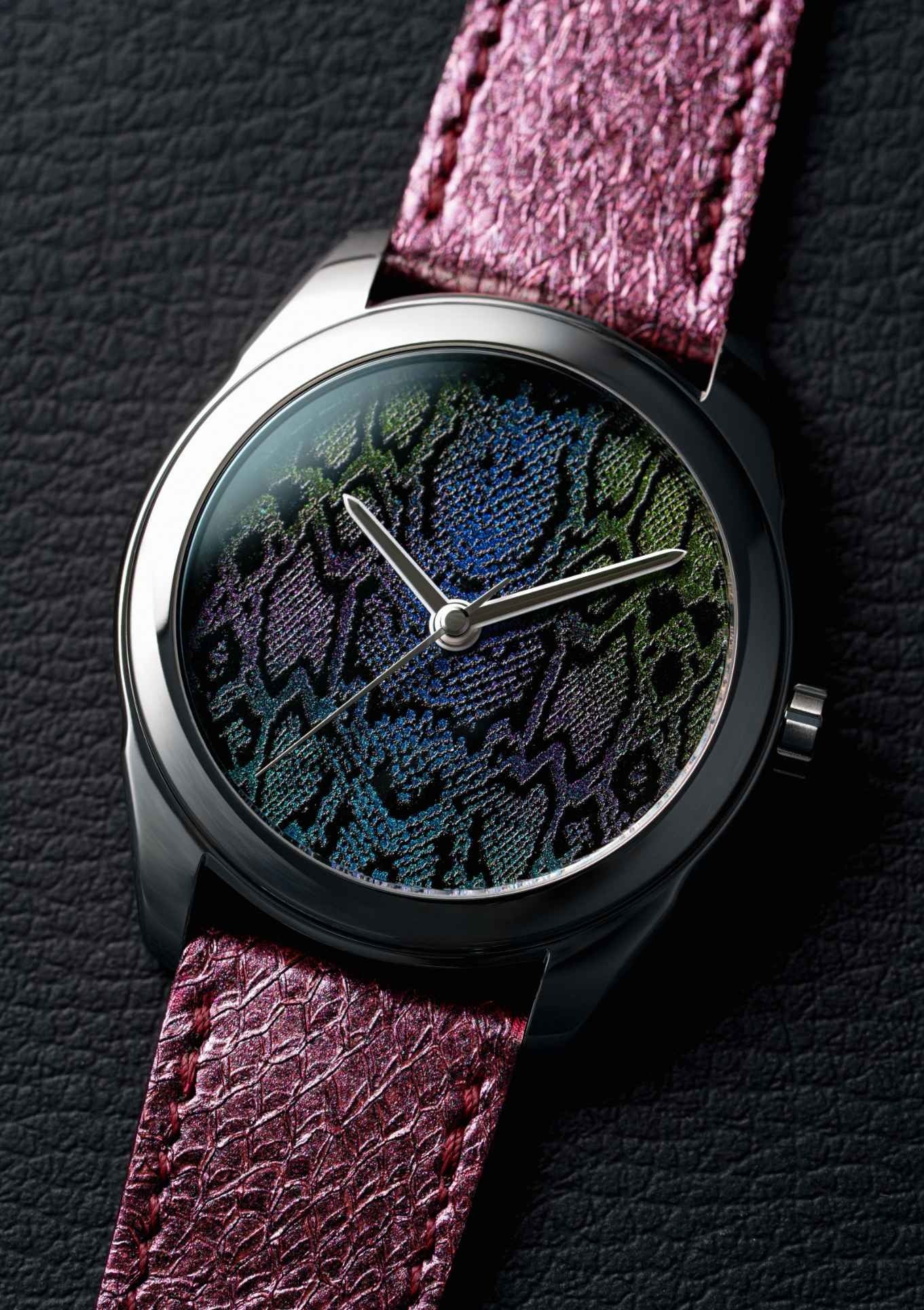 Das Zifferblatt wird in der traditionellen vietnamesische Sơn Mài-Technik lackiert und kombiniert mit natürlichen schwarzen Pigmenten. Die Basis ist handgefertigt in Vietnam von den AWAKE-Lackiermeistern und dann individuell gestaltet mit dem „Schlangenhaut“-Motiv, ebenfalls handgefertigt in Schottland vom zeitgenössischen Künstler Chris Alexander, "The Dial Artist".