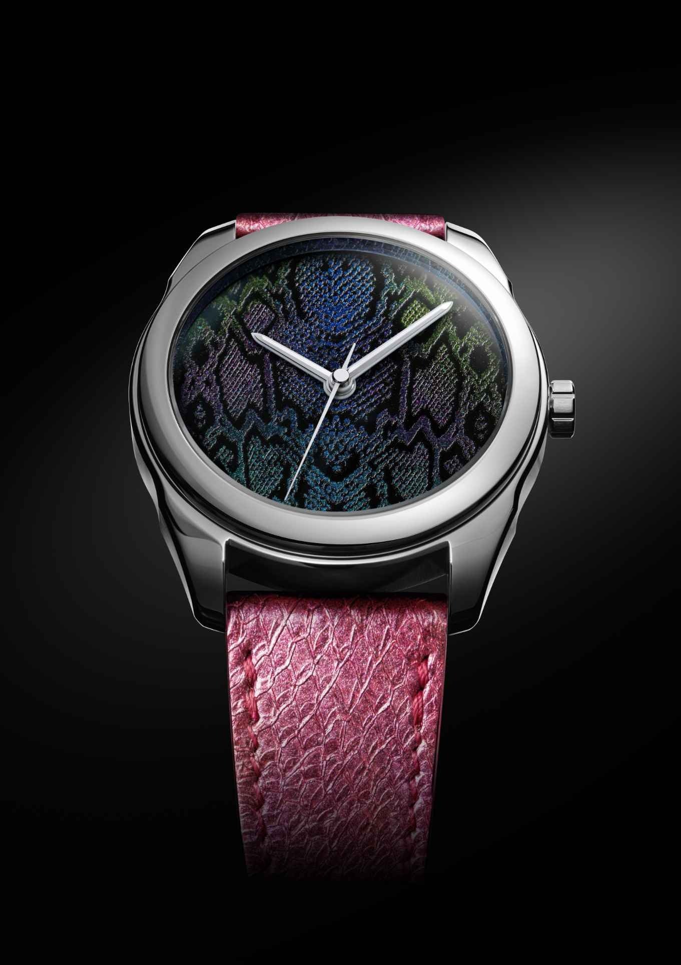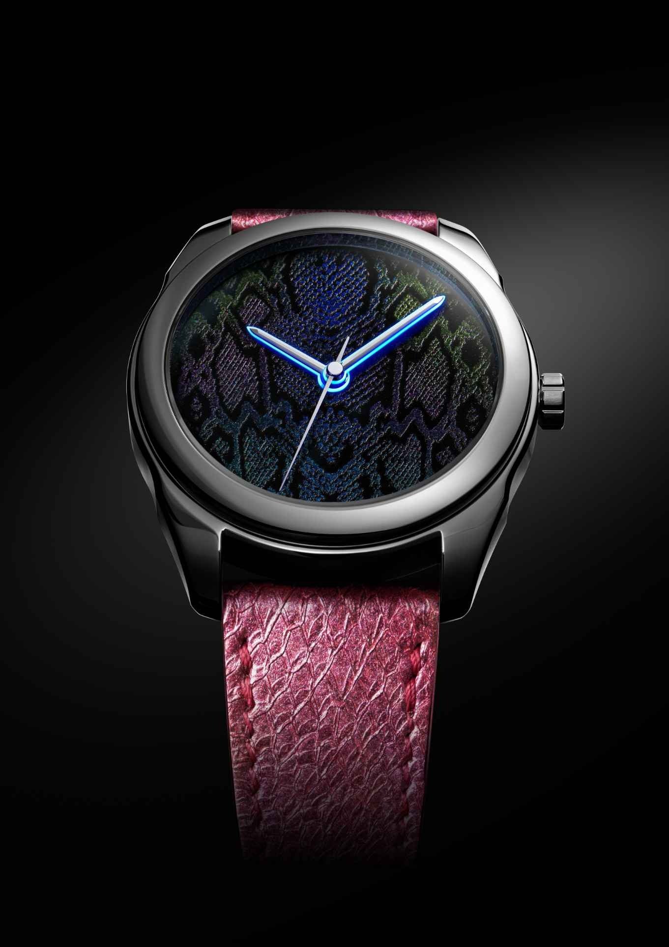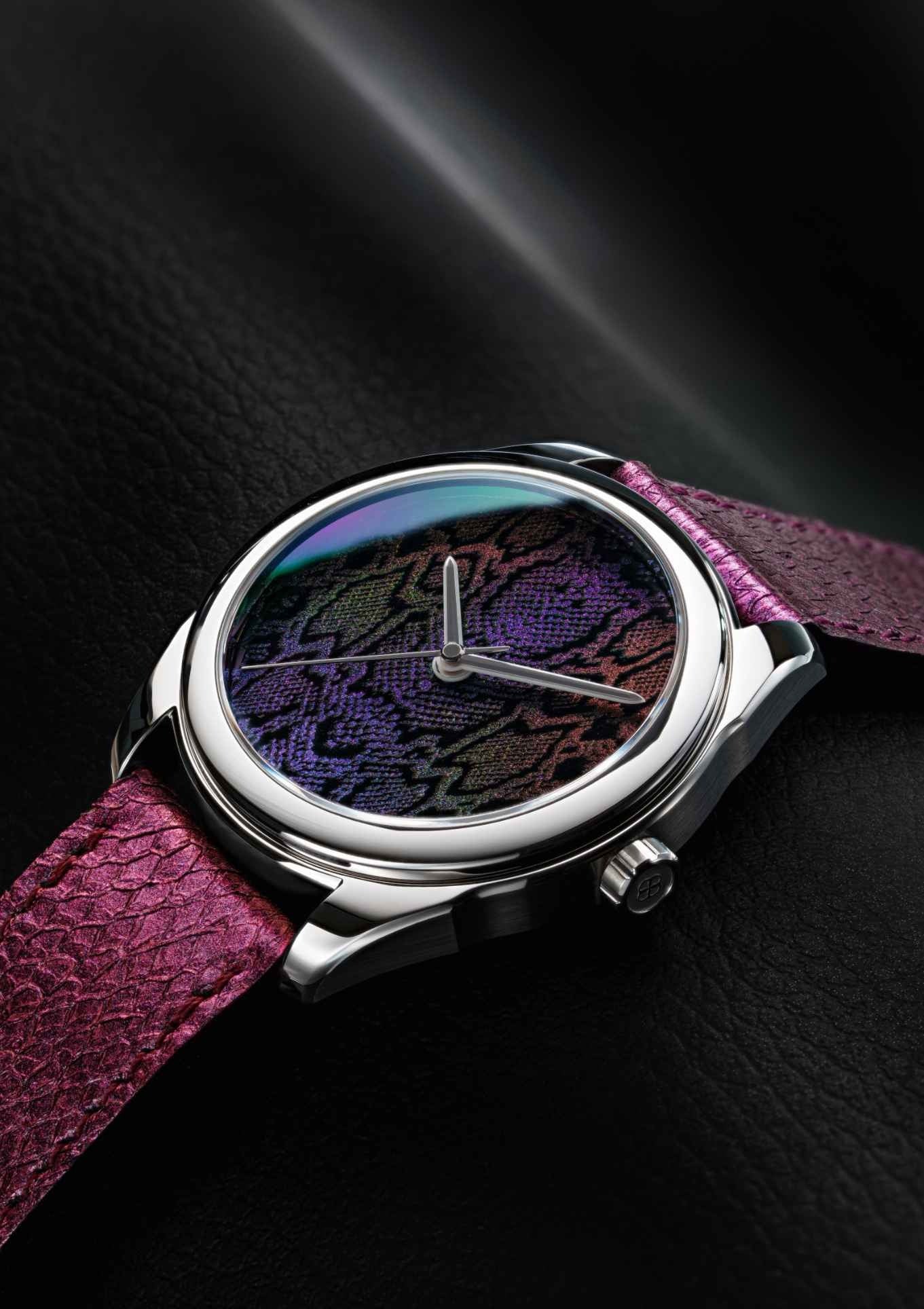 Das Zifferblatt wird in der traditionellen vietnamesische Sơn Mài-Technik lackiert und kombiniert mit natürlichen schwarzen Pigmenten. Die Basis ist handgefertigt in Vietnam von den AWAKE-Lackiermeistern und dann individuell gestaltet mit dem „Schlangenhaut“-Motiv, ebenfalls handgefertigt in Schottland vom zeitgenössischen Künstler Chris Alexander, "The Dial Artist".
