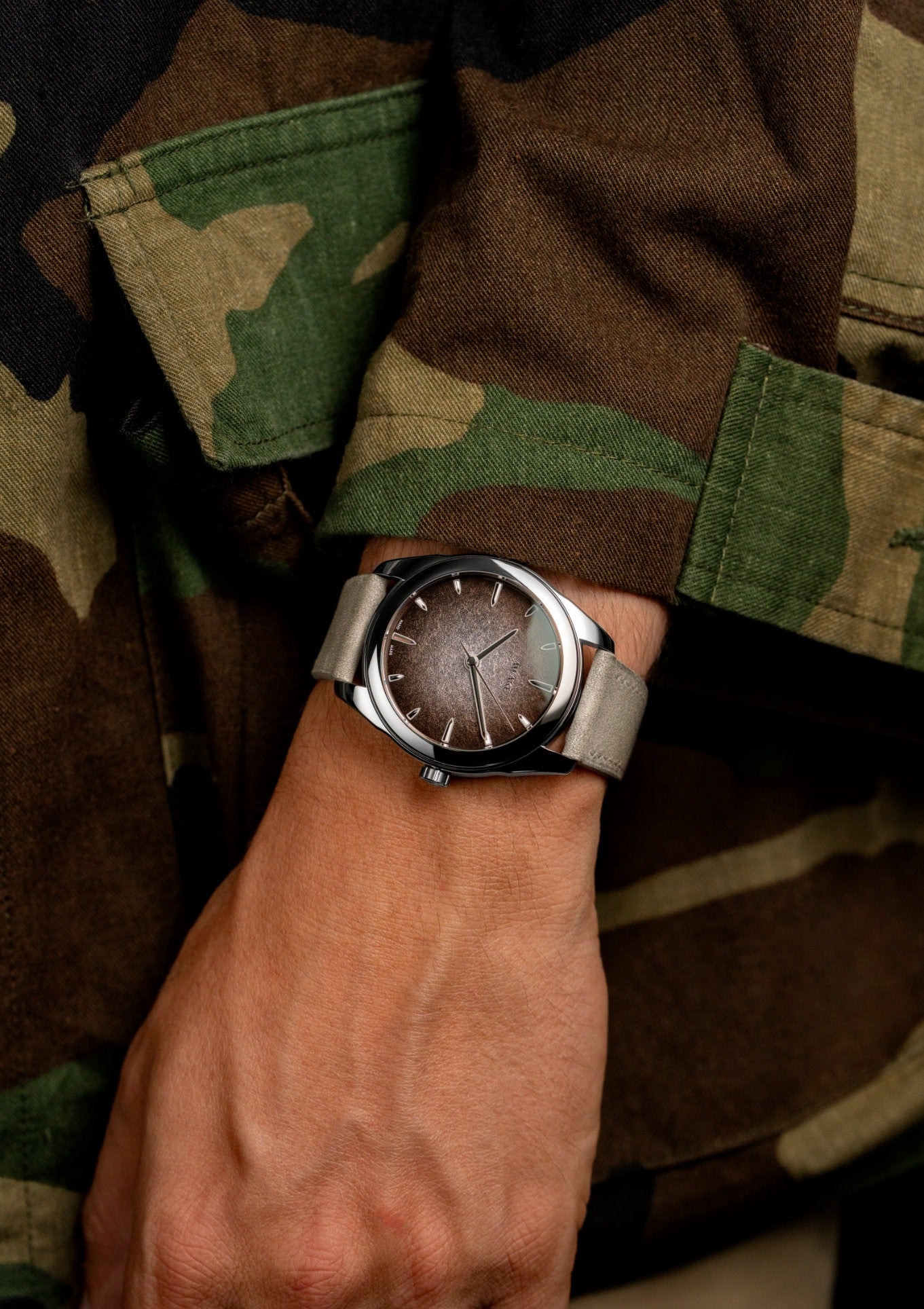 - Armband aus Nubuk-Rindsleder, handgefertigt in Frankreich und perfekt auf die subtilen Farb- und Materialeffekte des Zifferblatts abgestimmt. (Größe M: Handgelenkumfang 16,5 cm – 19,0 cm)