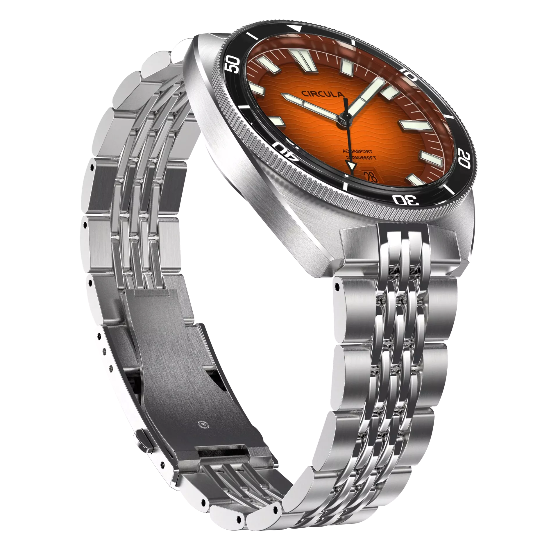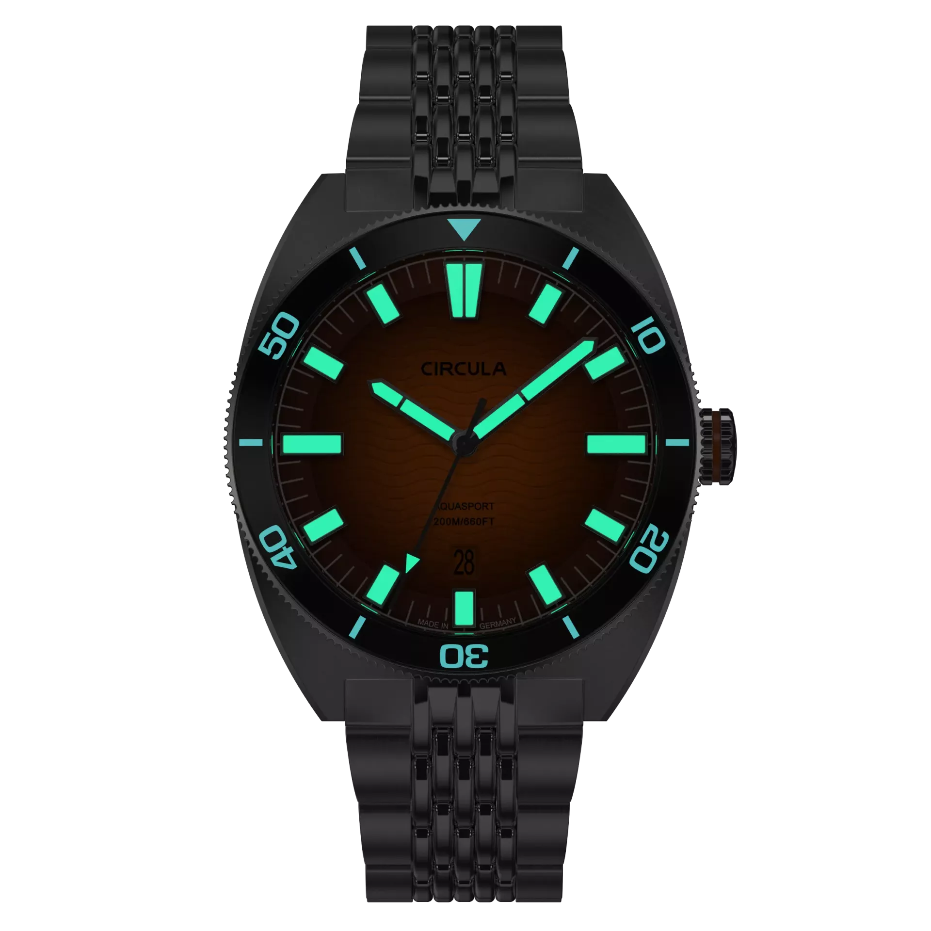 - Linksdrehende, kratzfeste Saphirglas-Lünette mit 120er Rastung und Leuchtindizes aus Swiss Super-LumiNova BGW9 (blau leuchtend)