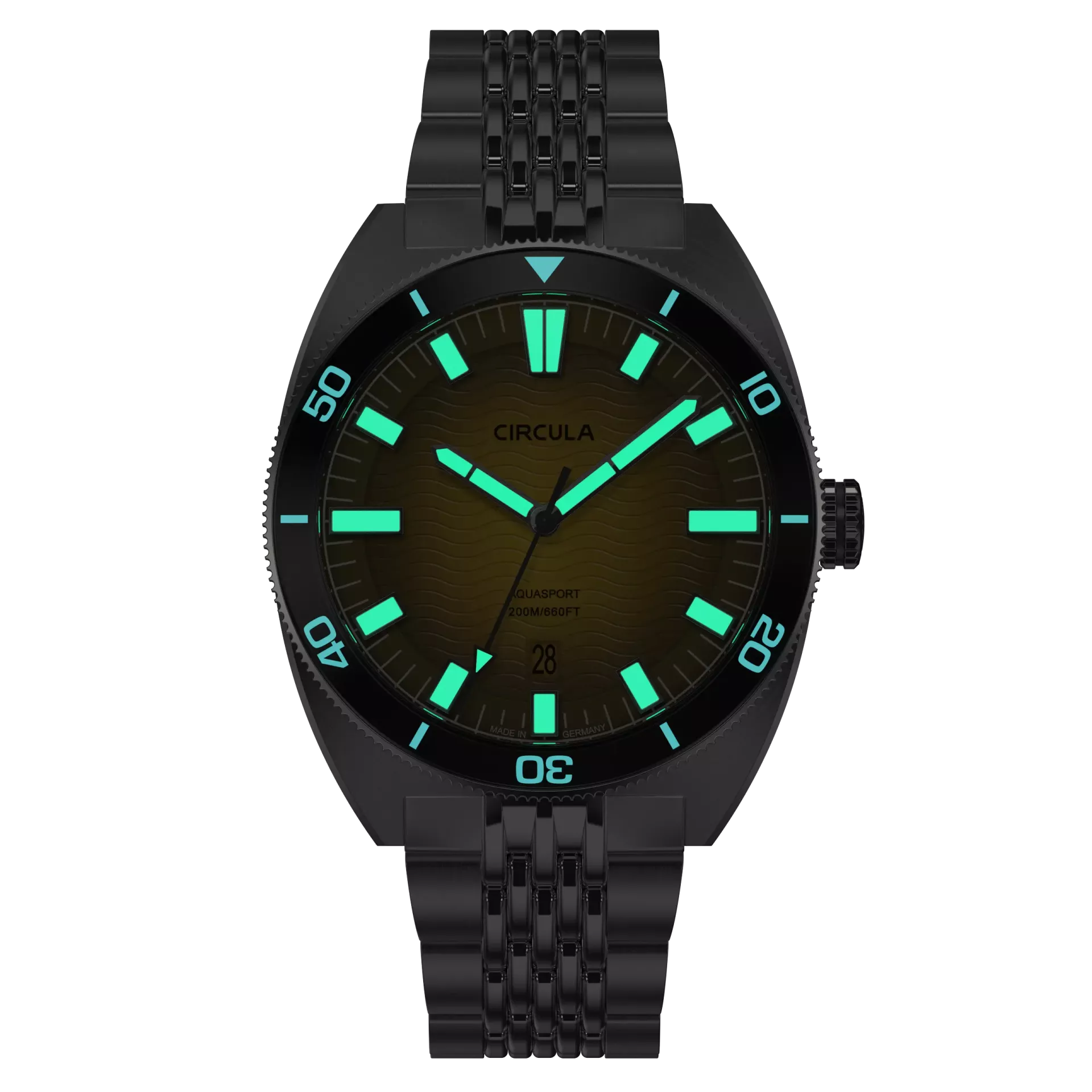 - Linksdrehende, kratzfeste Saphirglas-Lünette mit 120er Rastung und Leuchtindizes aus Swiss Super-LumiNova BGW9 (blau leuchtend)