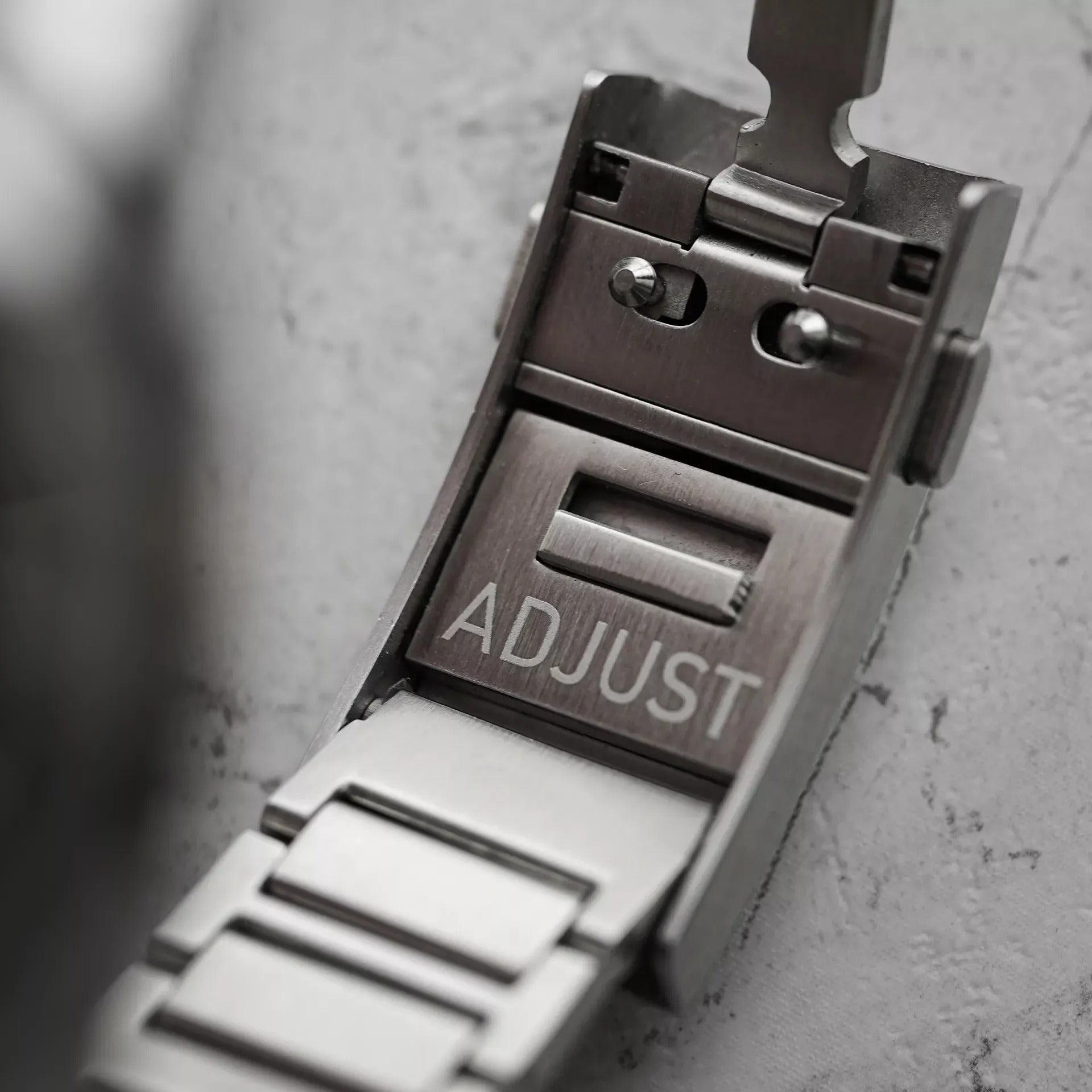 - Massives, integriertes Stahlband mit Schnellwechselsystem, verschraubten Gliedern (inkl. zwei Halbgliedern und Schraubenzieher) und Sicherheitsschließe mit Schnellverstellung