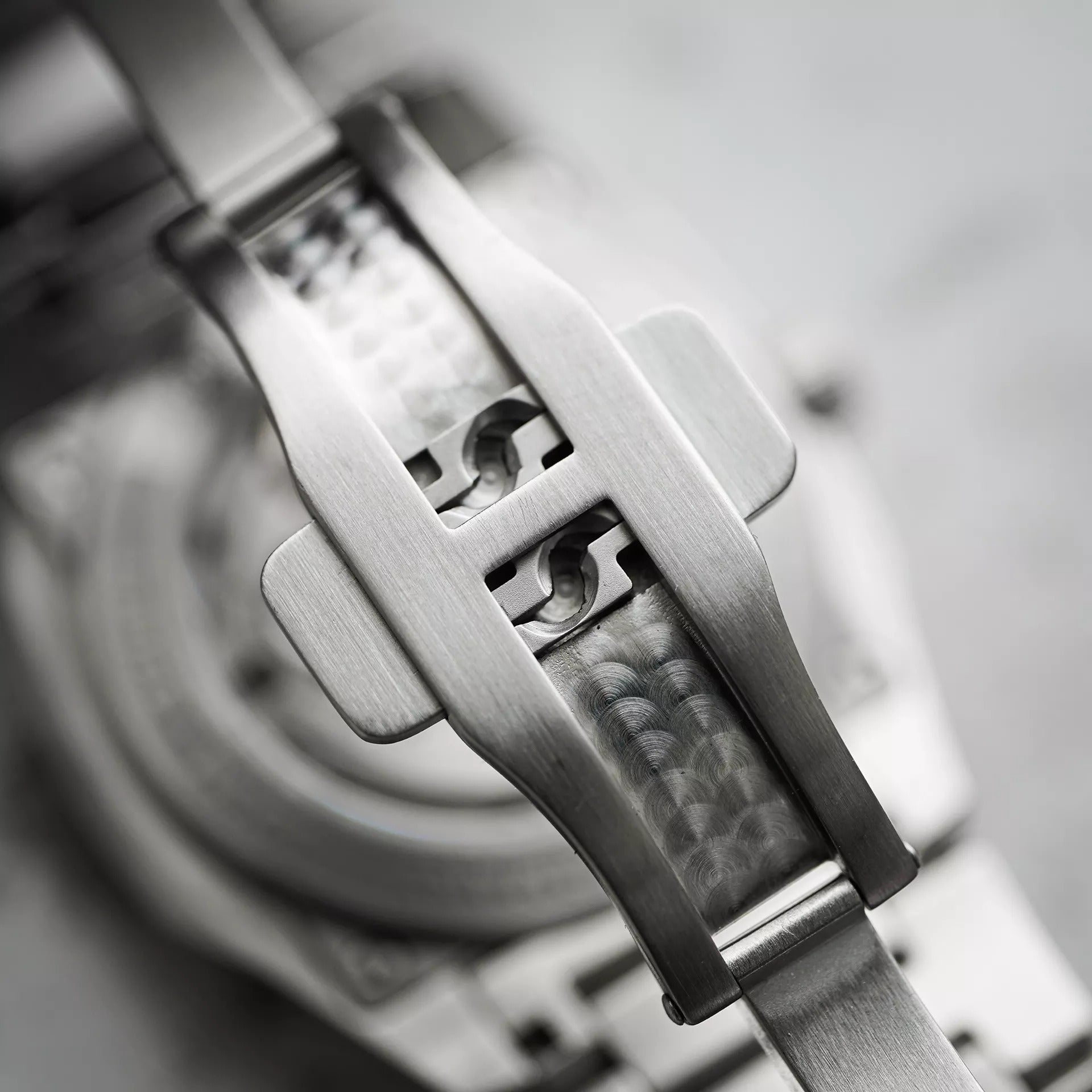 - Massives, integriertes Stahlband mit Schnellwechselsystem, verschraubten Gliedern (inkl. zwei Halbgliedern und Schraubenzieher) und Sicherheitsschließe mit Schnellverstellung