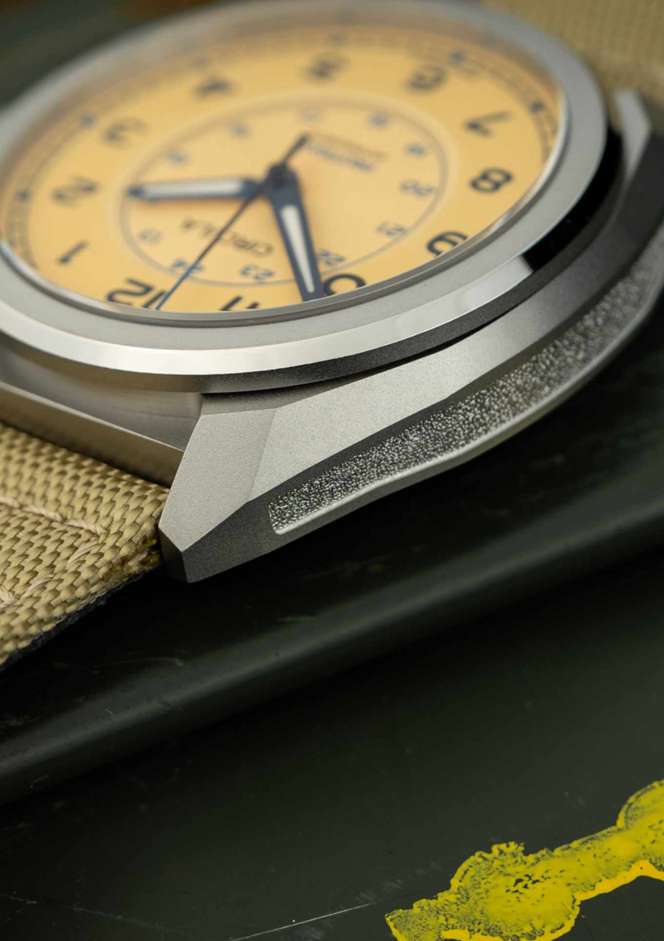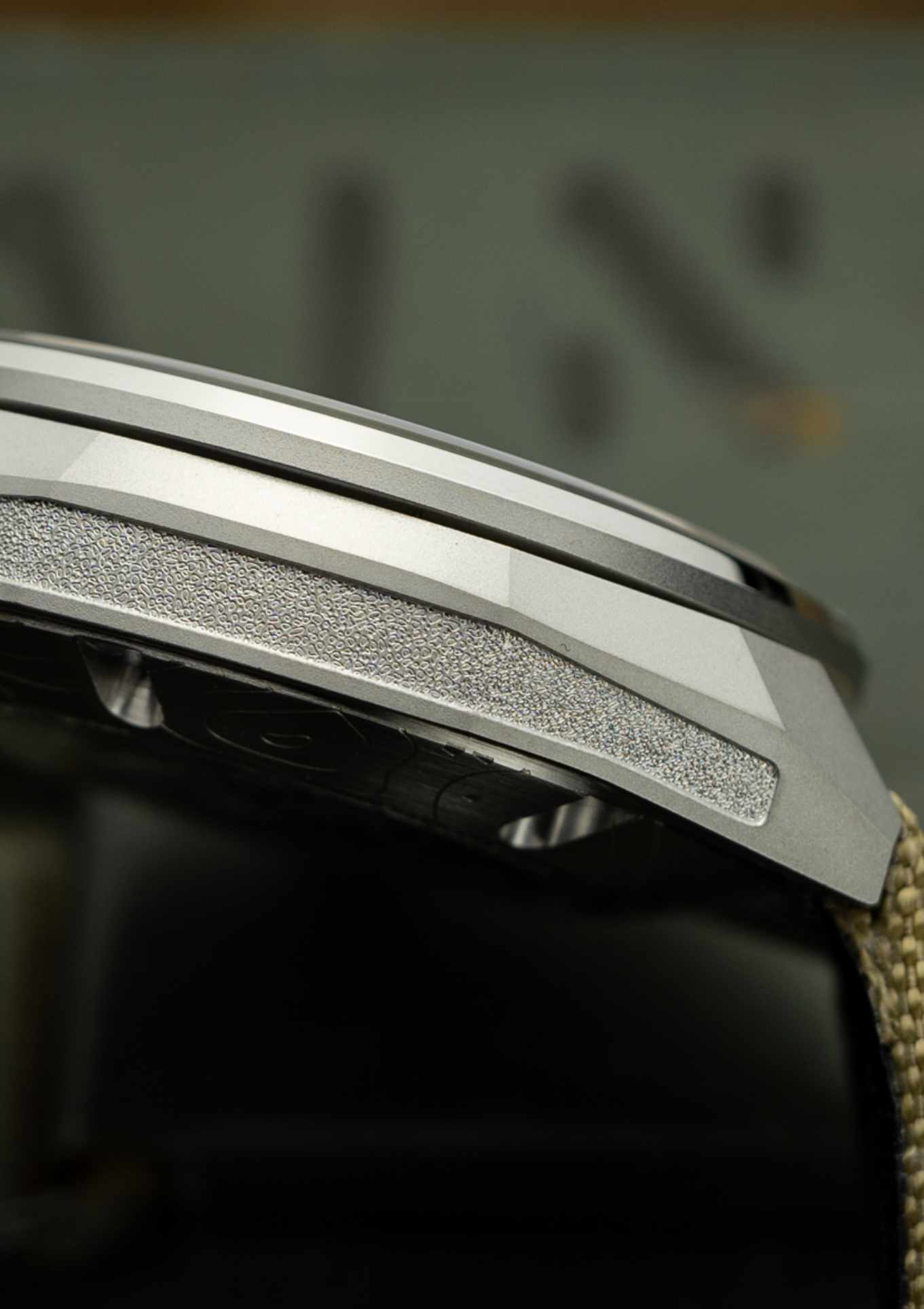 - Kratzfestes, entspiegeltes Saphirglas, leicht gewölbt, innen doppelt entspiegelt