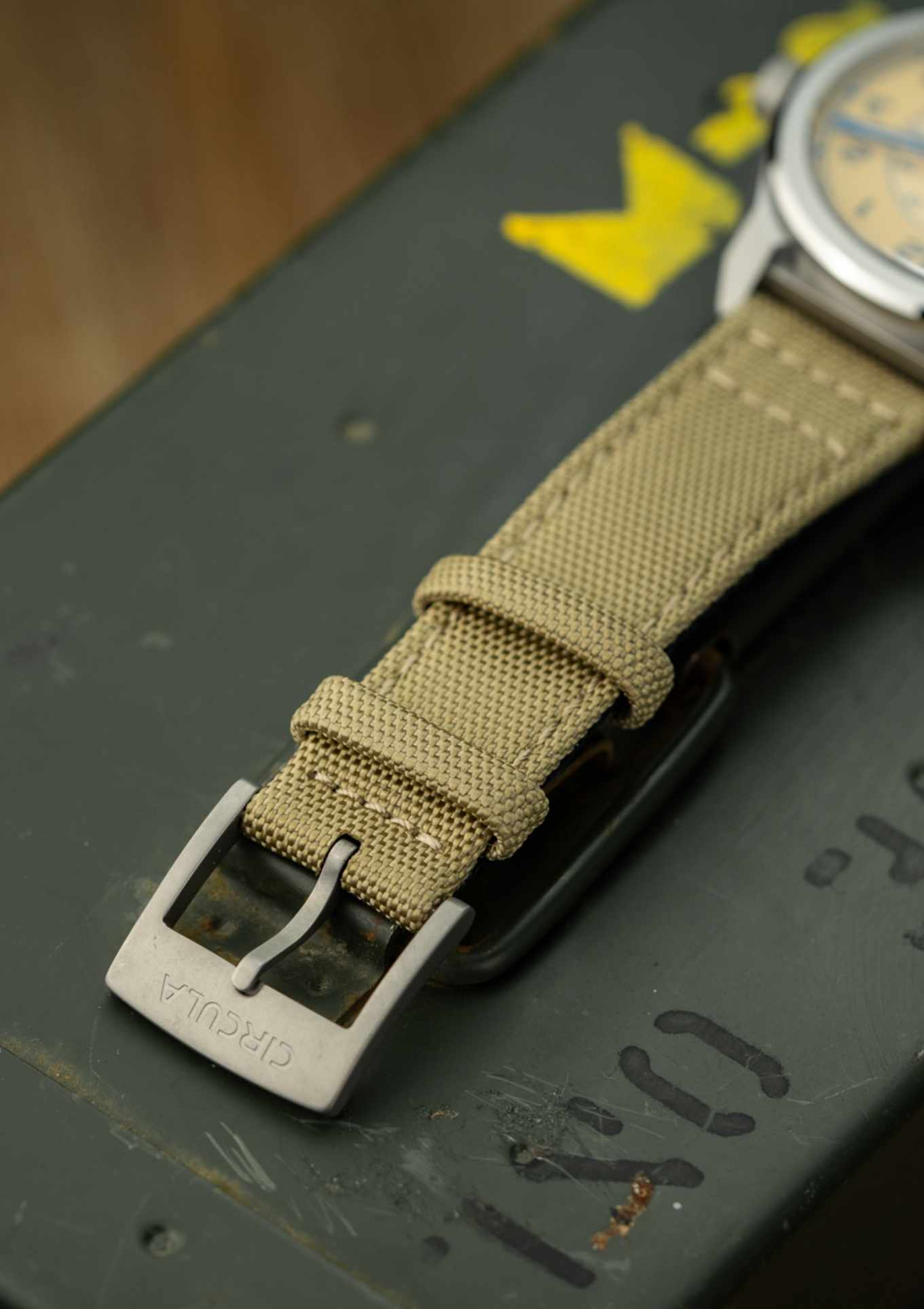 - Nylon Segeltuch-Band mit echtem Leder auf der Innenseite, Schnellwechselsystem und kratzfester Dornschließe