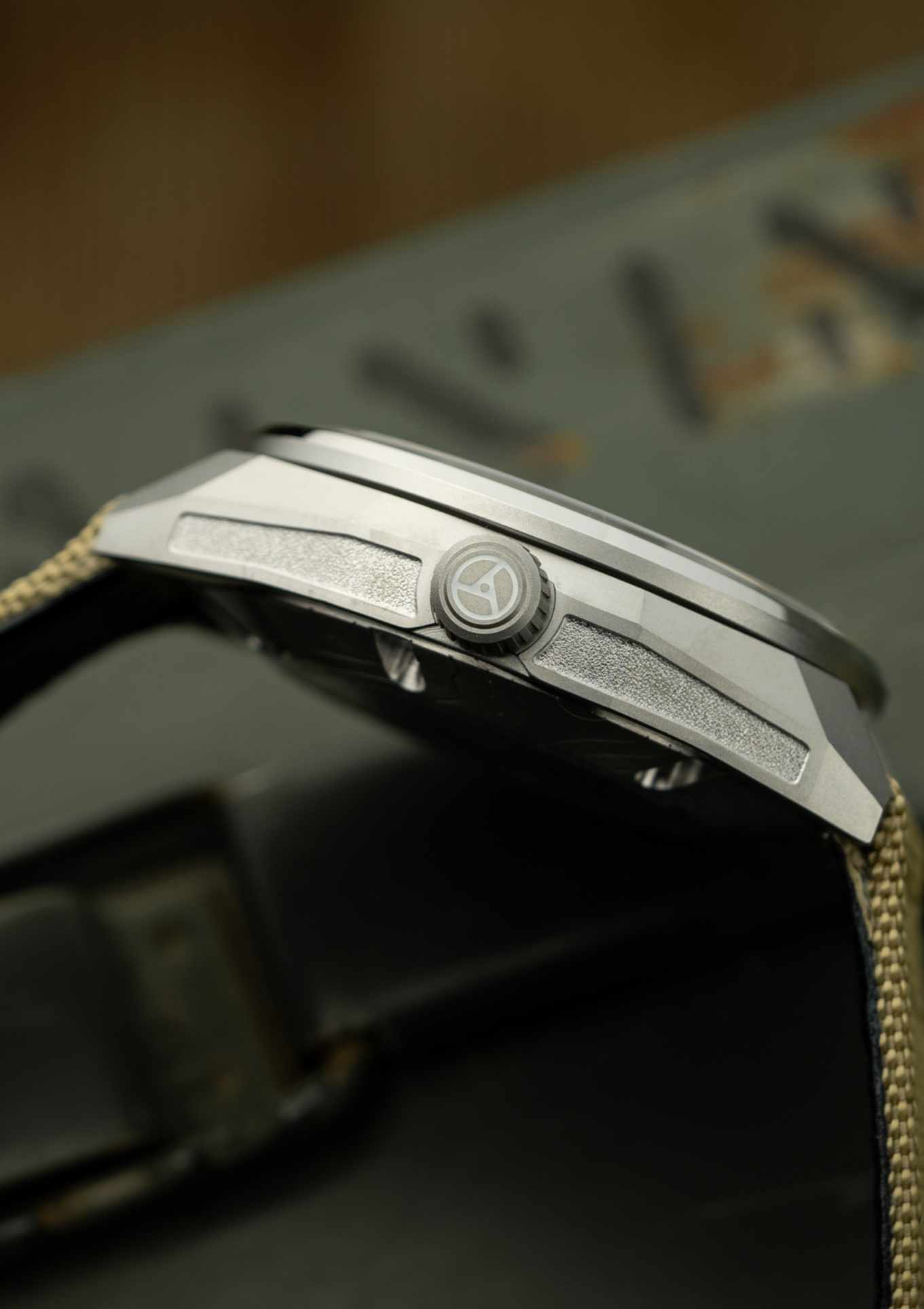 - Gravierte Krone, belegt mit Swiss Super-LumiNova® BGW9 Leuchtmasse