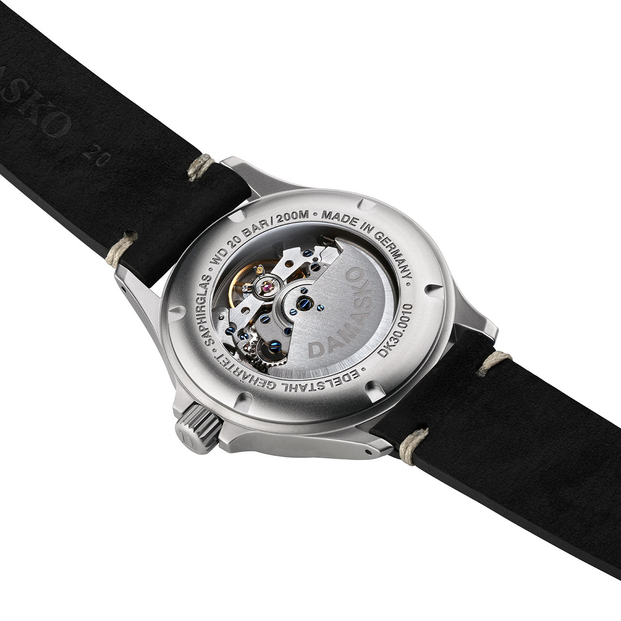- Glass case back with a view of the refined movement and the skeletonized DAMASKO rotor