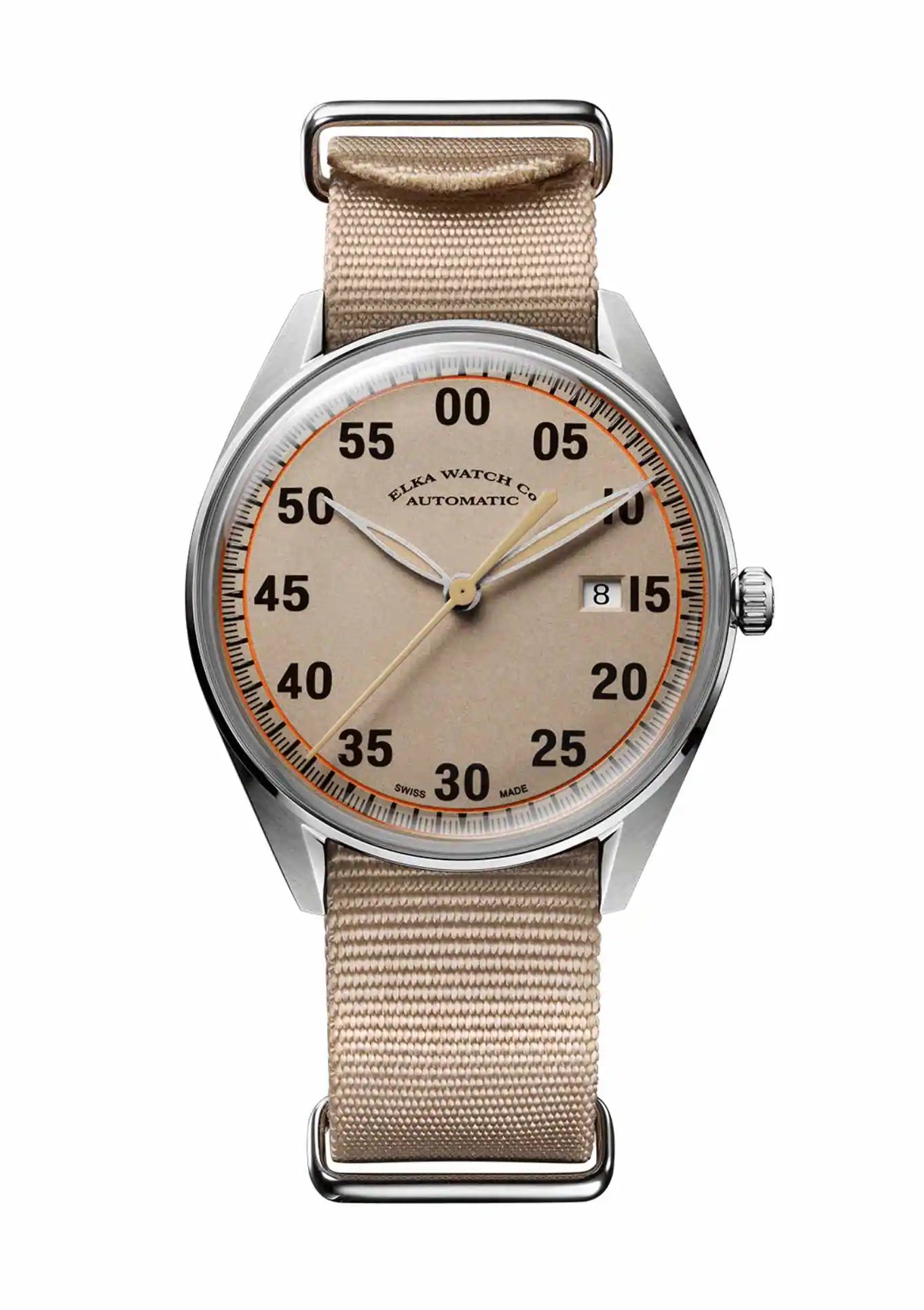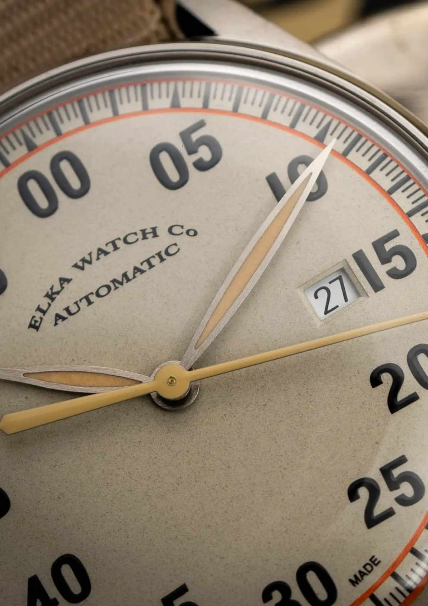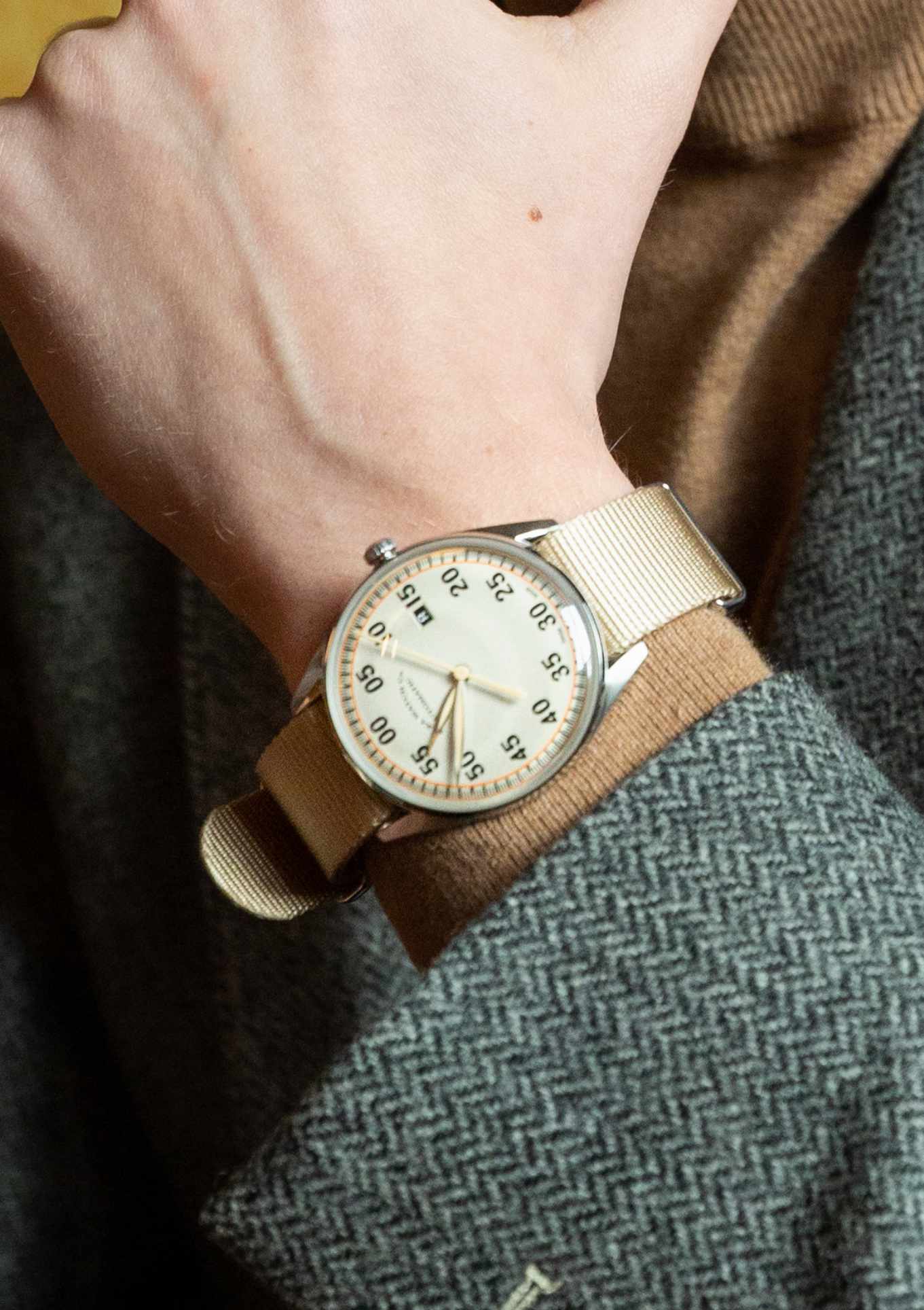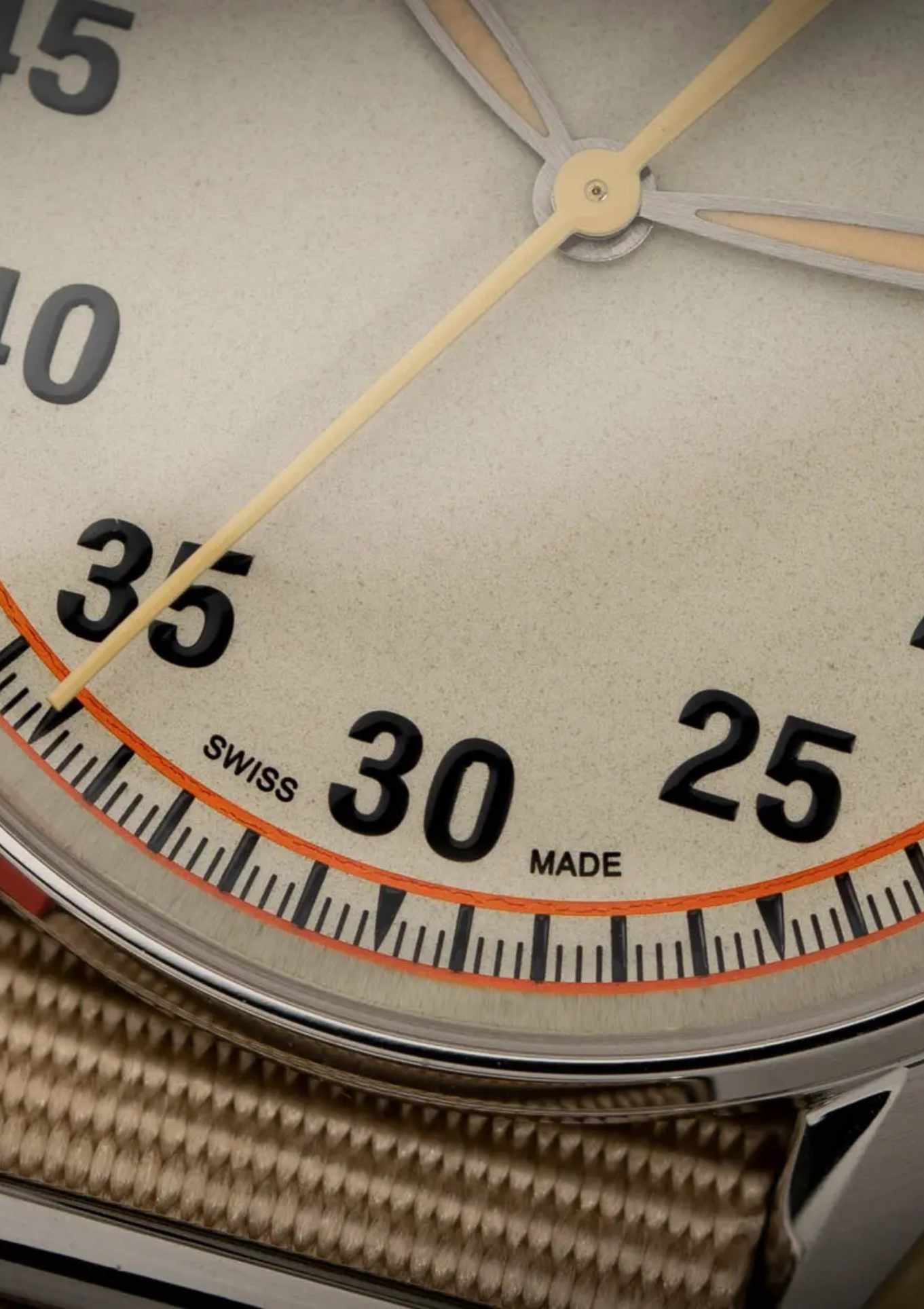 - Gebürstete Stunden- und Minutenzeiger mit beigem Superluminova gefüllt, beigefarbener Sekundenzeiger