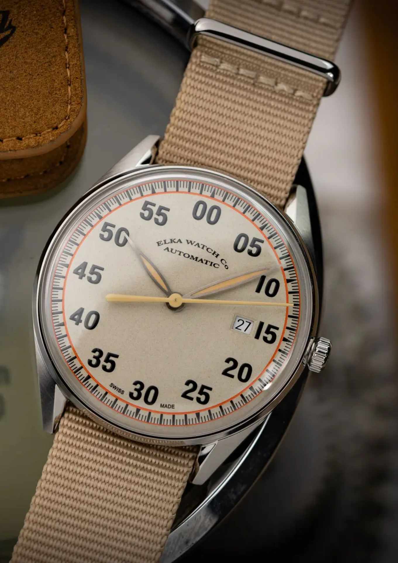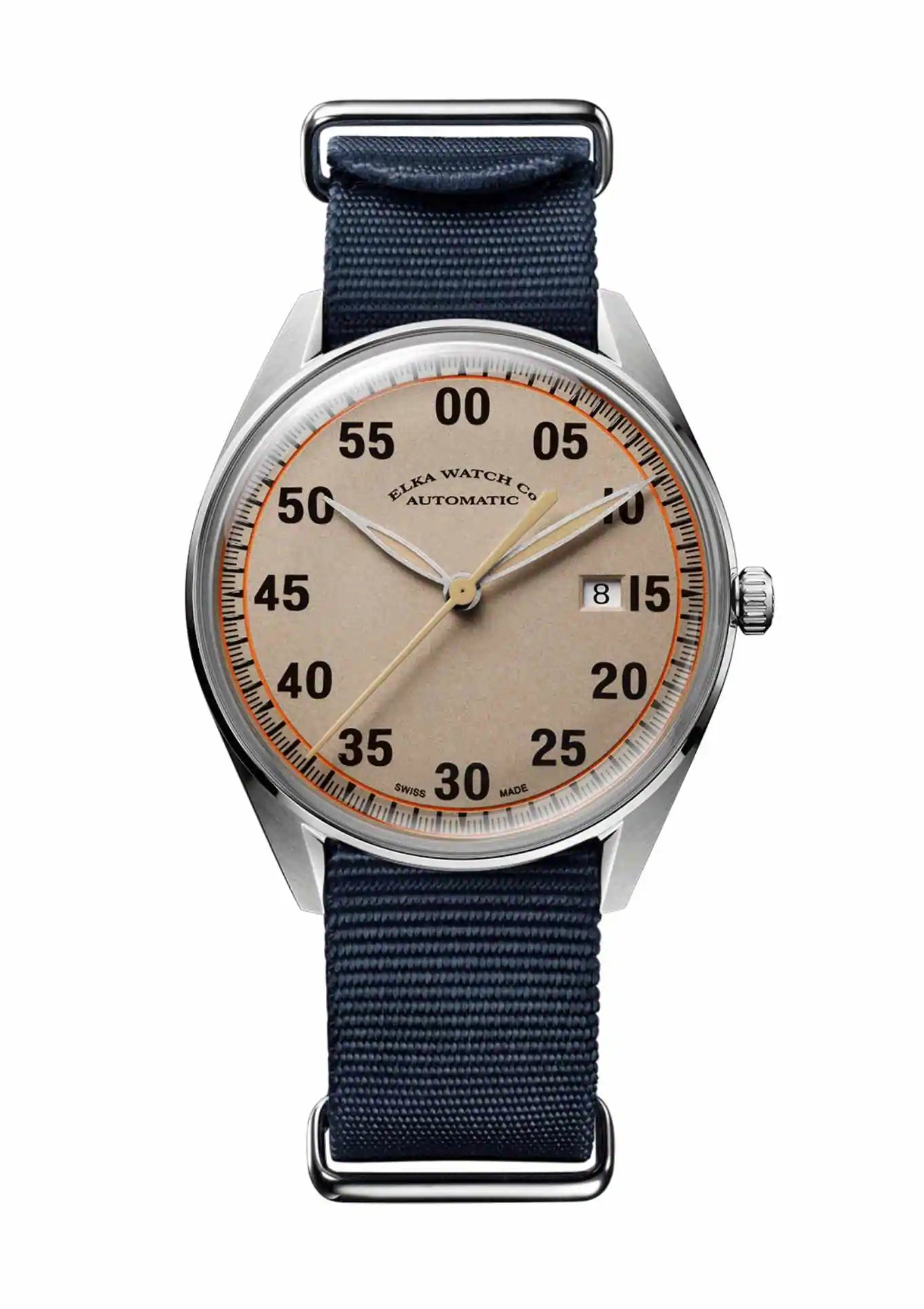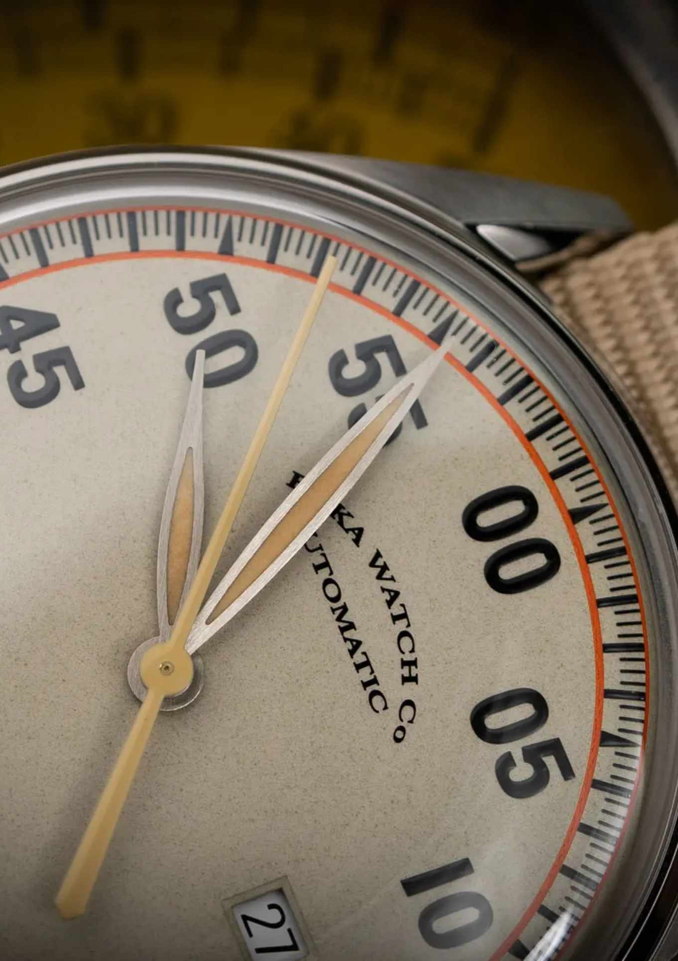 - Gebürstete Stunden- und Minutenzeiger mit beigem Superluminova gefüllt, beigefarbener Sekundenzeiger