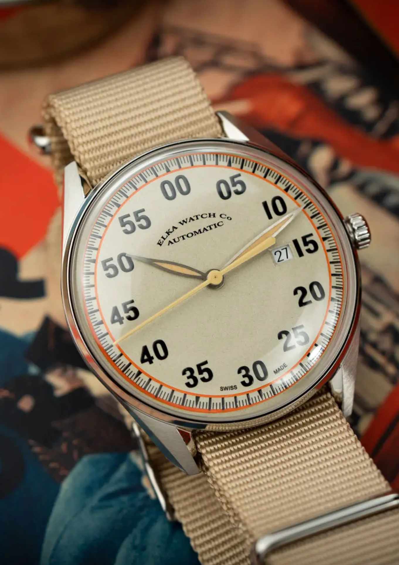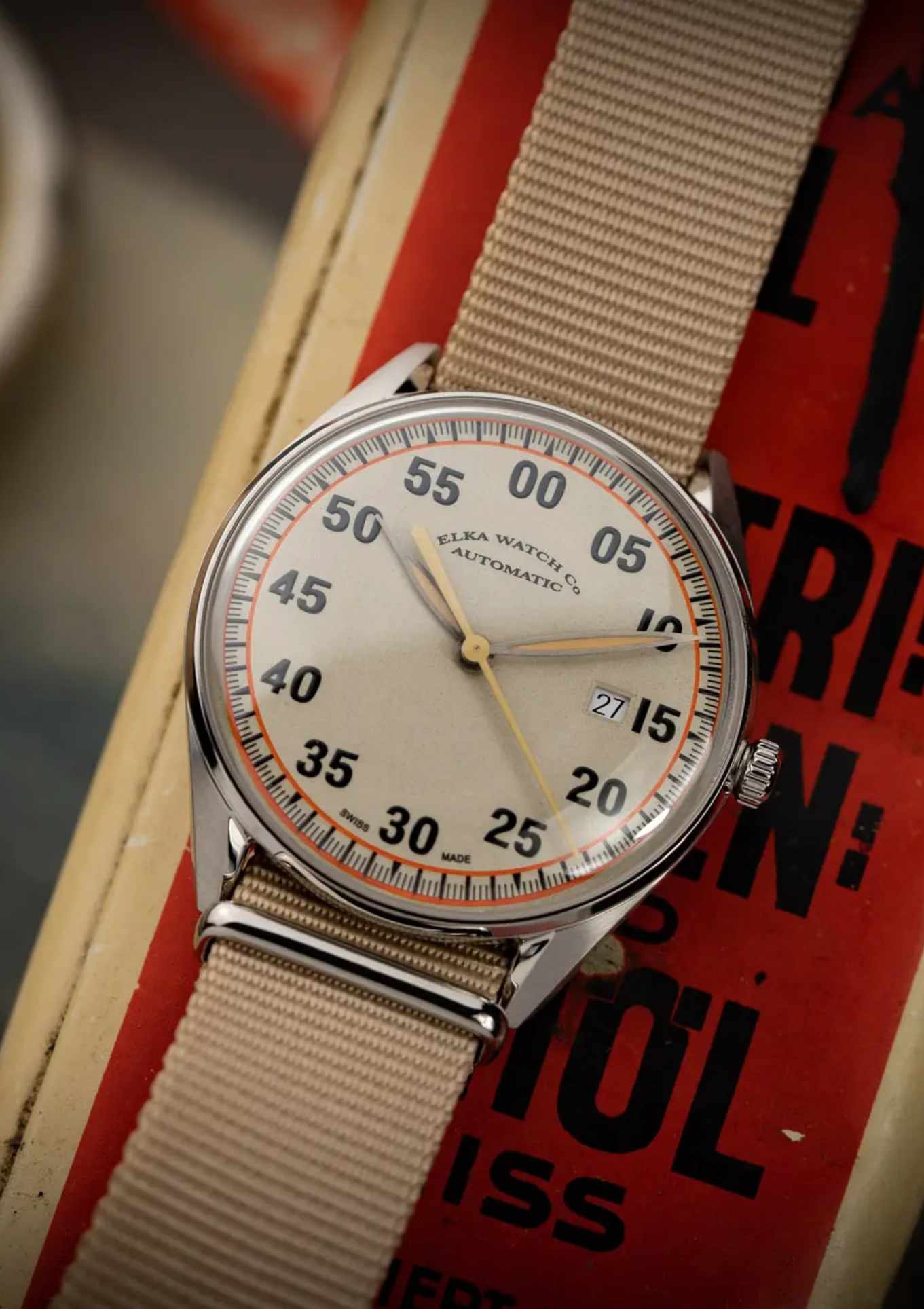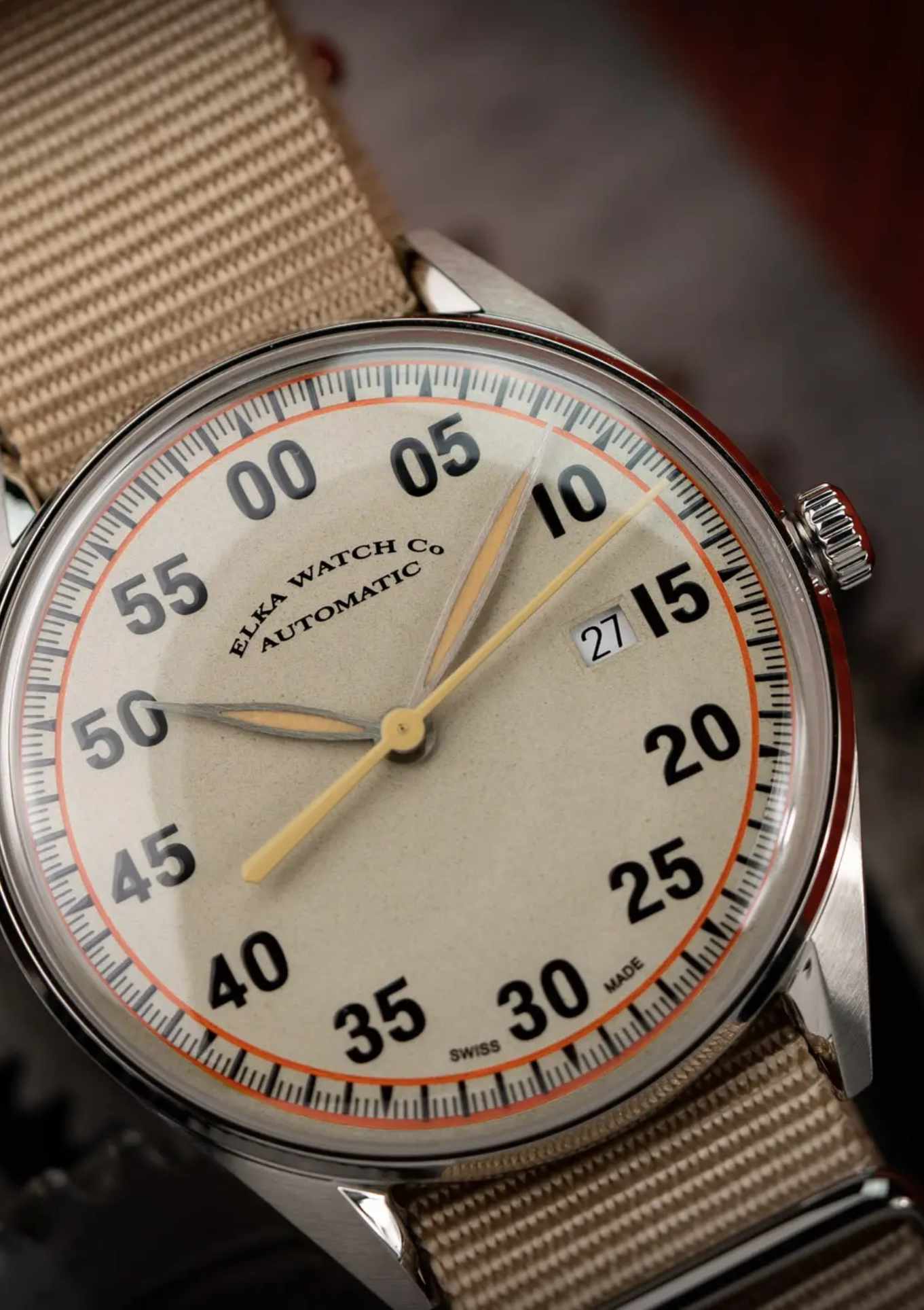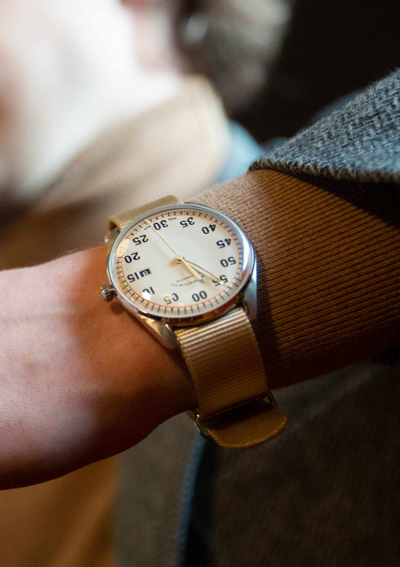 - Gebürstete Stunden- und Minutenzeiger mit beigem Superluminova gefüllt, beigefarbener Sekundenzeiger