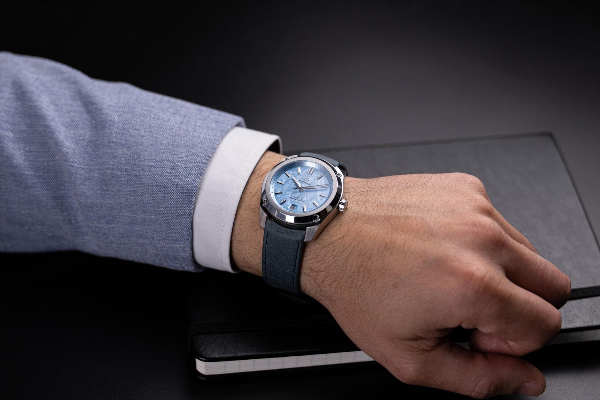 - Zifferblatt mit Schicht aus 98% reinem Silber und transparentem, Gletscher-blauem Lack