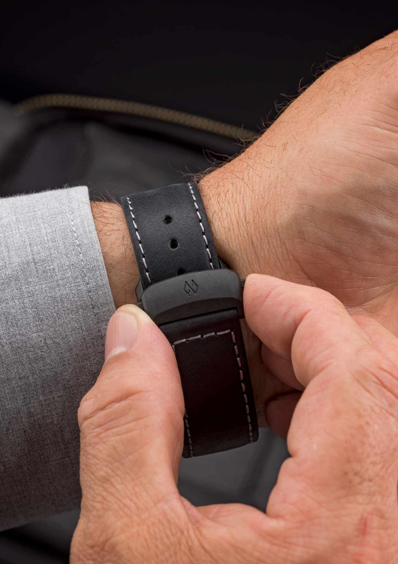 - Italienisches Lederband mit gebogenen Federstegen, Schnellwechselsystem und Karbon-Faltschließe mit patentierter Feinjustierung