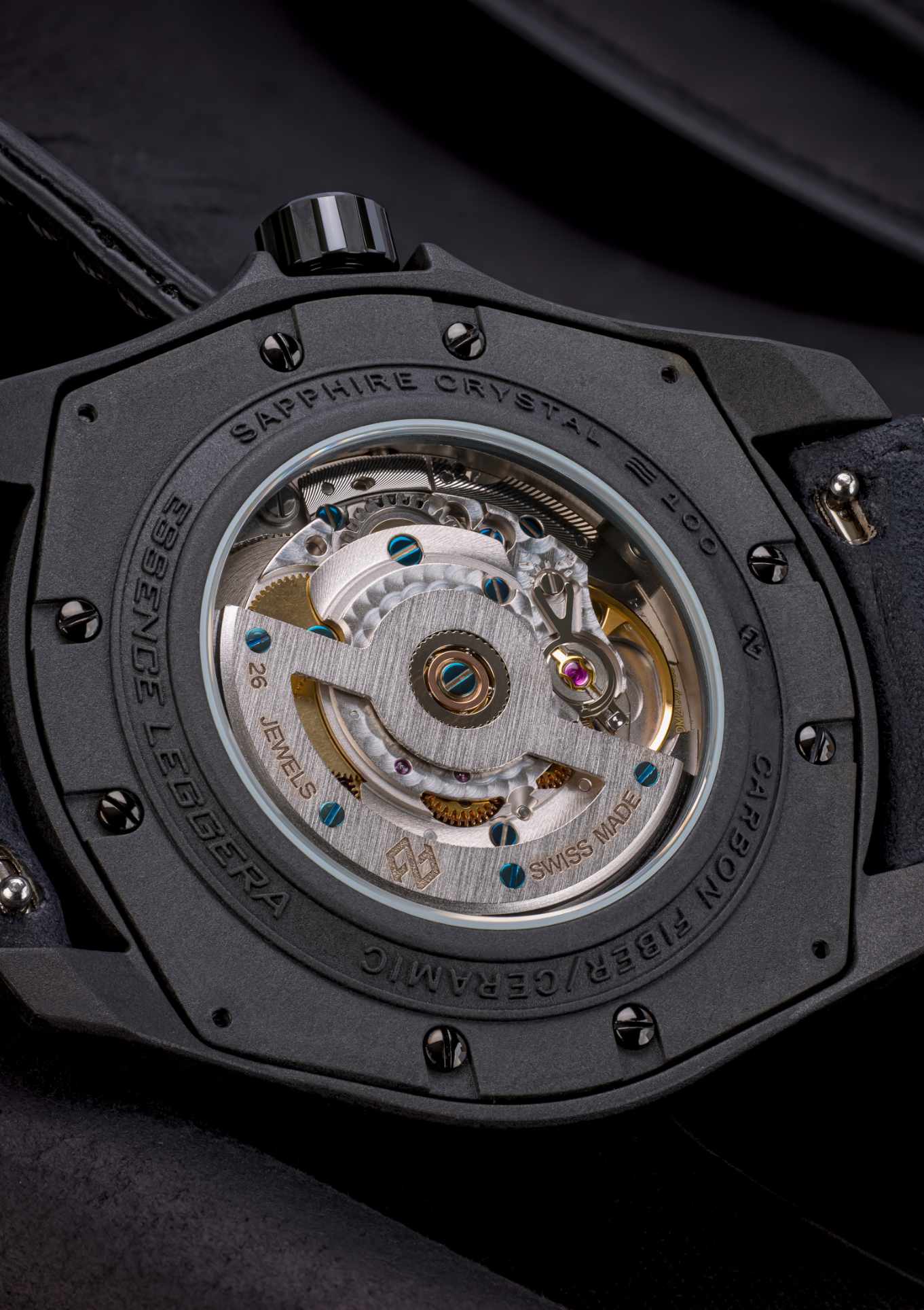 - Schwarzes Kautschukband mit gebogenen Federstegen, Schnellwechselsystem und Karbon-Faltschließe mit patentierter Feinjustierung