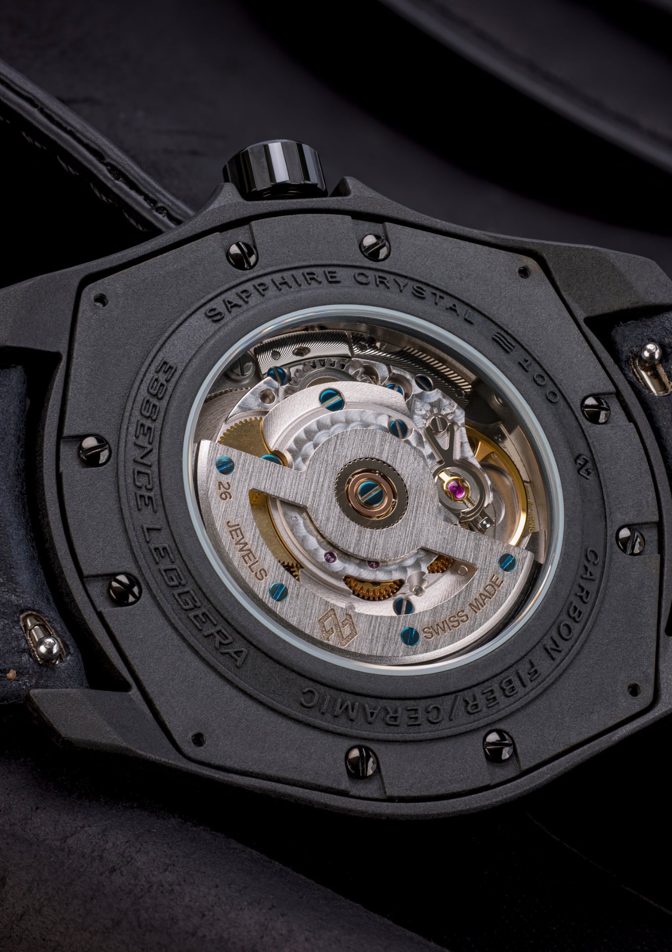 - Italienisches Lederband mit gebogenen Federstegen, Schnellwechselsystem und Edelstahl-Karbon-Faltschließe mit patentierter Feinjustierung