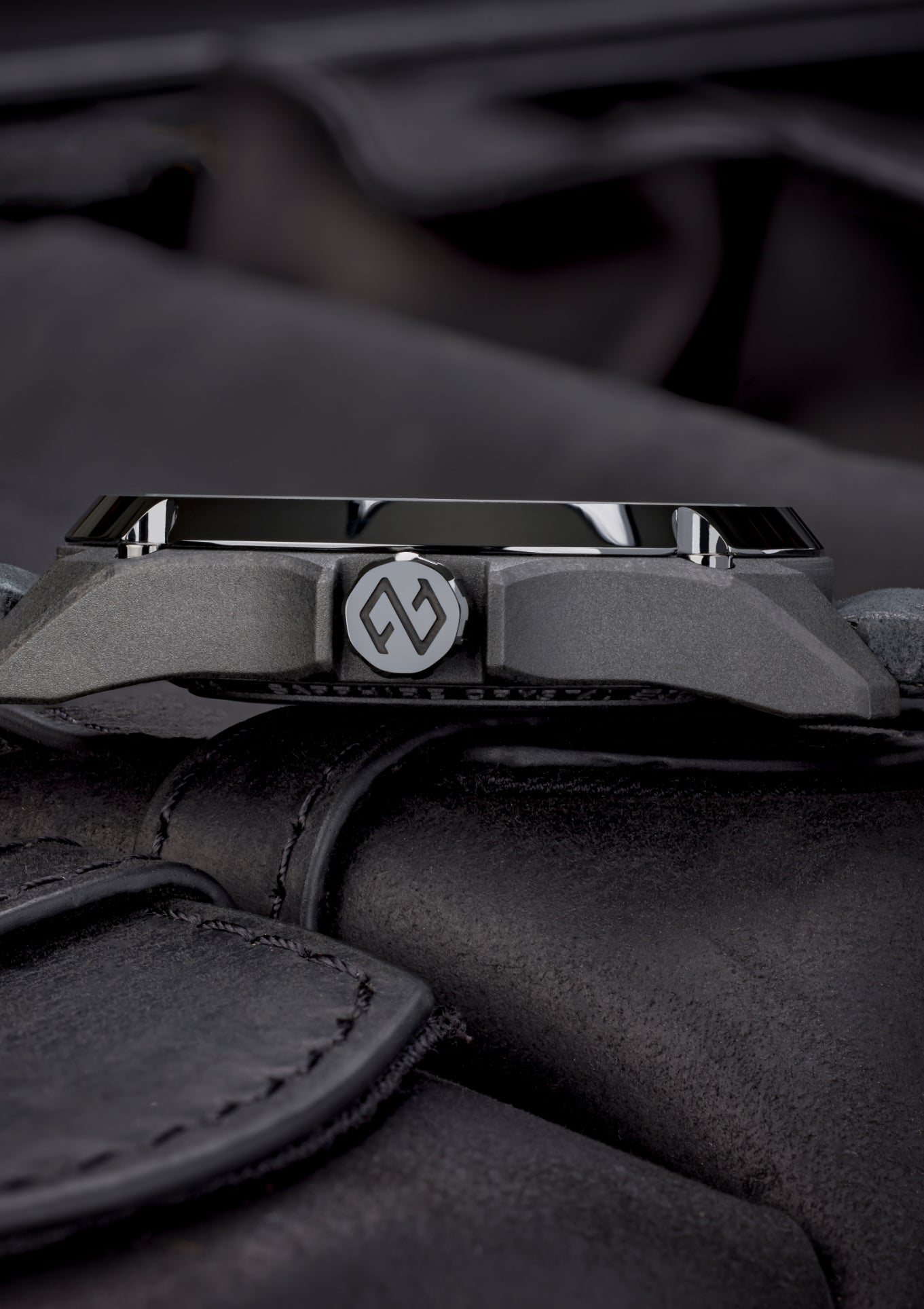 - Schwarzes Kautschukband mit gebogenen Federstegen, Schnellwechselsystem und Edelstahl-Karbon-Faltschließe mit patentierter Feinjustierung