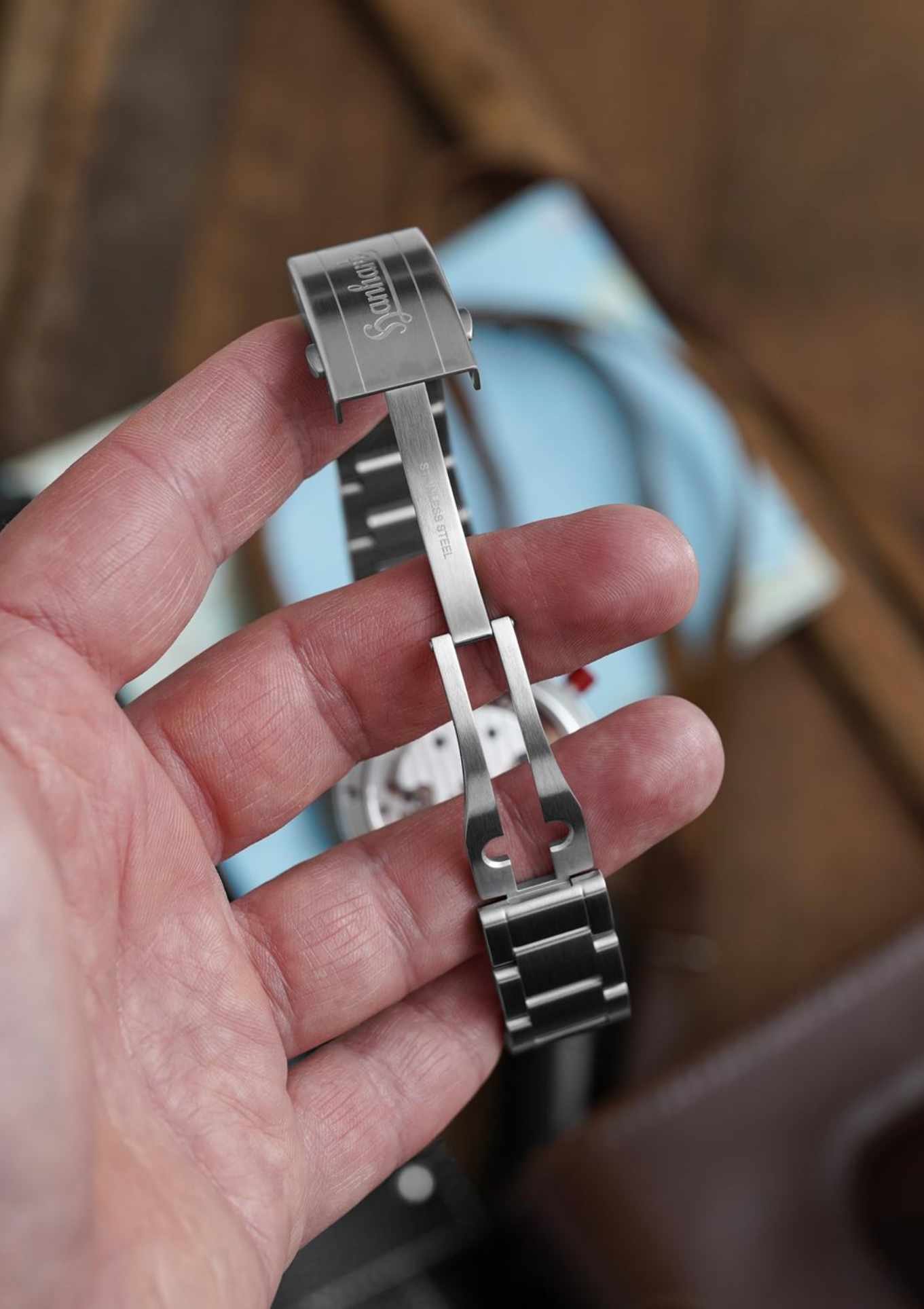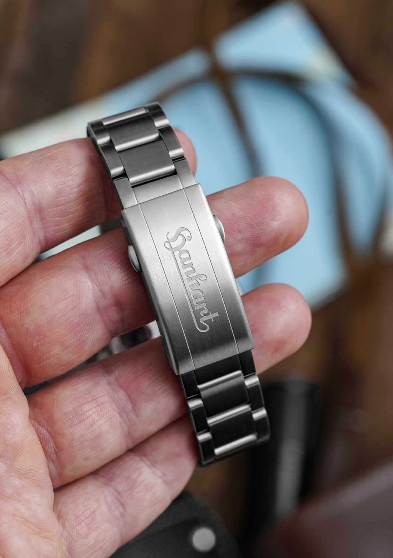 - Edelstahl-Dornschließe aus Edelstahl mit historischem Logo
