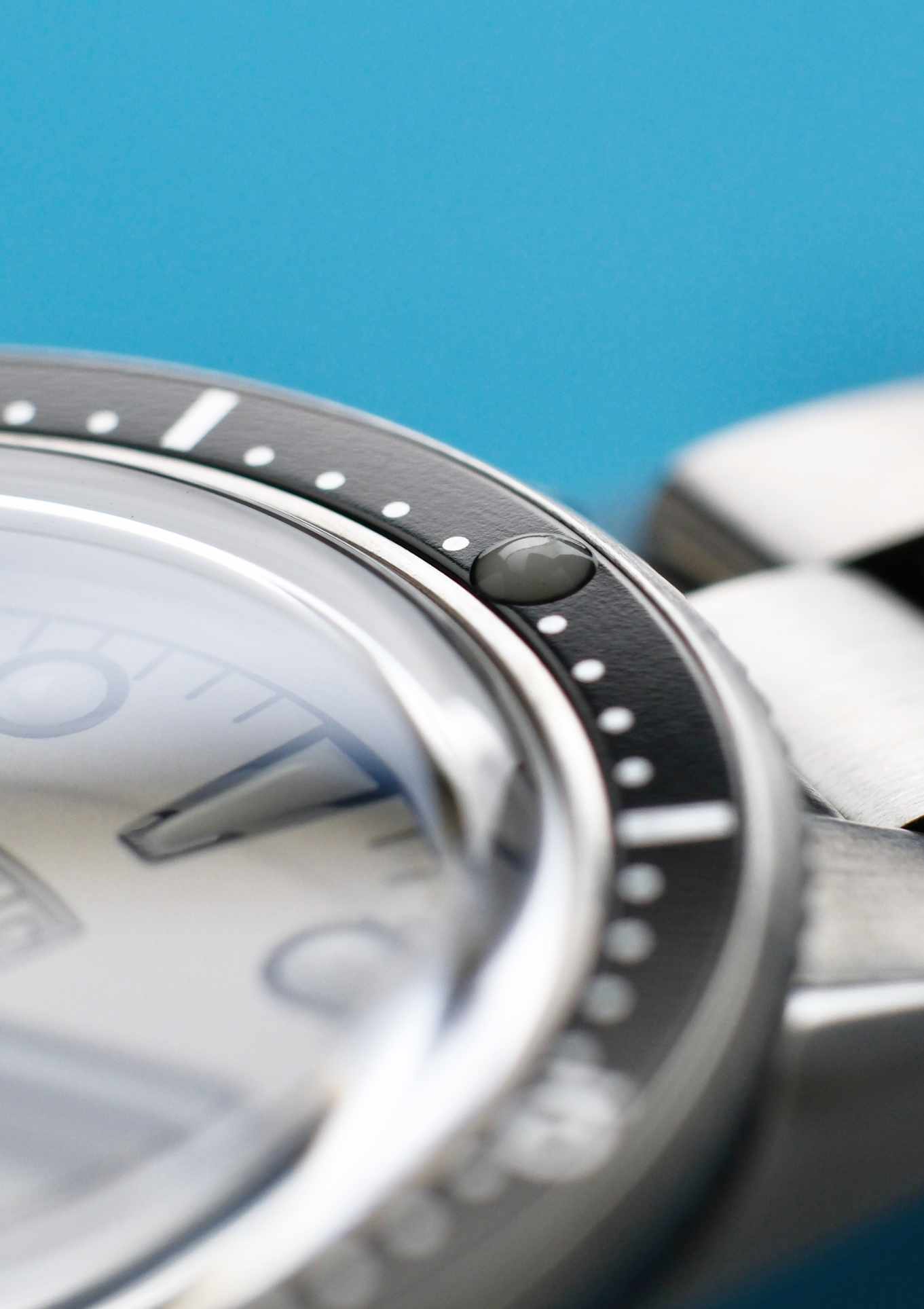 - Doppelt gewölbtes, kratzfestes Saphirglas mit innen doppelter Entspiegelung