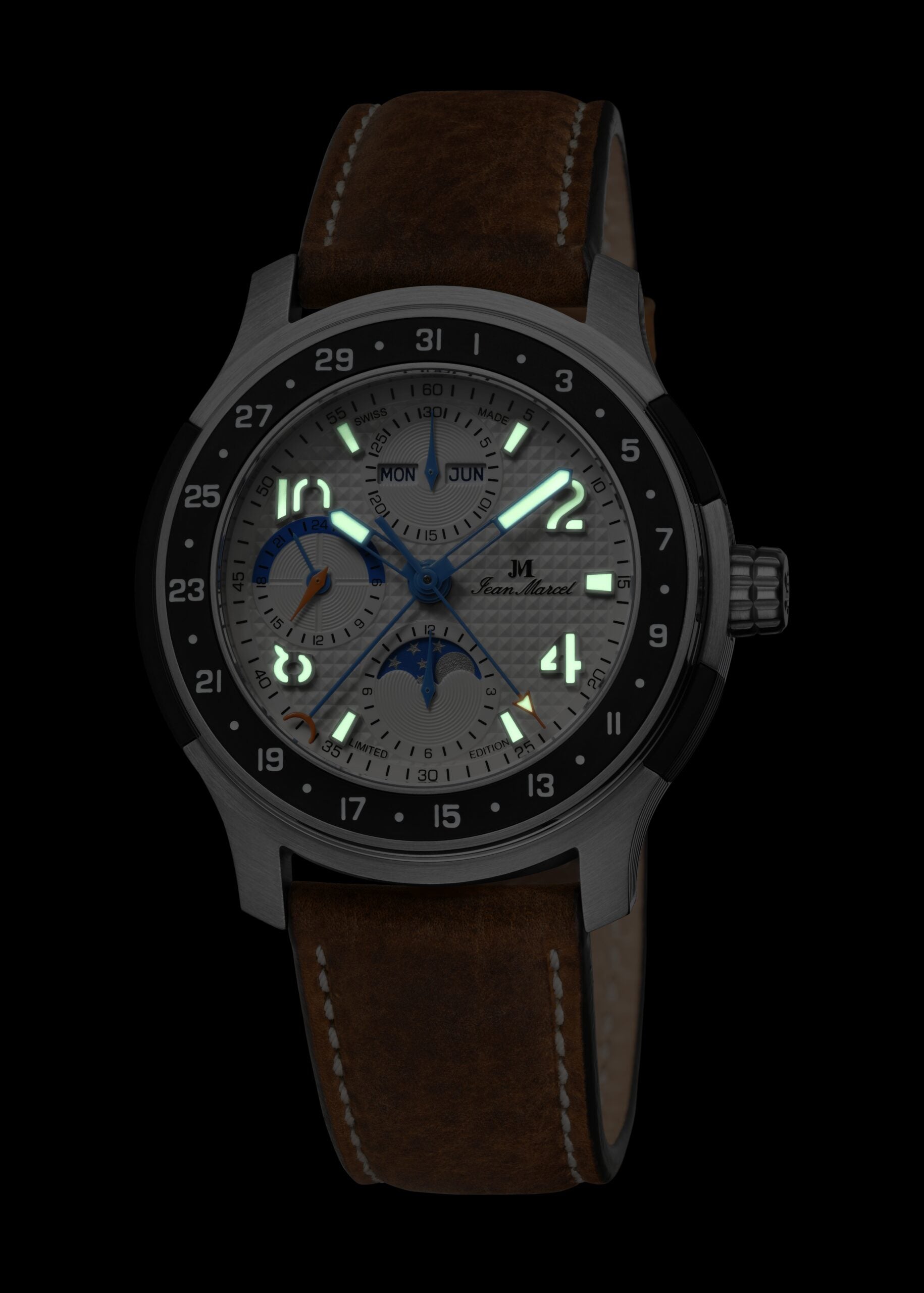 JEAN MARCEL watches stand out from uninspired off-the-shelf products. Patents for exceptionally positioned date and day apertures, telemetry indicators on the opposite side of the central stop-second hand, and the secret signature on the anti-reflective coating, which becomes visible through gentle breathing on the sapphire crystal, make Jean Marcel watches so special.