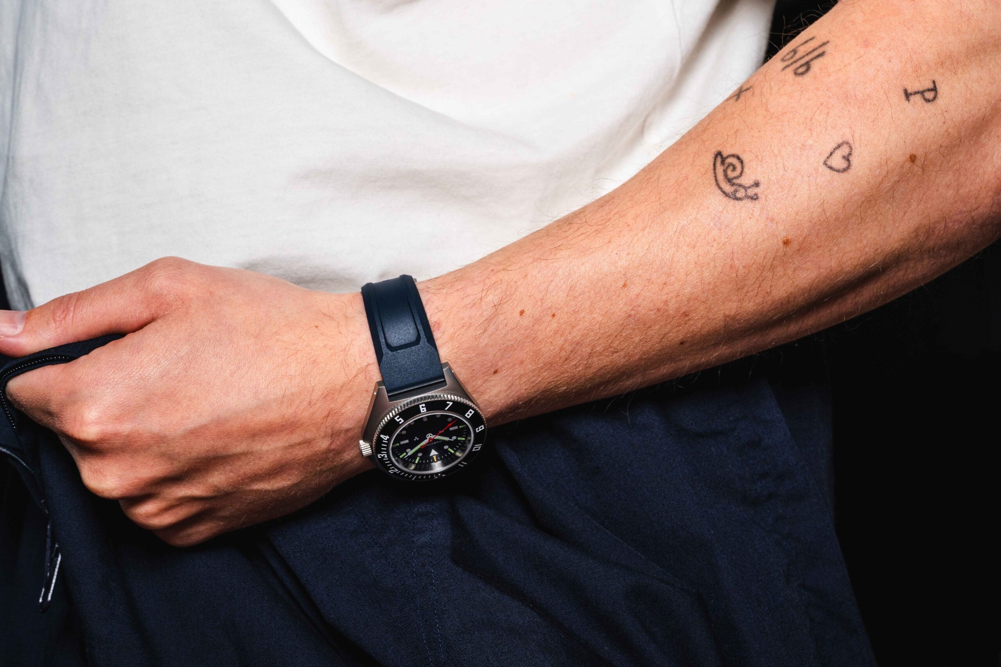 A robust tool watch that is a revised version of Marathon's Steel Navigator, developed in 1986 in collaboration with Kelly Air Force Base.