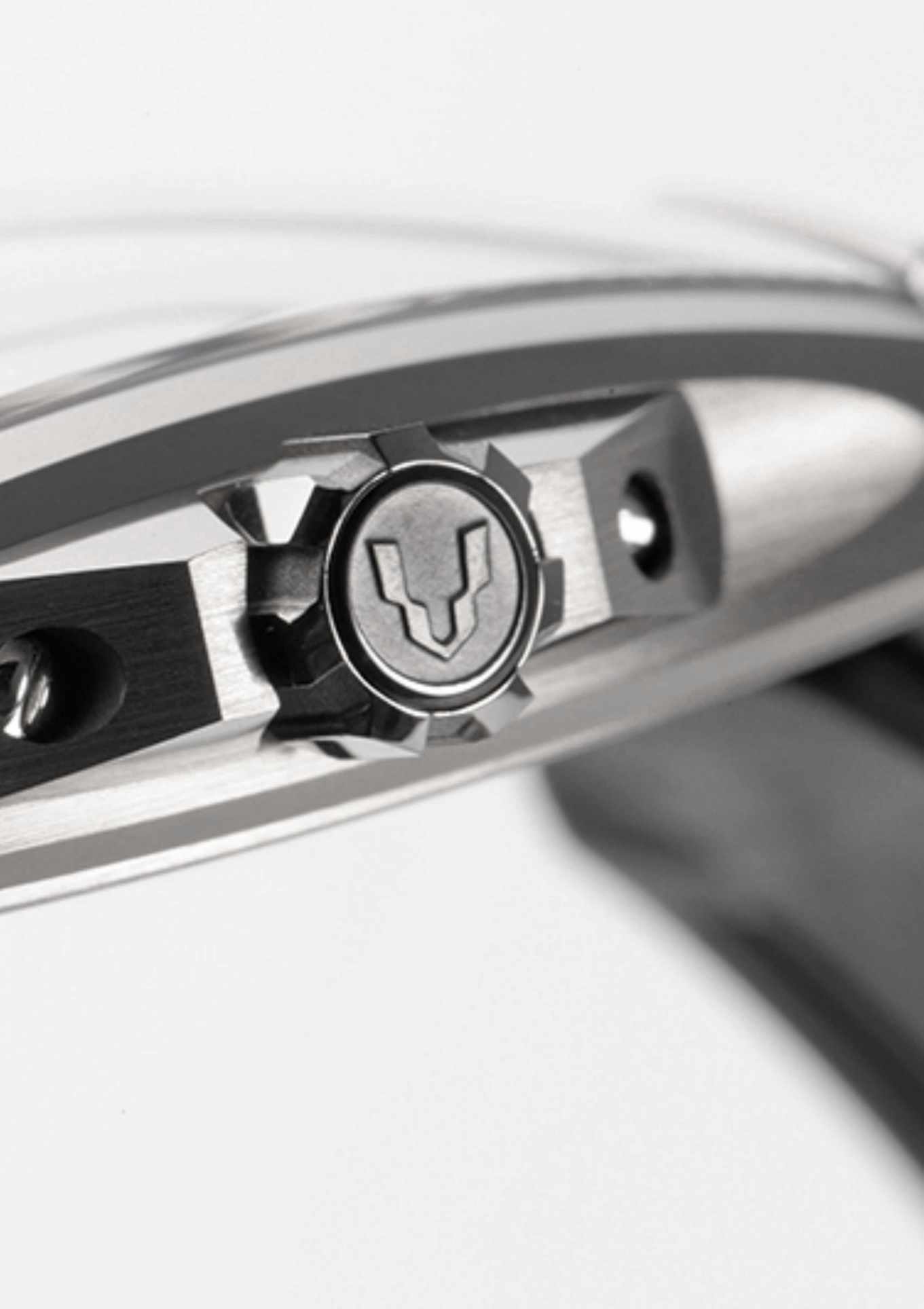 - Die elegante Vertiefung in der Seite des Gehäuses verleiht der HORIZON ein unverwechselbares, anmutiges Aussehen