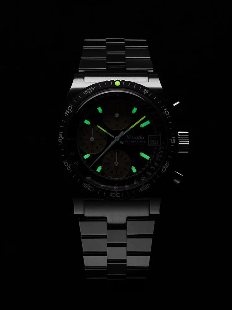 • Schweizer SuperLuminova auf Zeigern, Indexen und Lünette