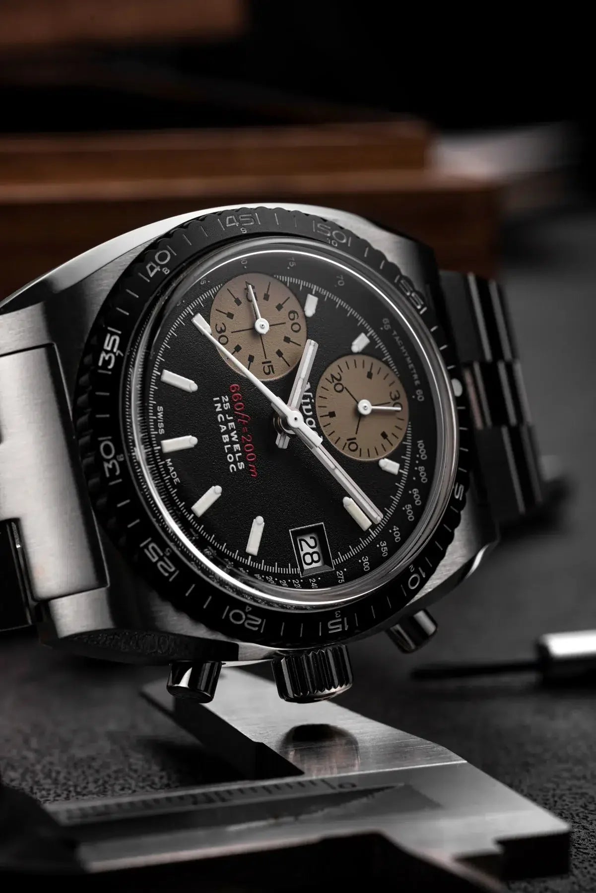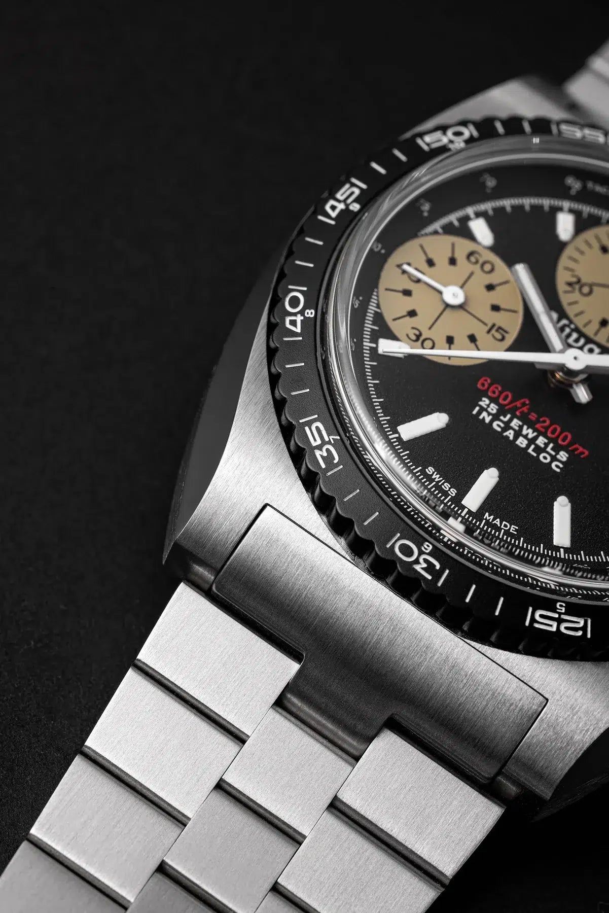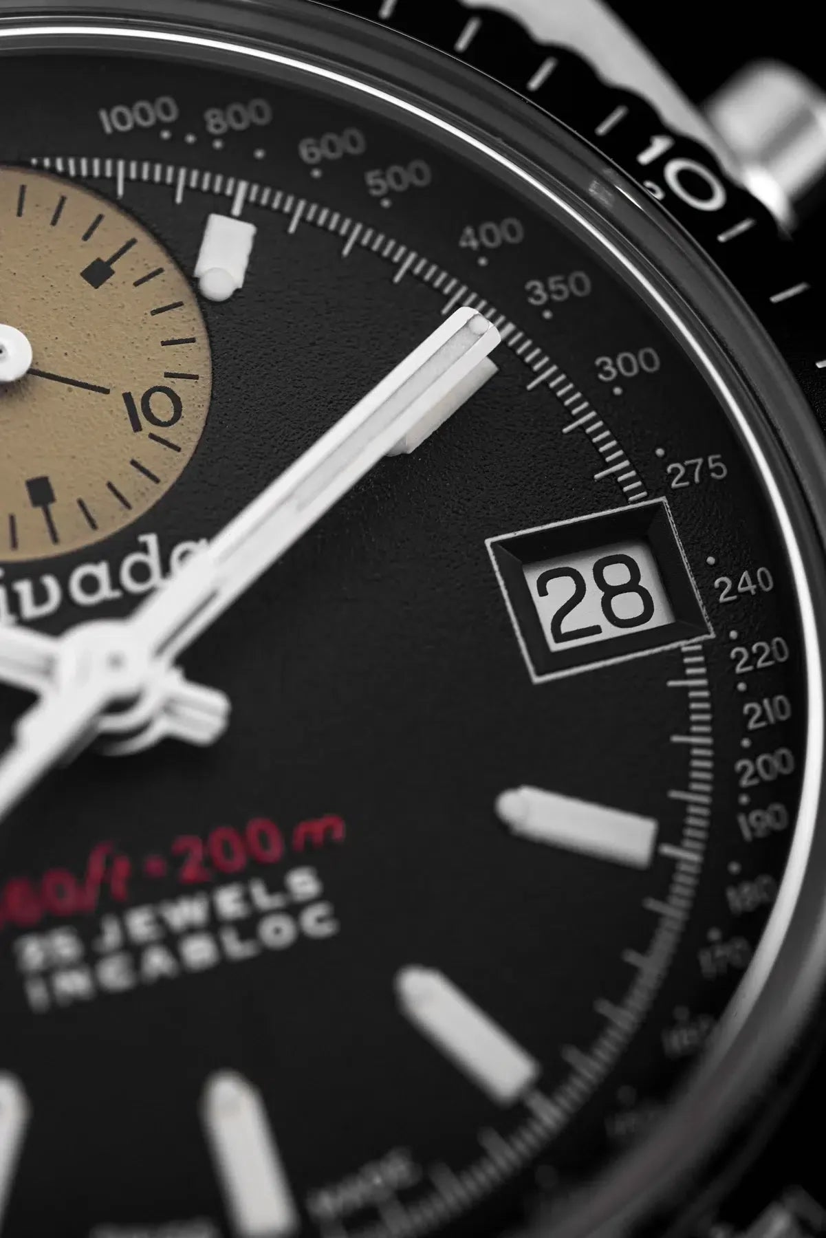 • Schweizer SuperLuminova auf Zeigern, Indexen und Lünette