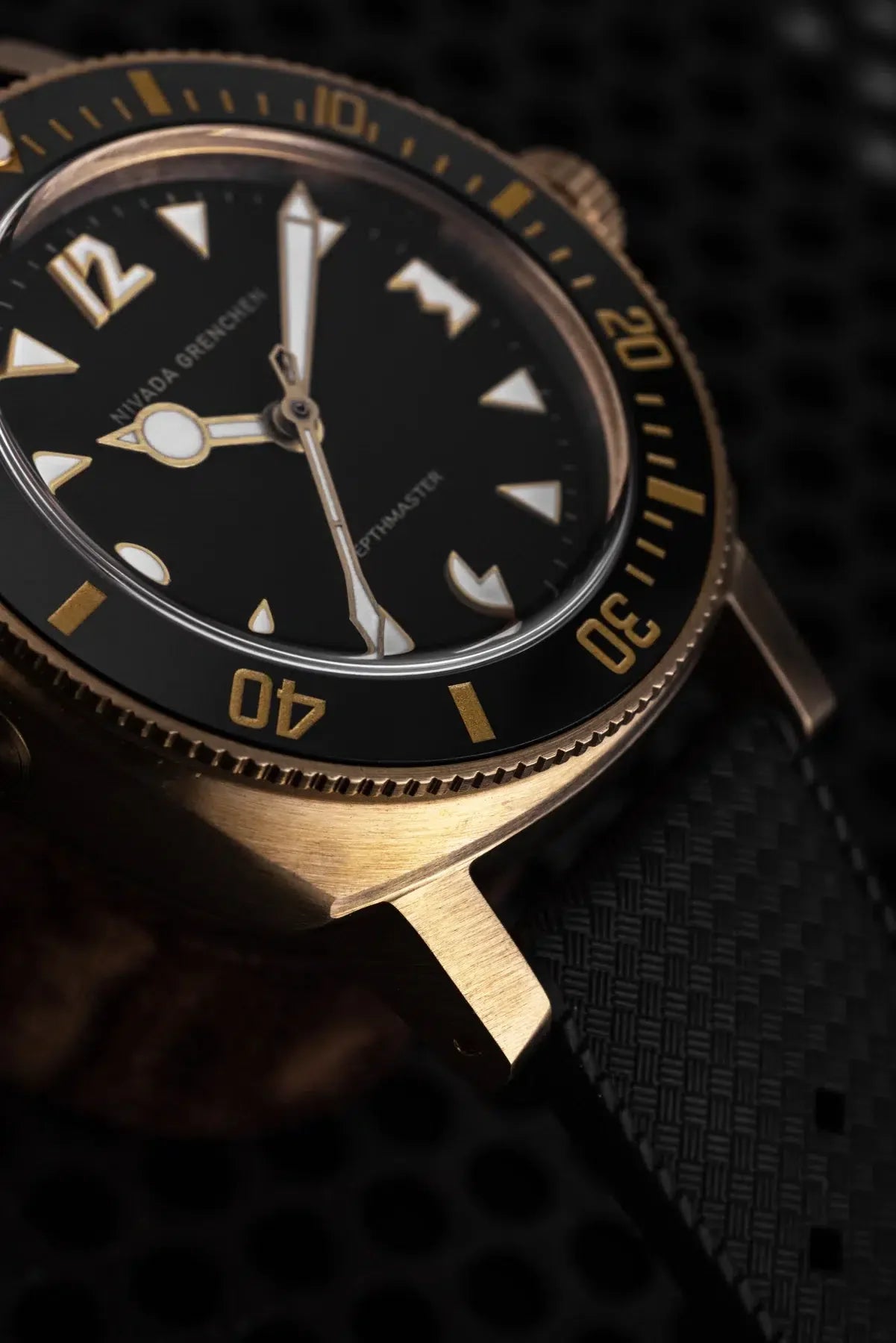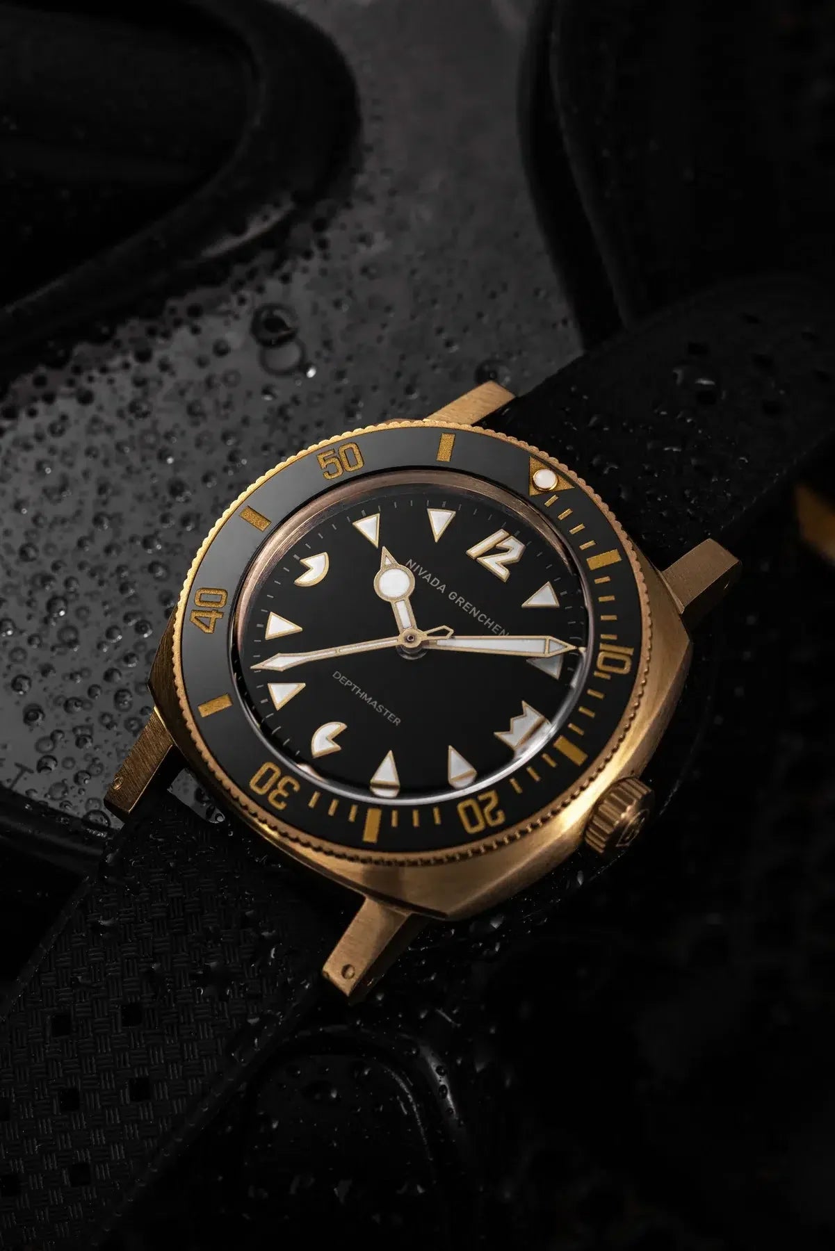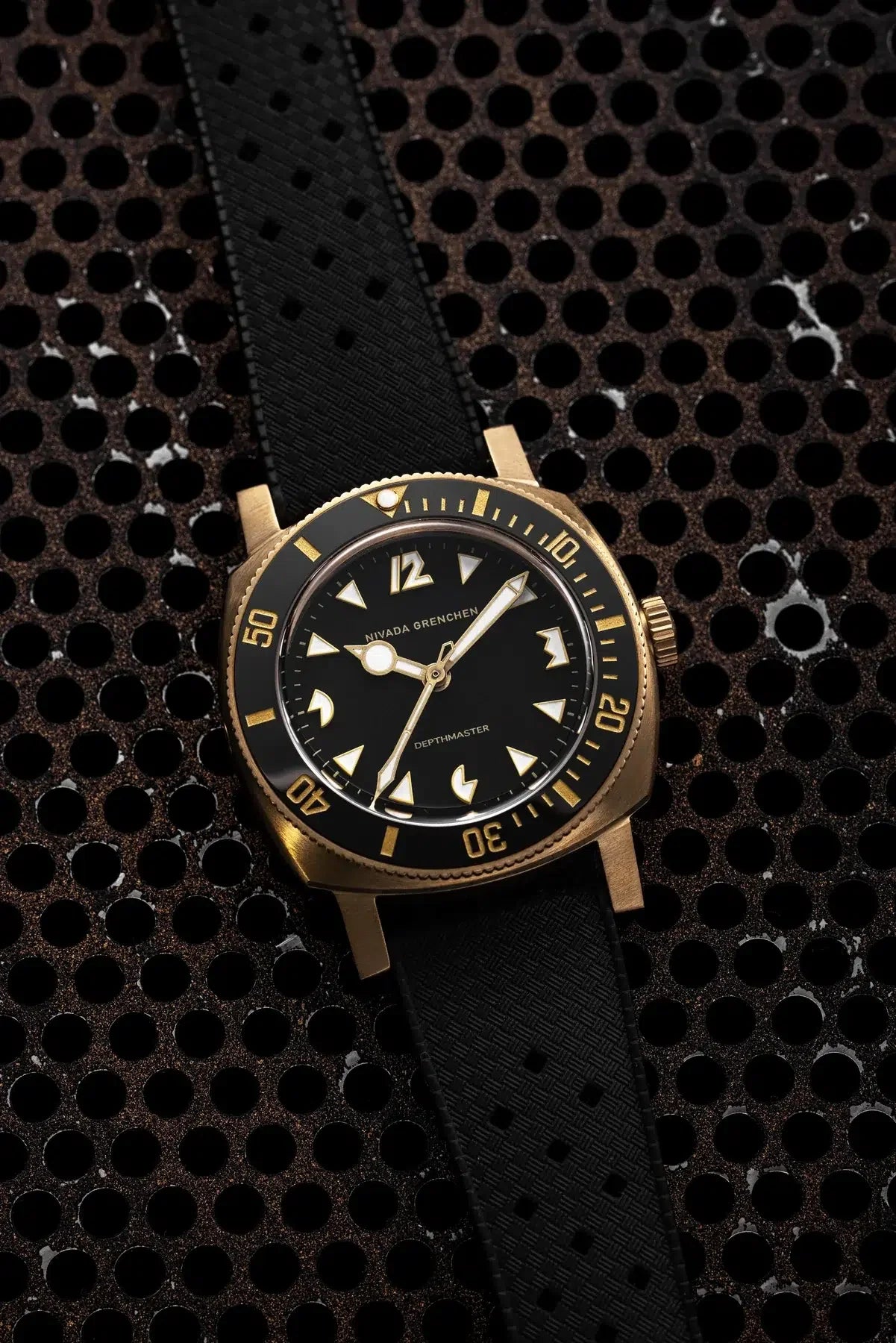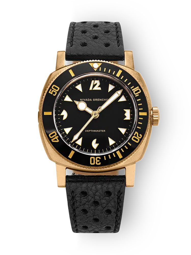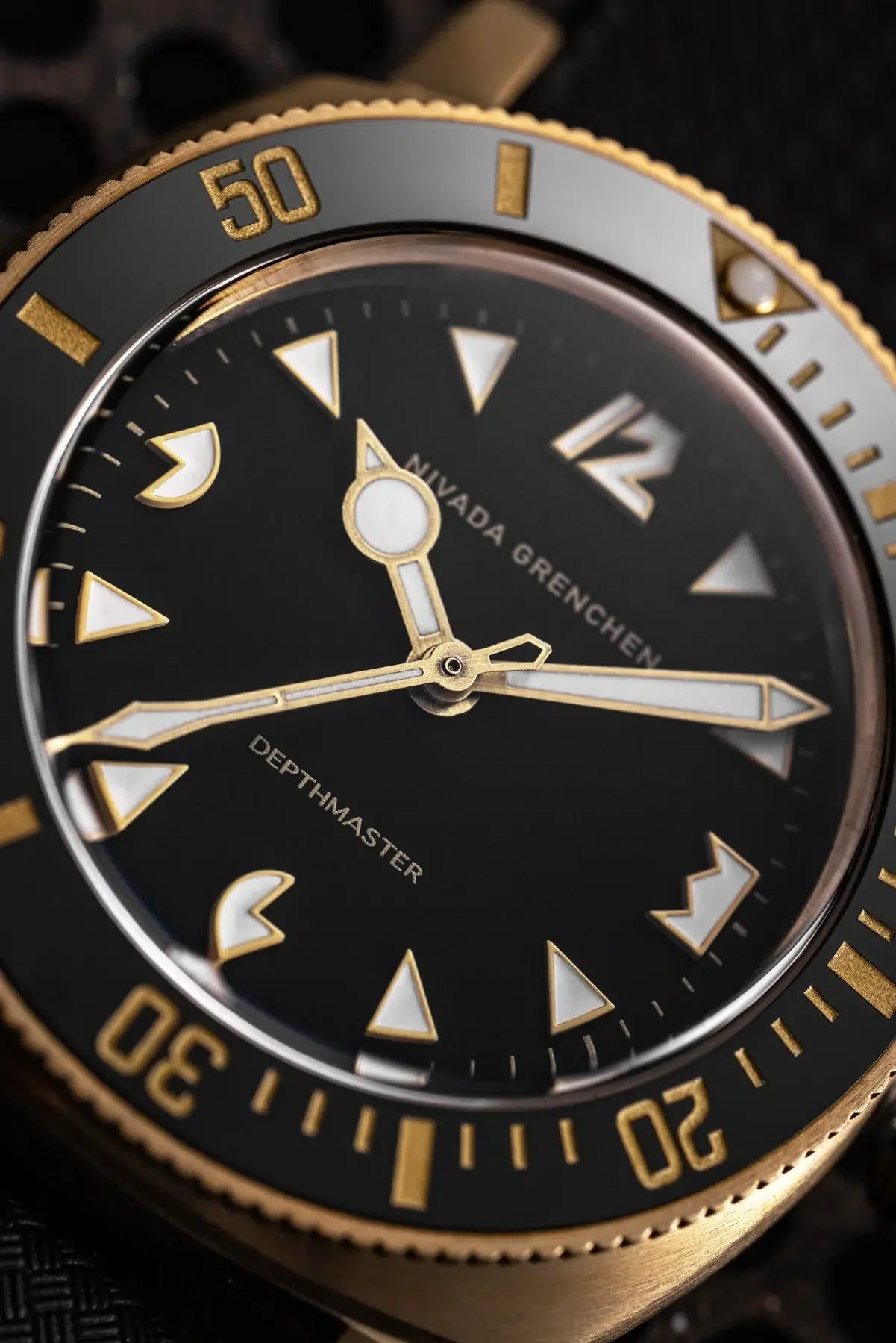 In 1964, Nivada Grenchen launched another groundbreaking timepiece—this time a diving watch called the Depthomatic. It was the first diving watch with a depth indicator, a bathymeter. A year later, another diving timepiece was introduced, the Depthmaster—a diving watch that could withstand a pressure of 100 ATM (1,000 meters).
