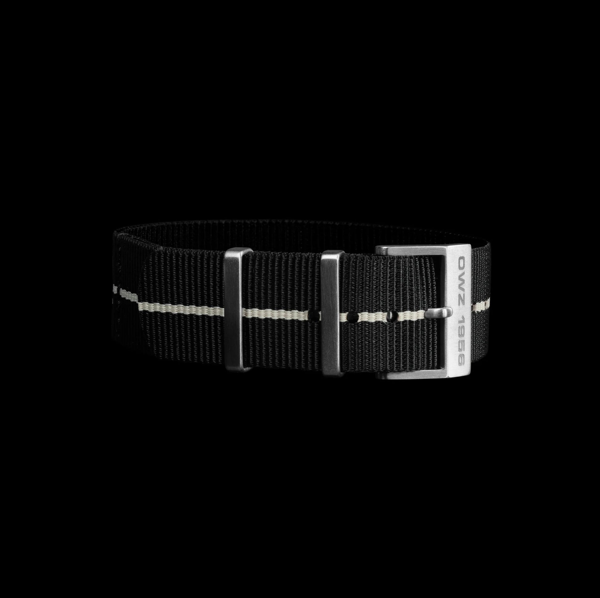 Nylonband mit Dornschließe aus gebürstetem Edelstahl und ‚OWZ 1956‘ Gravur - Stahlband “Beads of Rice” (optional)