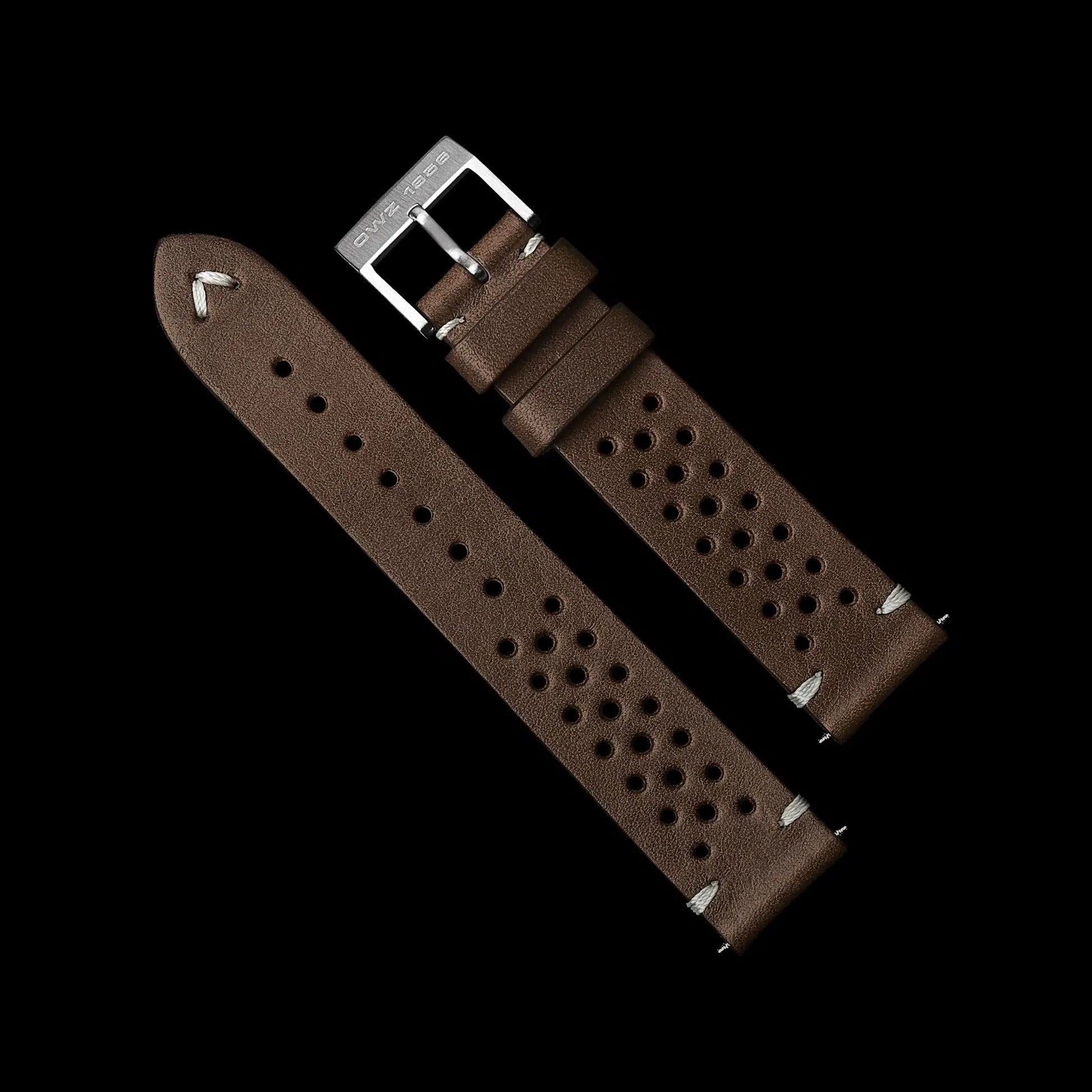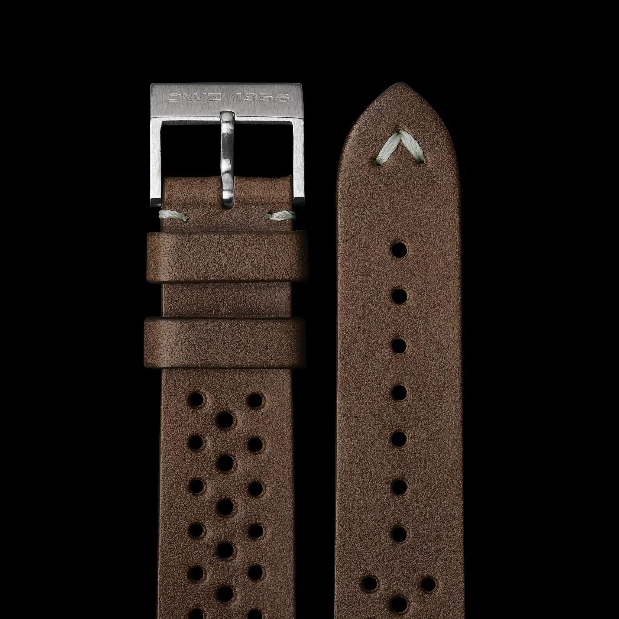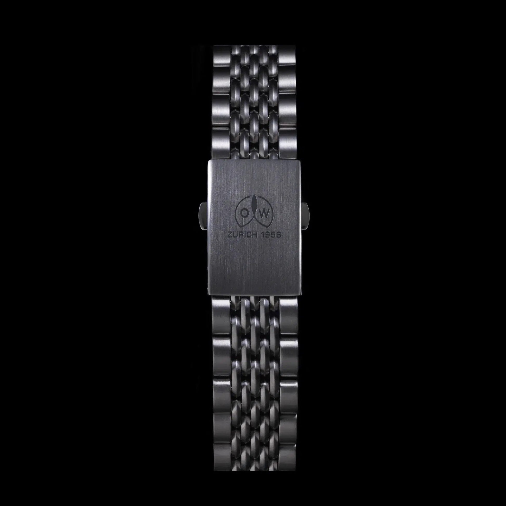 Italienisches Leder mit einer Dornschließe aus gebürstetem Edelstahl und ‚OWZ 1956‘ Gravur - Stahlband "Beads of Rice" (optional)