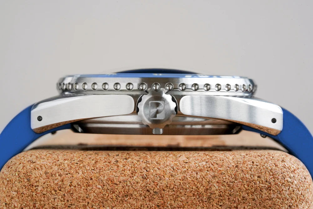 Named after the Scottish Gaelic word for "from the sea," the Mara combines technical expertise with the playful, unmistakable Paulin aesthetic while maintaining excellent legibility. The lacquered dial is complemented by a double-domed sapphire crystal. sapphire crystal Protected with a triple anti-reflective coating, the watch offers a diving depth of up to 300 meters. The dial is framed by a domed sapphire bezel, the underside of which is Swiss-made. Super-LumiNova® is coated.