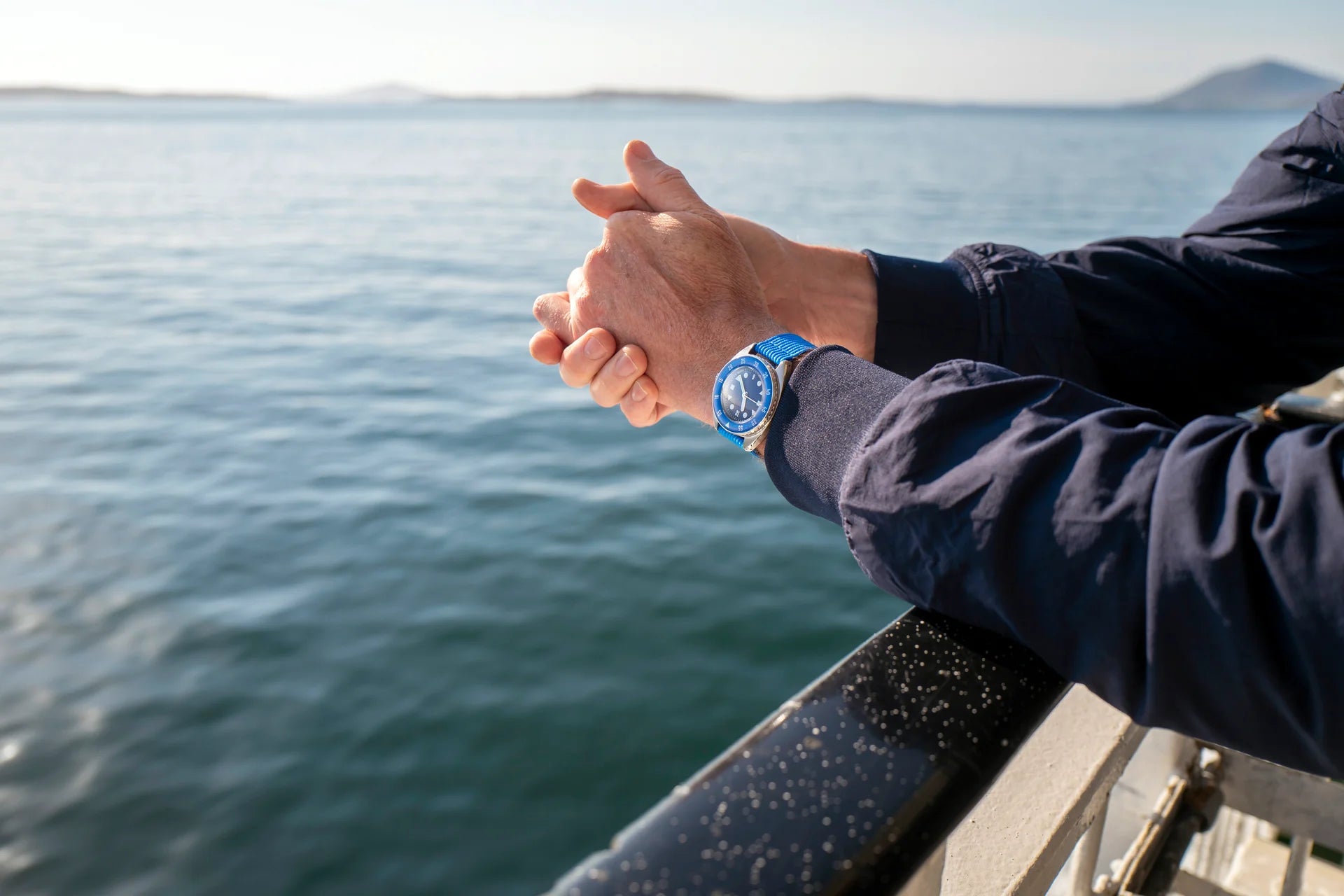 - Zusätzliches, blaues Stoffarmband aus recycelten Fischernetzen, Innenseite mit italienischem Alcantara-Kunstwildleder
