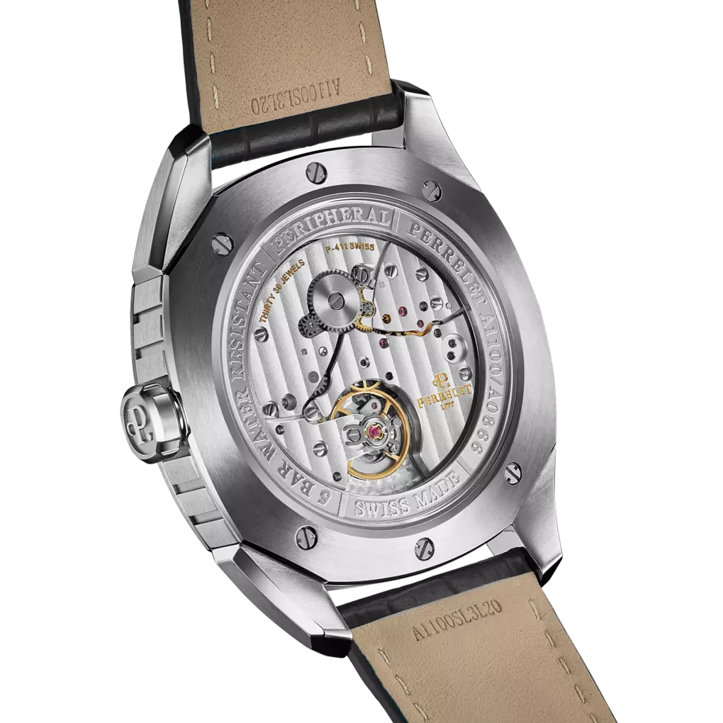 Die Perrelet Lab Peripheral A1100 ist eine Schweizer Luxus-Automatikuhr für Herren, die technische Innovation sichtbar macht. Herzstück ist der außergewöhnliche Peripherrotor, der am äußeren Rand des Uhrwerks läuft und dem Design eine moderne, architektonische Tiefe verleiht.