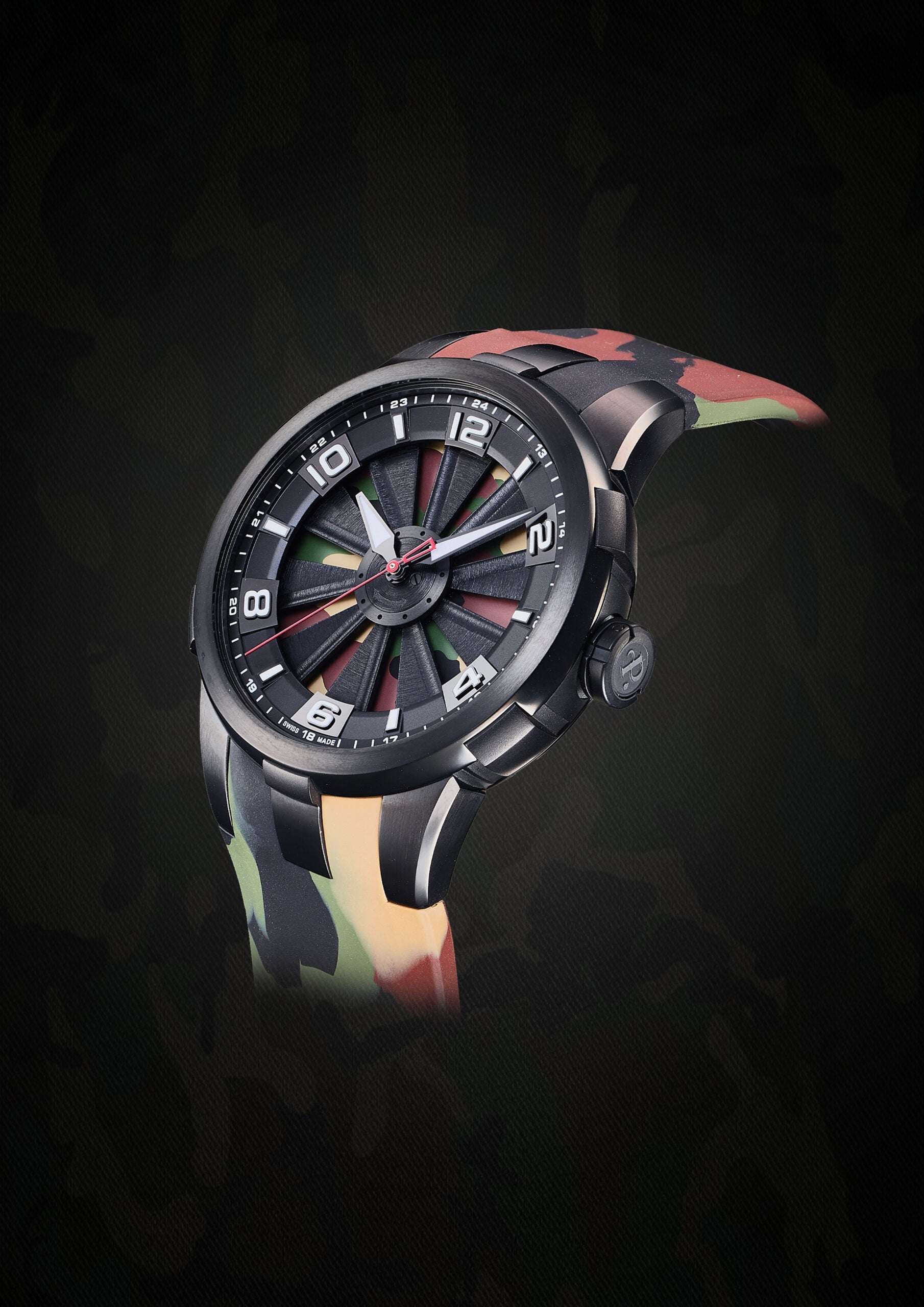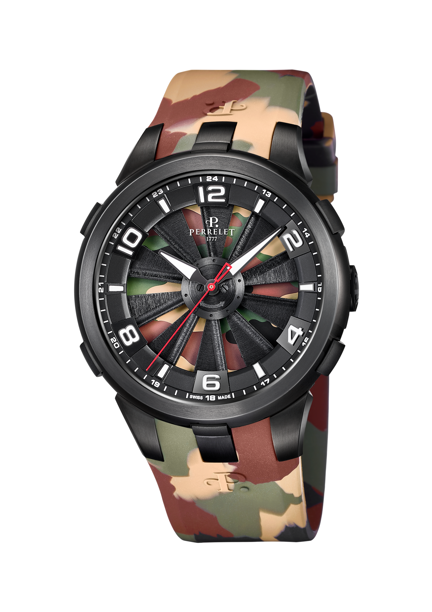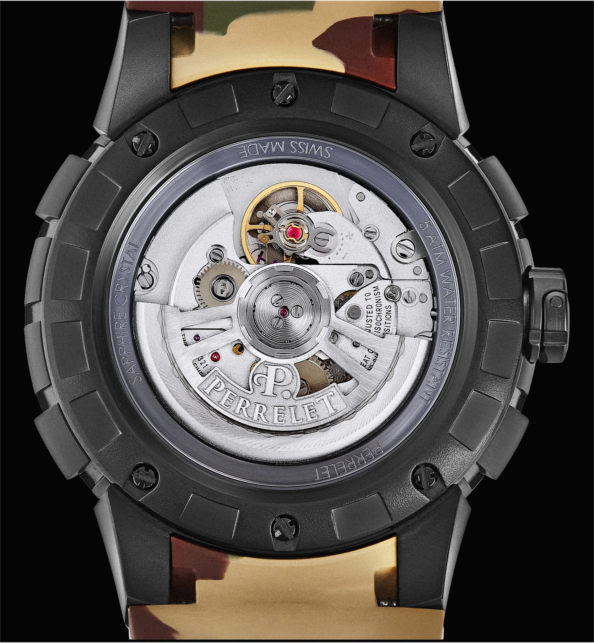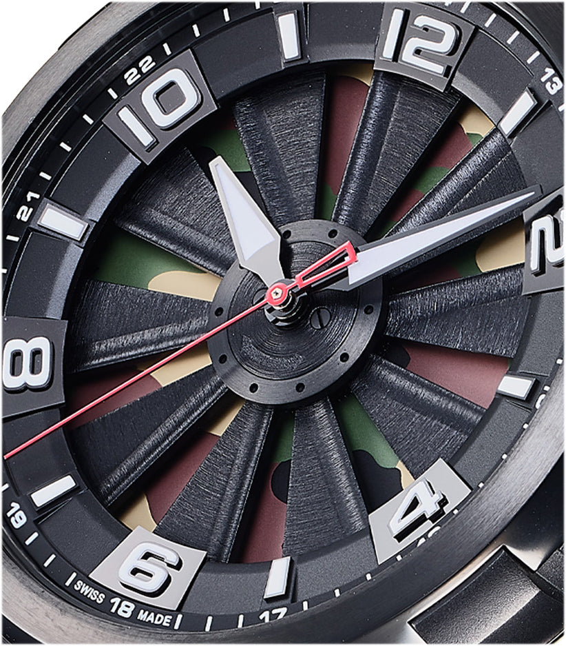 - The 44 mm stainless steel case with black PVD coating houses a 10-blade turbine