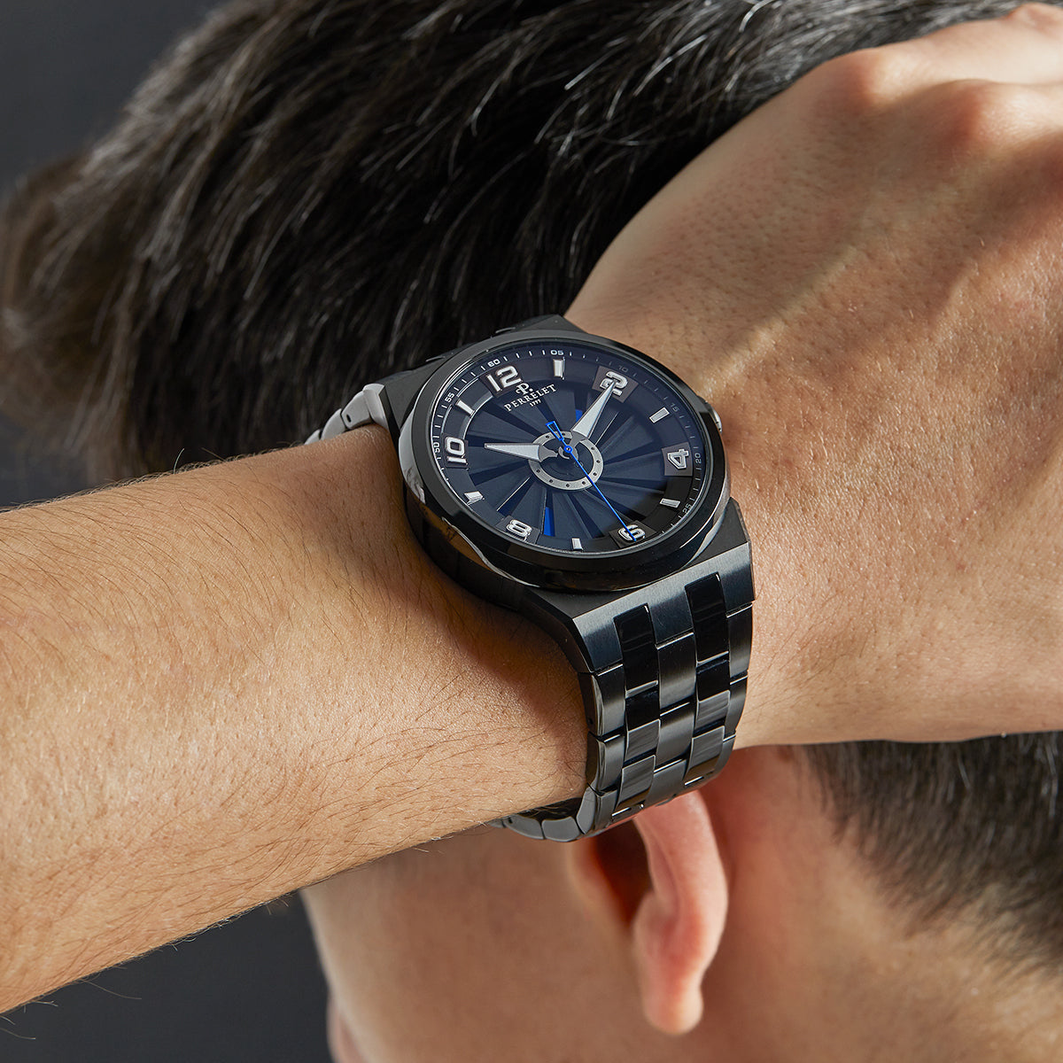 - Blaues Zifferblatt sichtbar durch die Turbine durch Handgelenksbewegung