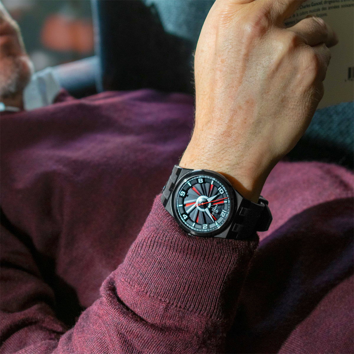 - Rotes Zifferblatt sichtbar durch die Turbine durch Handgelenksbewegung
