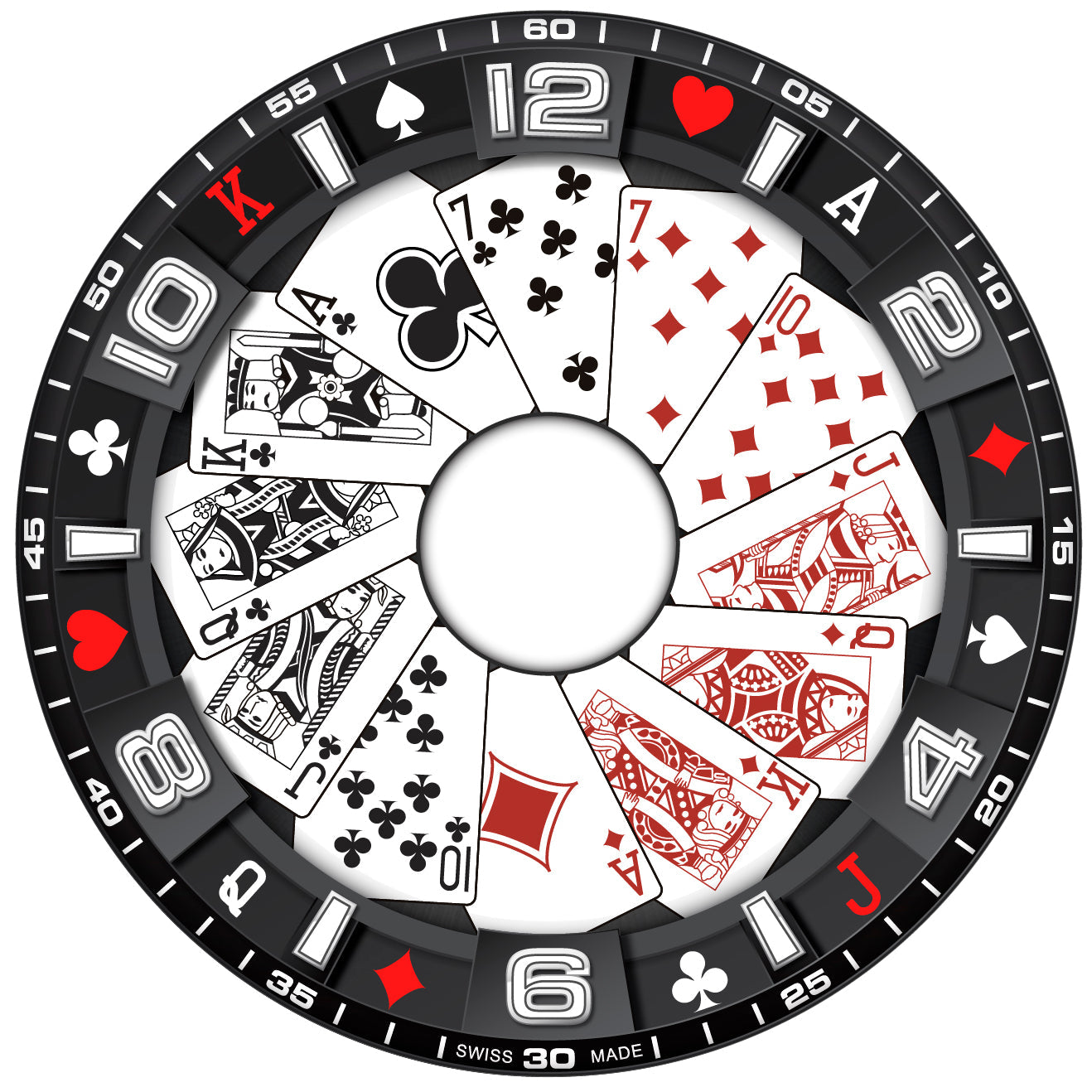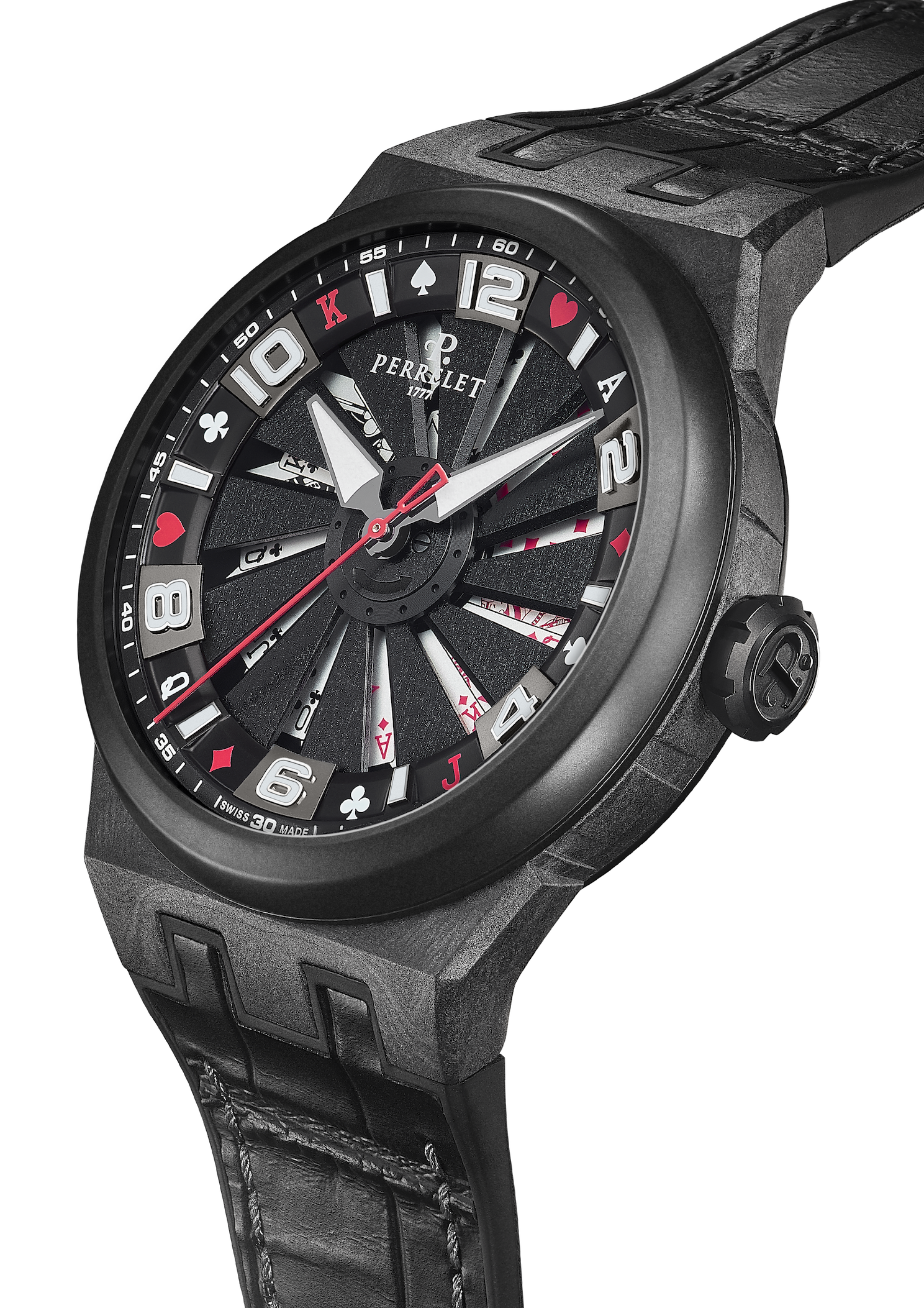 - offers a visual spectacle on the dial with every movement of the hand, revealing a royal flush.