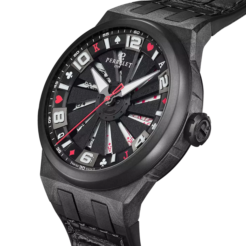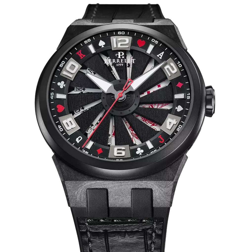 Bei dieser limitierten Sonderedition der Perrelet Turbine geben die schwarzen Rotorblätter ein Zifferblatt frei, das bei Bewegung einen Royal Flush enthüllt - eine Hommage an Kartenspiele und ein unvergesslicher optischer Eindruck.