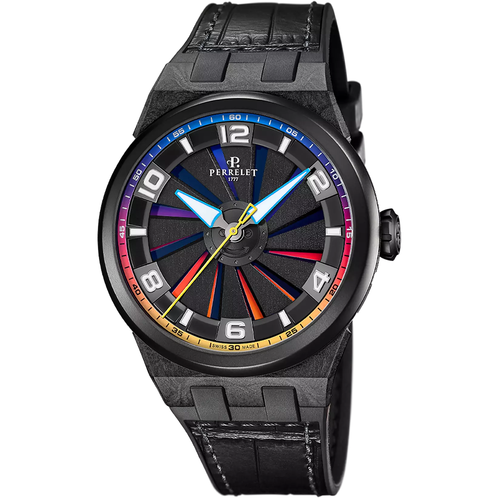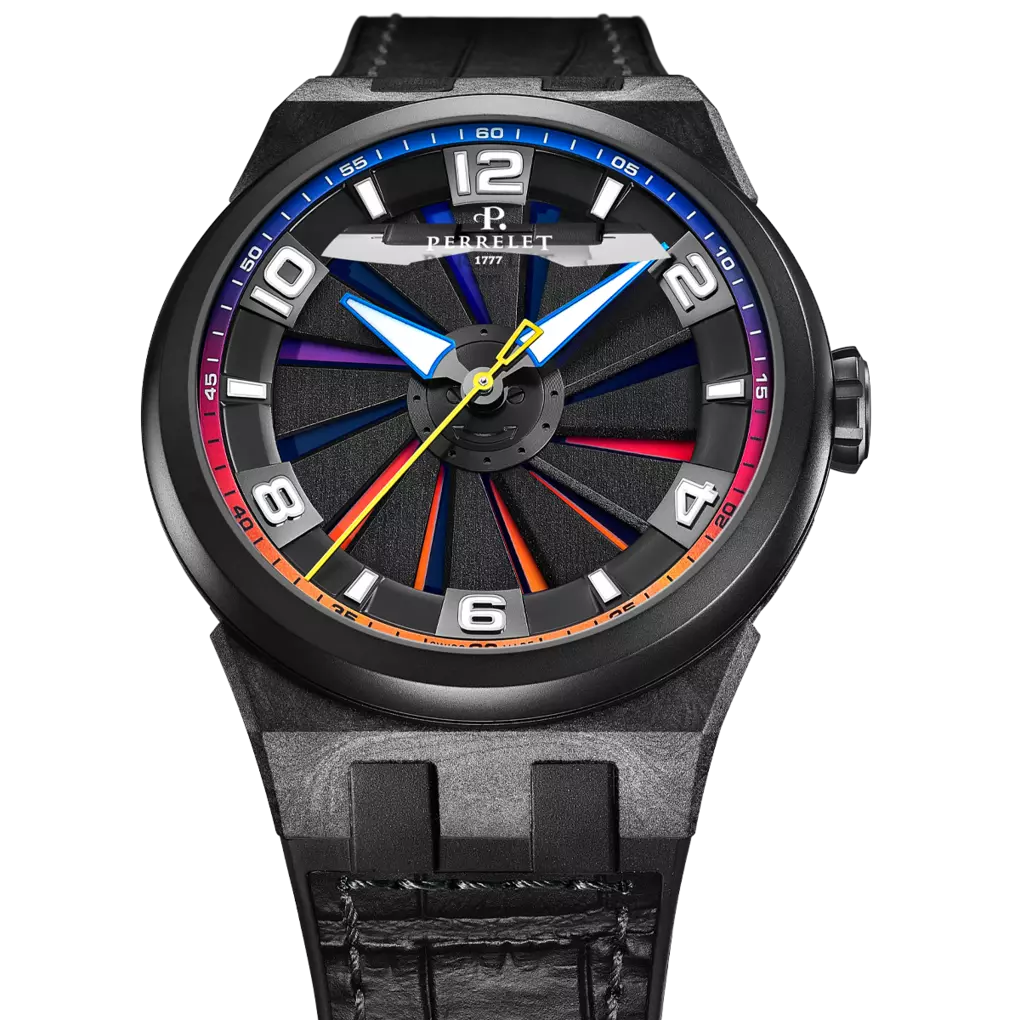 Die Perrelet Turbine ist eine außergewöhnliche Schweizer Automatikuhr für Herren mit dem charakteristischen Turbinen-Design der Marke. Zwölf frei rotierende Rotorblätter reagieren auf jede Bewegung des Handgelenks und erzeugen ein faszinierendes Wechselspiel zwischen Mechanik und Zifferblattmotiv. Dieser dynamische Effekt macht die Turbine zu einer der markantesten Uhren der modernen Uhrmacherei.
