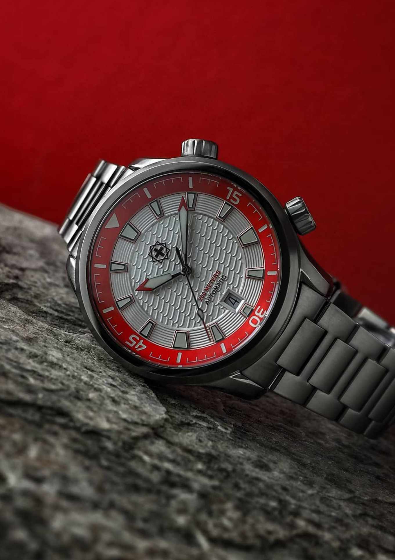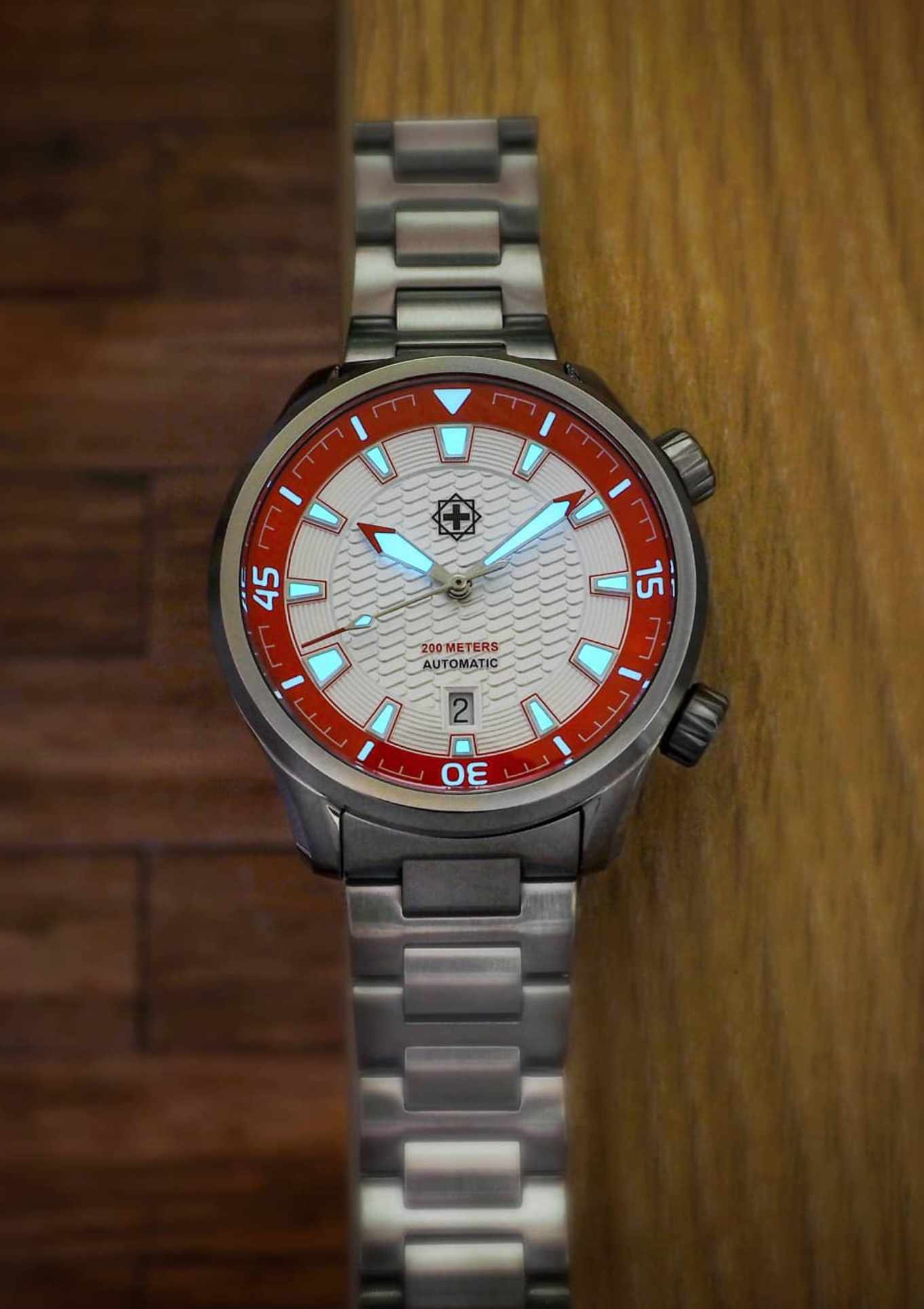 - Schweizer Super-LumiNova® BGW9 auf Zeigern, Innenlünette und Indizes