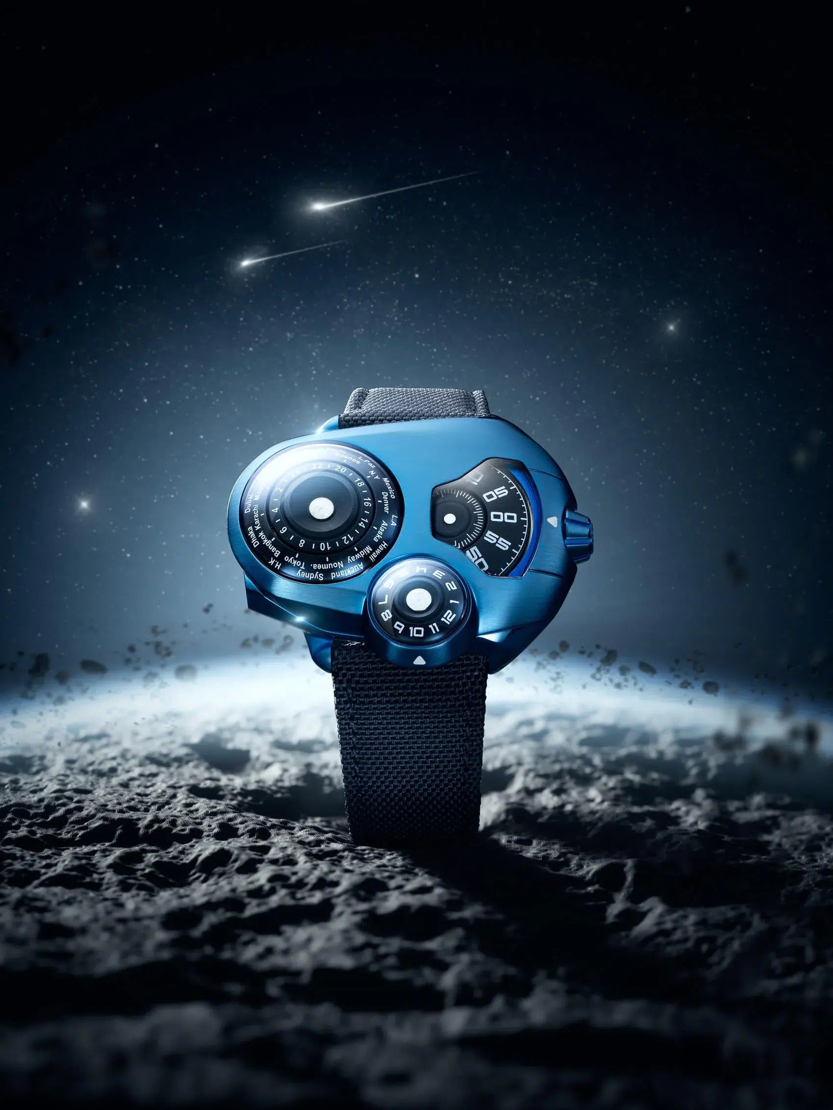 The SpaceOne WorldTimer Blue takes a radically different approach to conventional watches by replacing the classic hands with a system of rotating discs. This design consists of four key elements: a minute indicator at 3 o'clock, a central seconds indicator, a 12-hour indicator at 6 o'clock, and finally, two coaxial discs at 9 o'clock that display the 24-hour time and the corresponding cities.