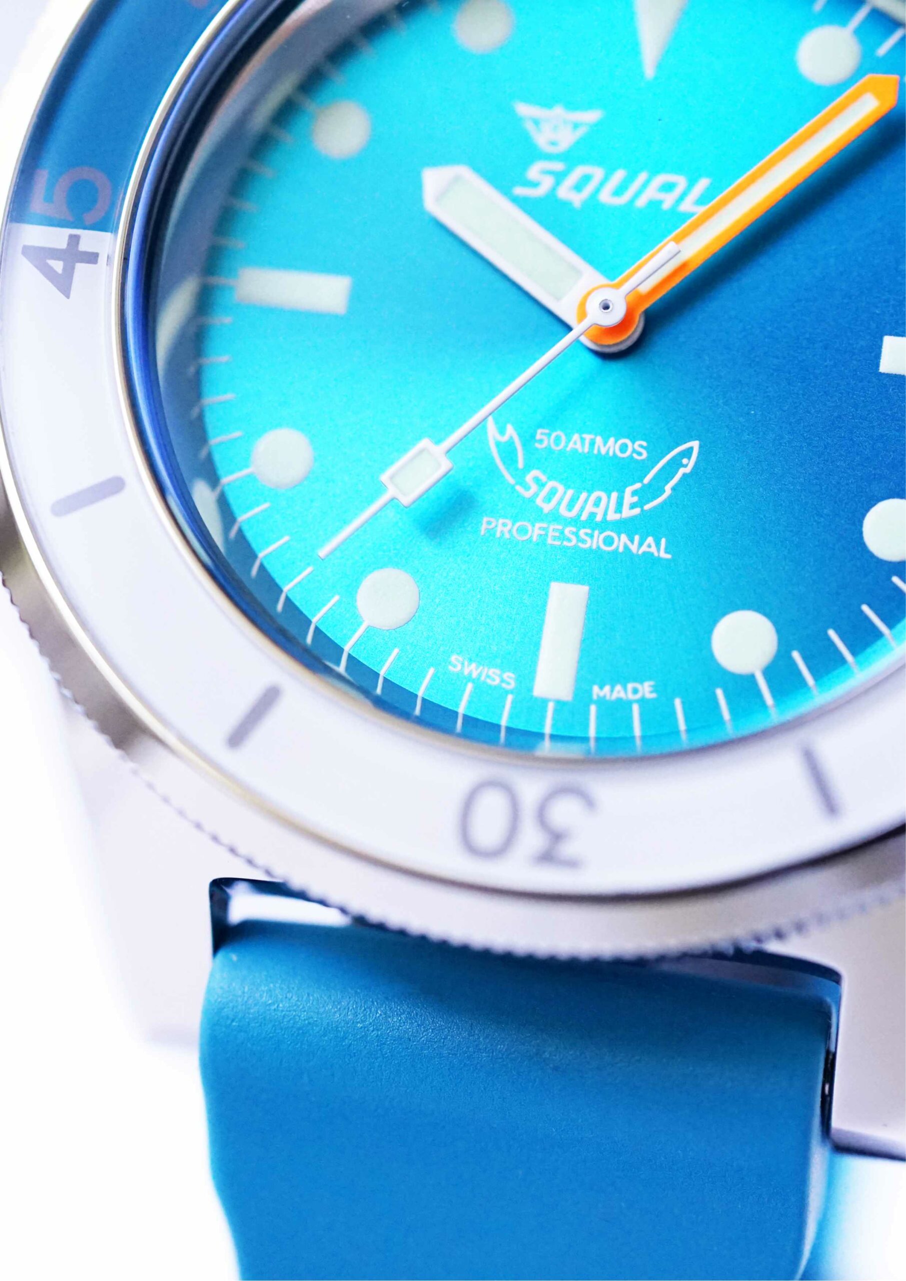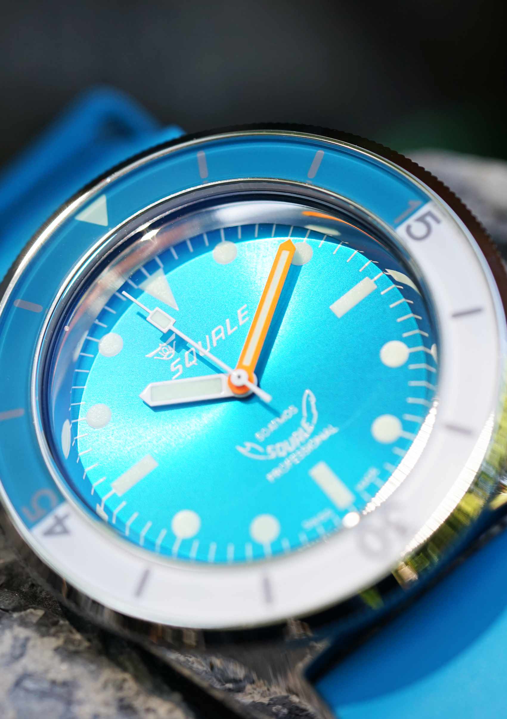 - Zifferblatt in hellem Blau, dem Farbton der Squale Matic XSE nachempfunden, mit Sonnenschliff-Finishing