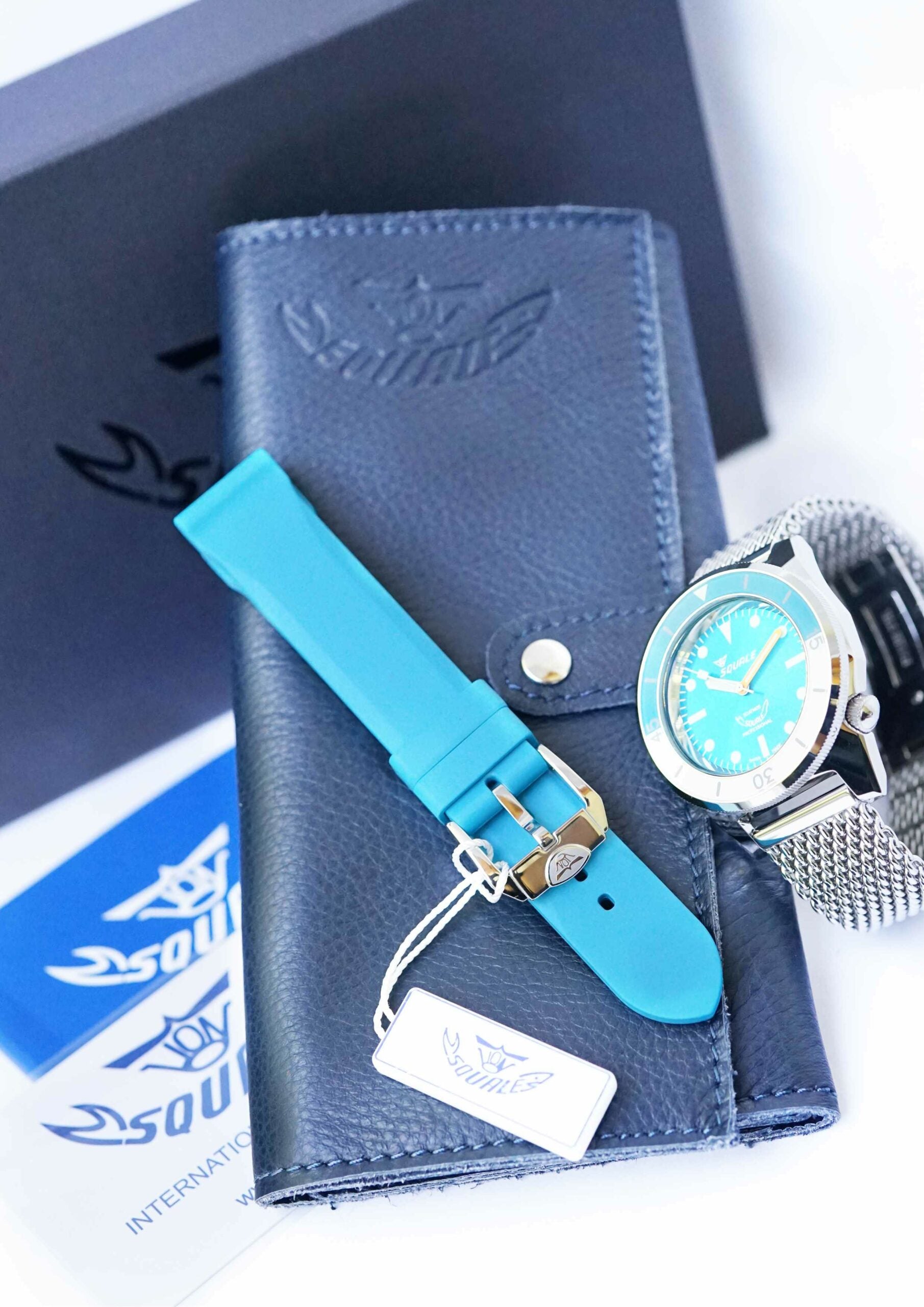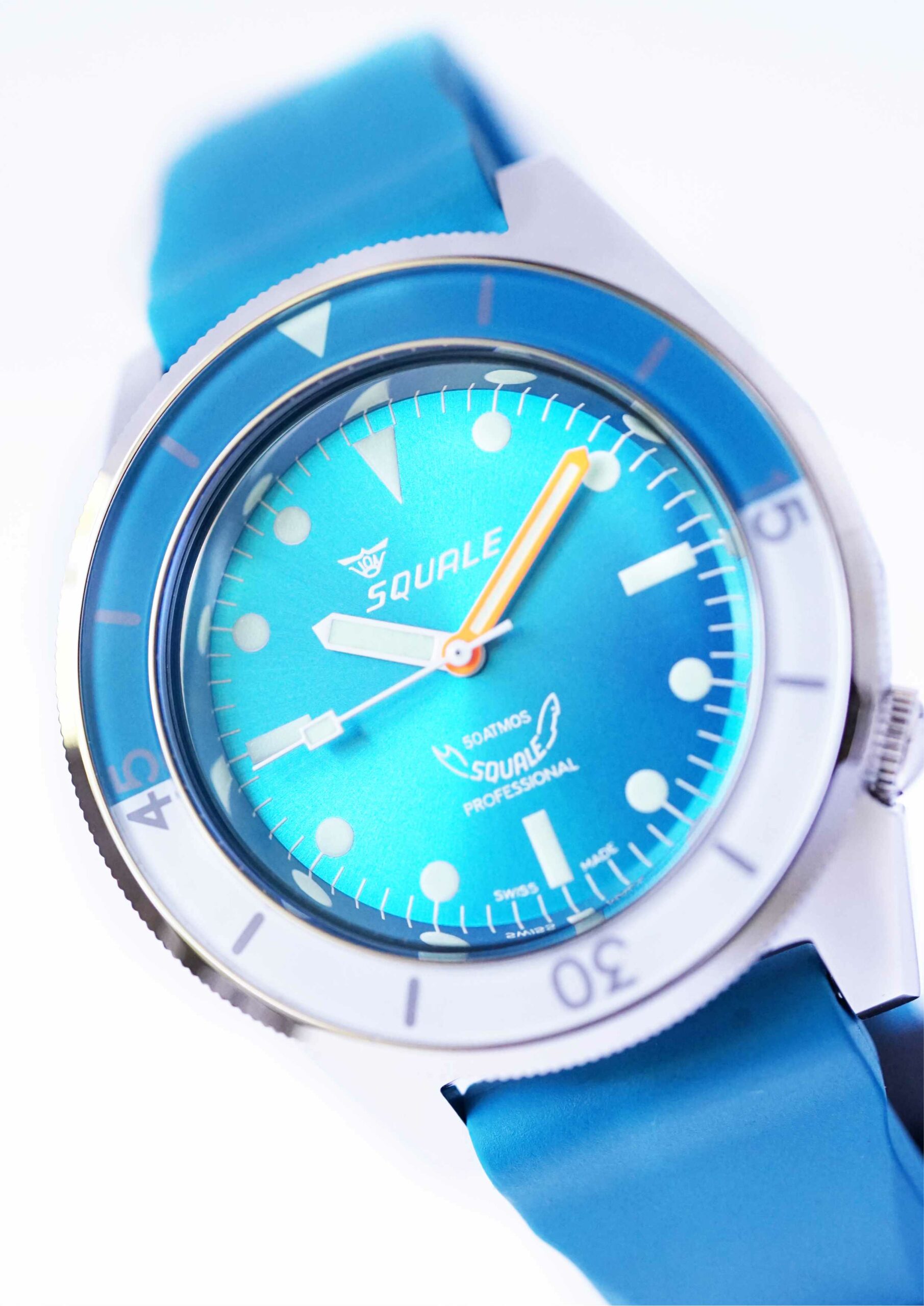 - Farblich auf das Zifferblatt abgestimmtes Bonetto Cinturini Kautschukband mit sandgestrahlter Squale Dornschließe