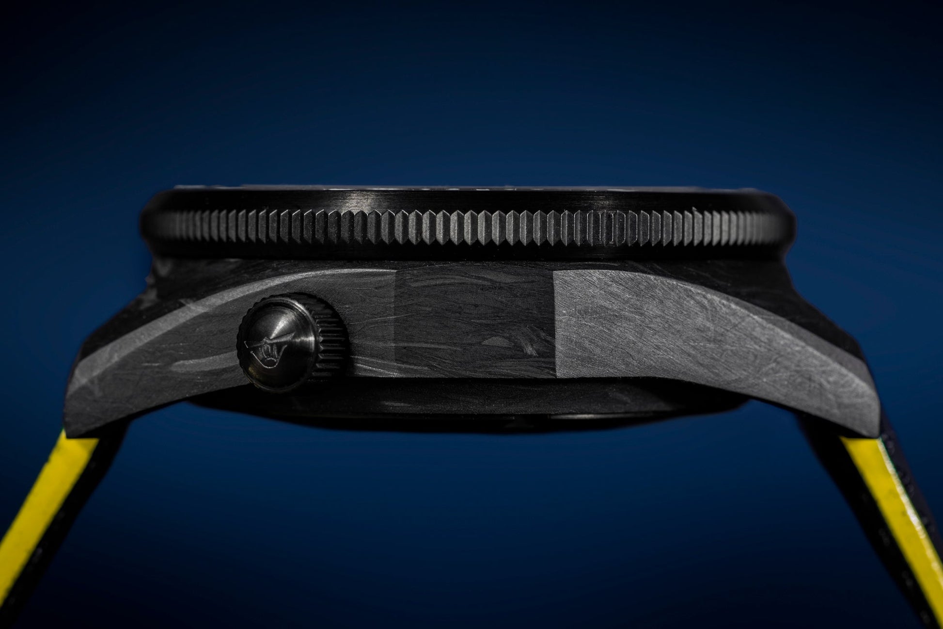 - Gehäuse aus “geschmiedetem” (=forged) Carbon: Geschmiedetes Carbon ist eine Art von Carbonfaser, die unglaublich stark und dennoch leicht ist. Der Begriff “geschmiedet” leitet sich vom Herstellungsprozess ab: Kleine Fragmente von Kohlenstofffasern werden zusammen mit Harz in Formen gelegt, dann komprimiert und bei hoher Temperatur “geschmiedet”. Der melierte Effekt ist ein einzigartiges Merkmal, das aus diesem Prozess resultiert. Die Kohlenstoffflocken werden dabei nach dem Zufallsprinzip angeordnet, wodurch für jedes Teil des Gehäuses einzigartige und unwiederholbare Muster entstehen. Ihre Uhr kann somit ein anderes Muster als das hier abgebildete Modell haben.