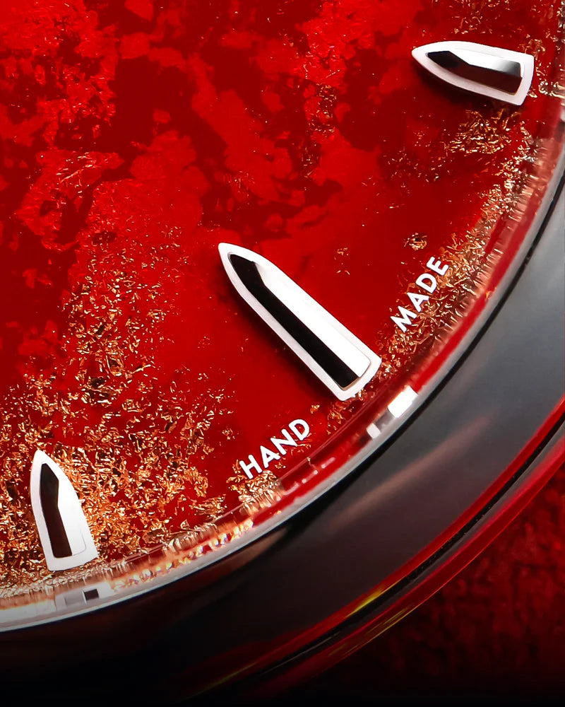 Während sich die Schichten aufbauen, offenbart der Lack sein Wesen: lebendig, ausdrucksstark und sich ständig weiterentwickelnd. Das Zifferblatt gewinnt an Tiefe, Glanz und Charakter und wird buchstäblich zu einer Landschaft der Zeit.