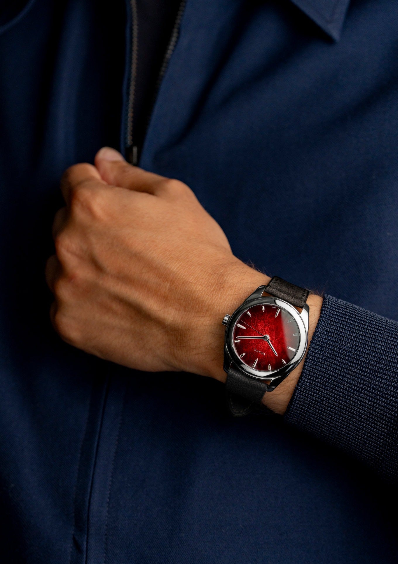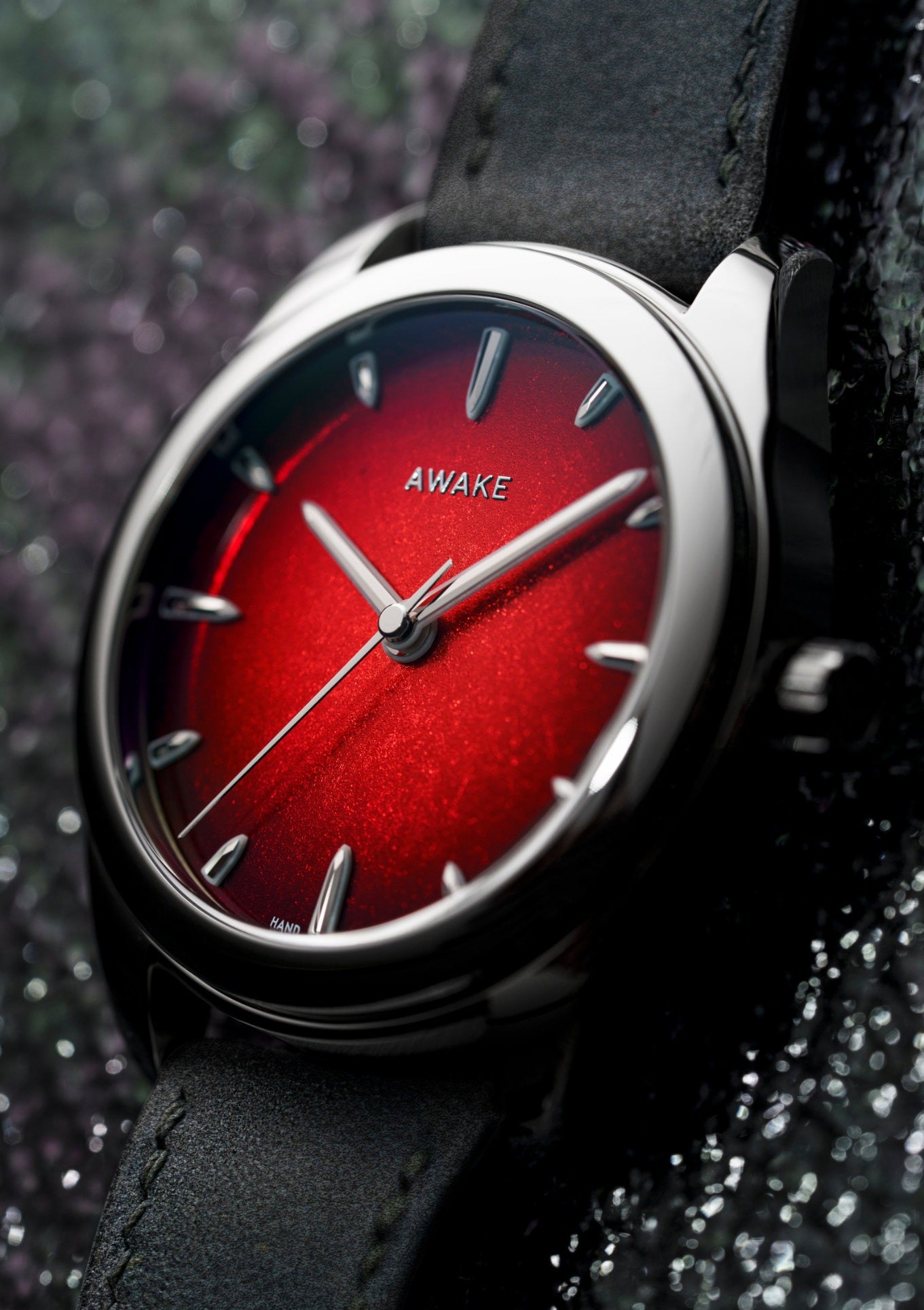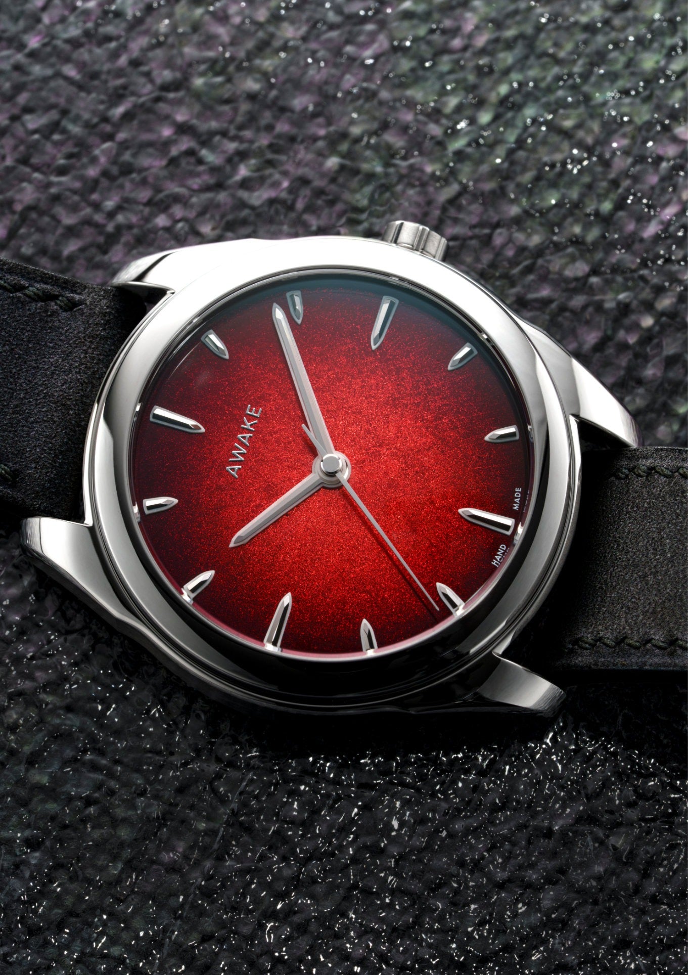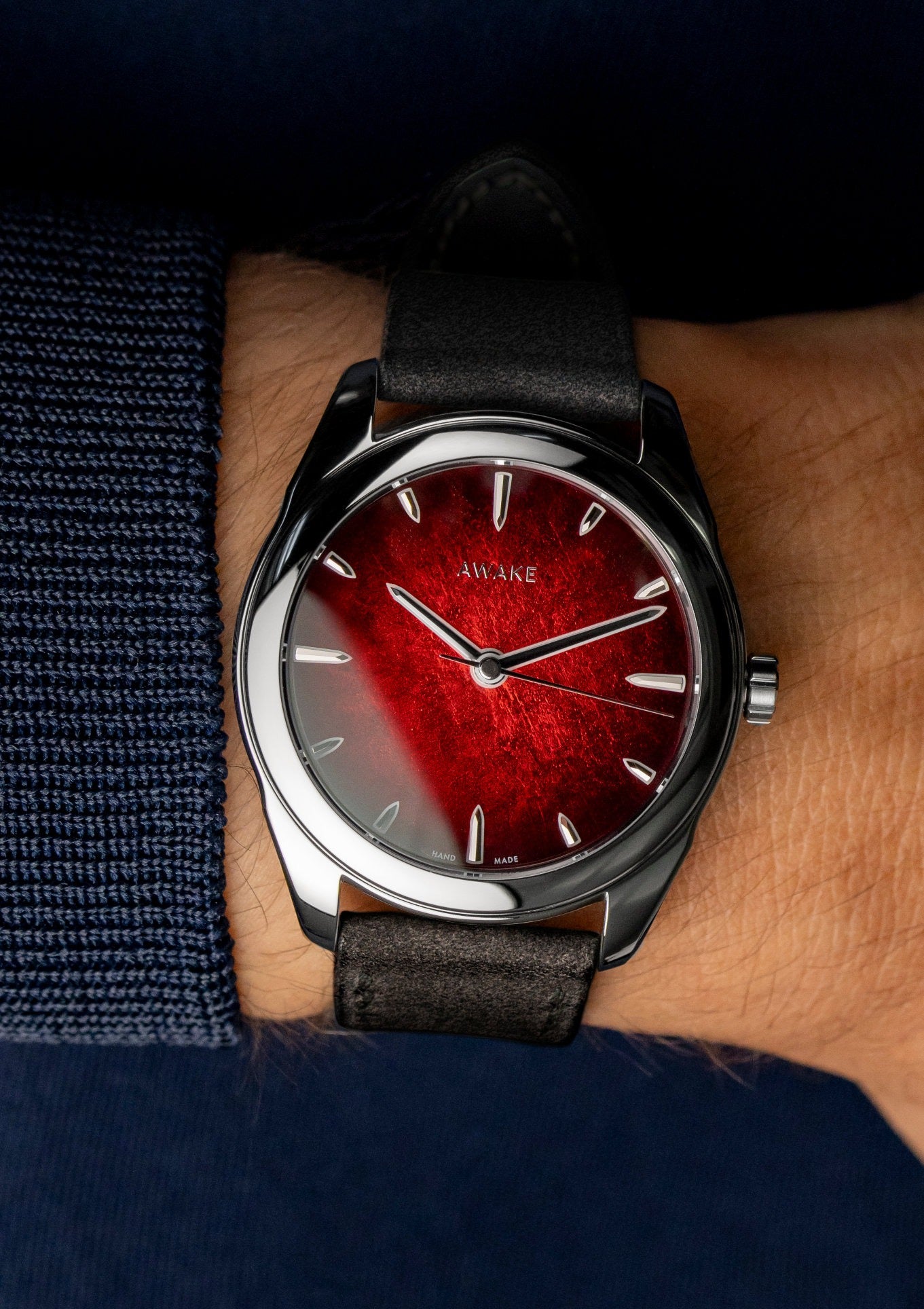 Jedes Awake Son Mai Silver Leaf Vignette Carmine Red Zifferblatt ist einzigartig. Es lädt das Auge ein, zu verweilen und sich in den Licht-Reflexionen, Farben und Texturen zu verlieren.