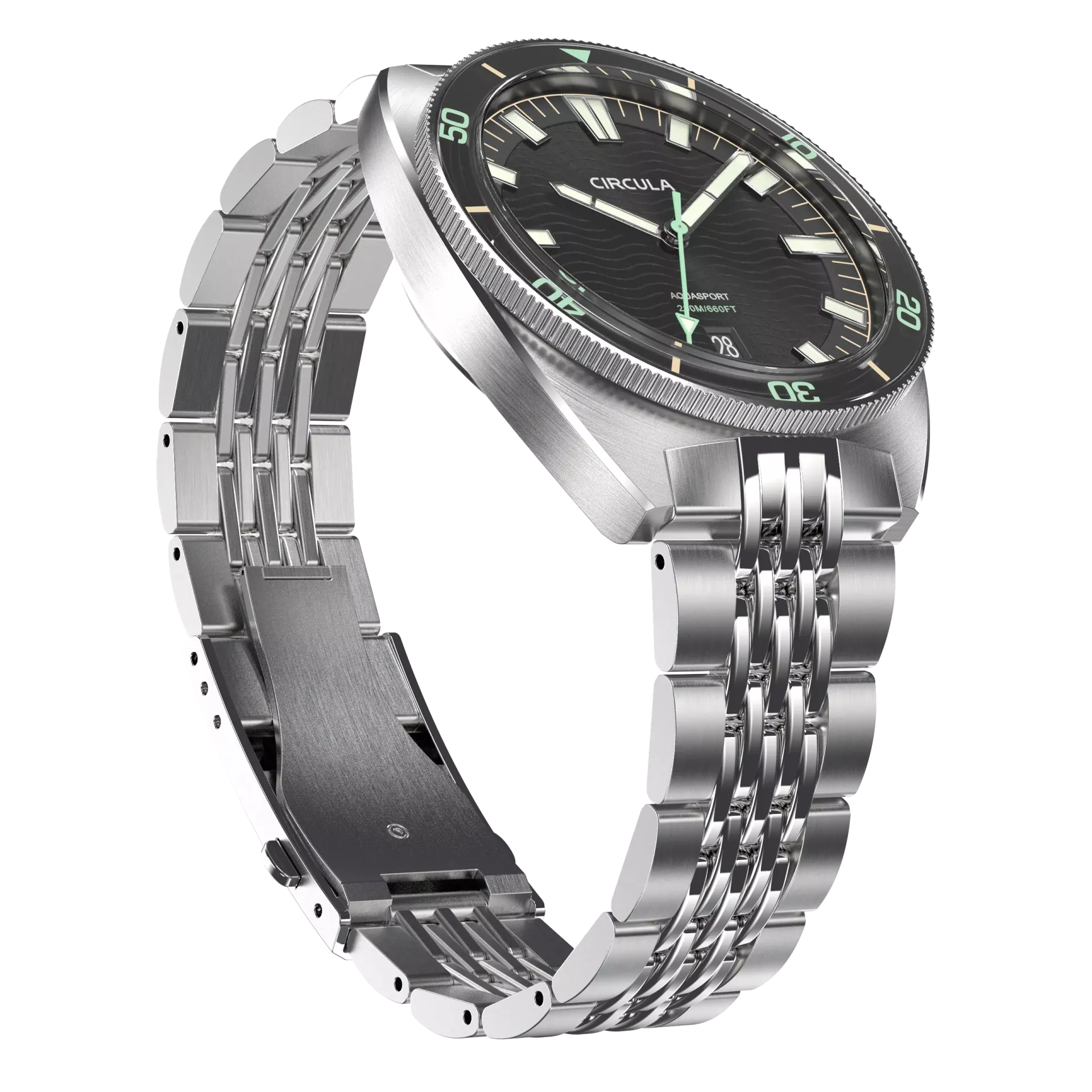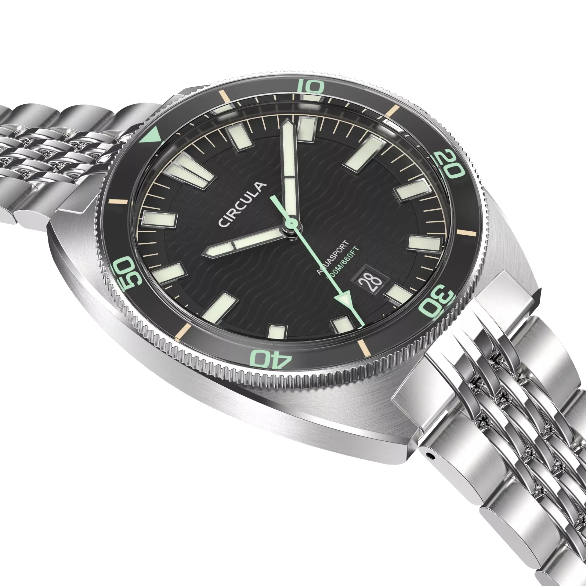 - Linksdrehende, kratzfeste Saphirglas-Lünette mit 120er Rastung und Leuchtindizes aus Swiss Super-LumiNova BGW9 (blau leuchtend)