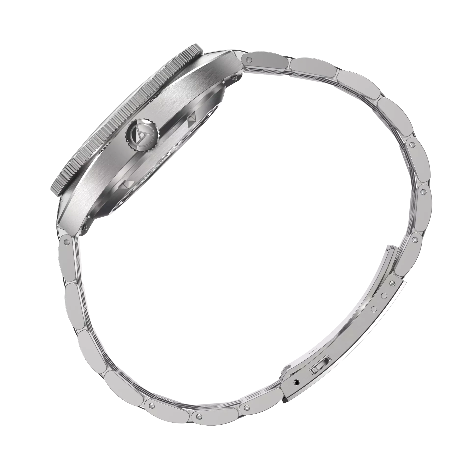 Die Lünette mit ihren zwei sich überlappenden konischen Flächen und ihrem zum Gehäuse hin abfallenden Rand erzeugt einen außergewöhnlichen dreidimensionalen Effekt. Die harmonischen Linien des Gehäuses setzen sich bis zum integrierten Edelstahlarmband fort. Komplexe geometrische Formen fangen das Licht ein und reflektieren es auf vielfältige Weise, je nach Blickwinkel immer wieder neu und faszinierend.