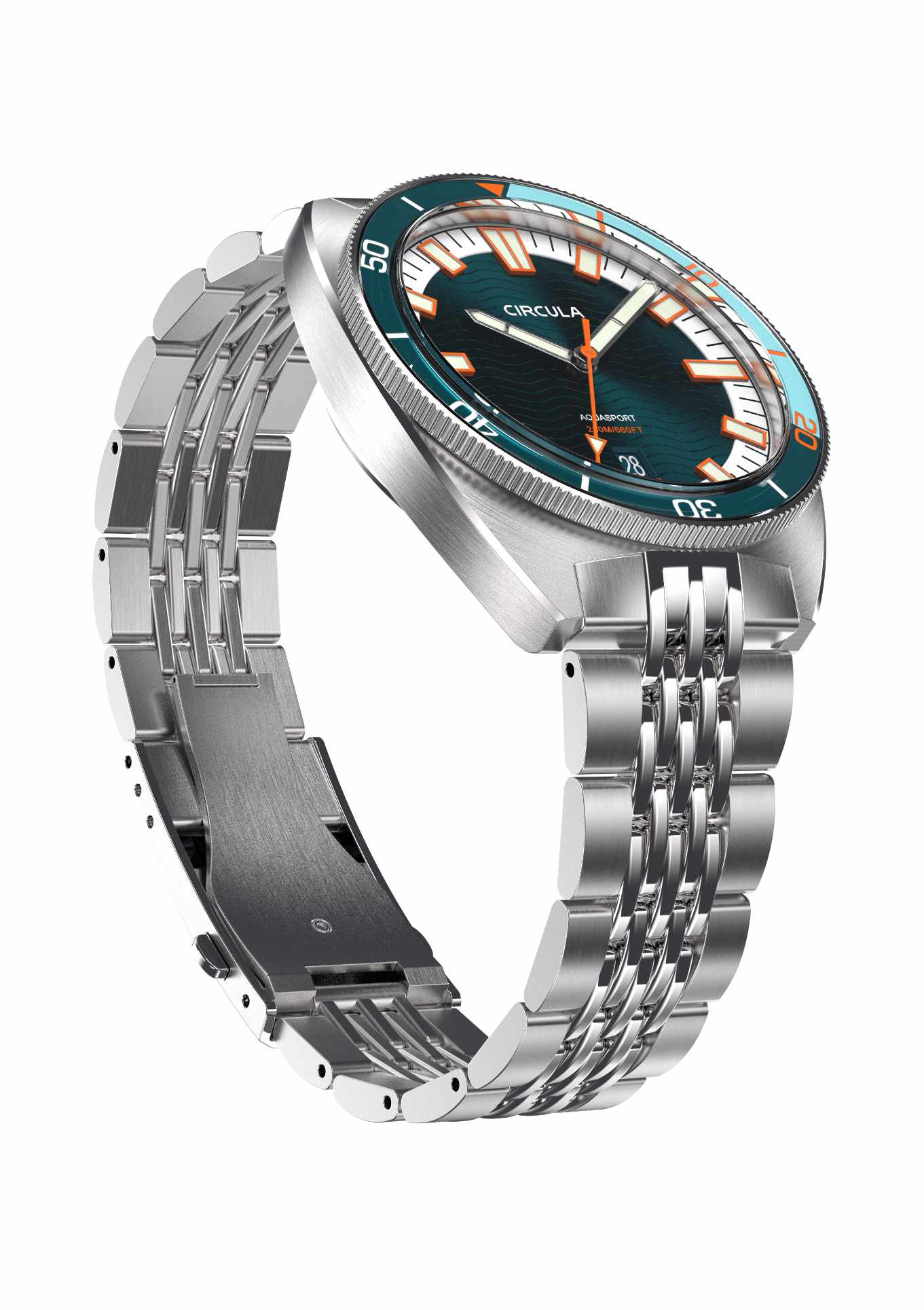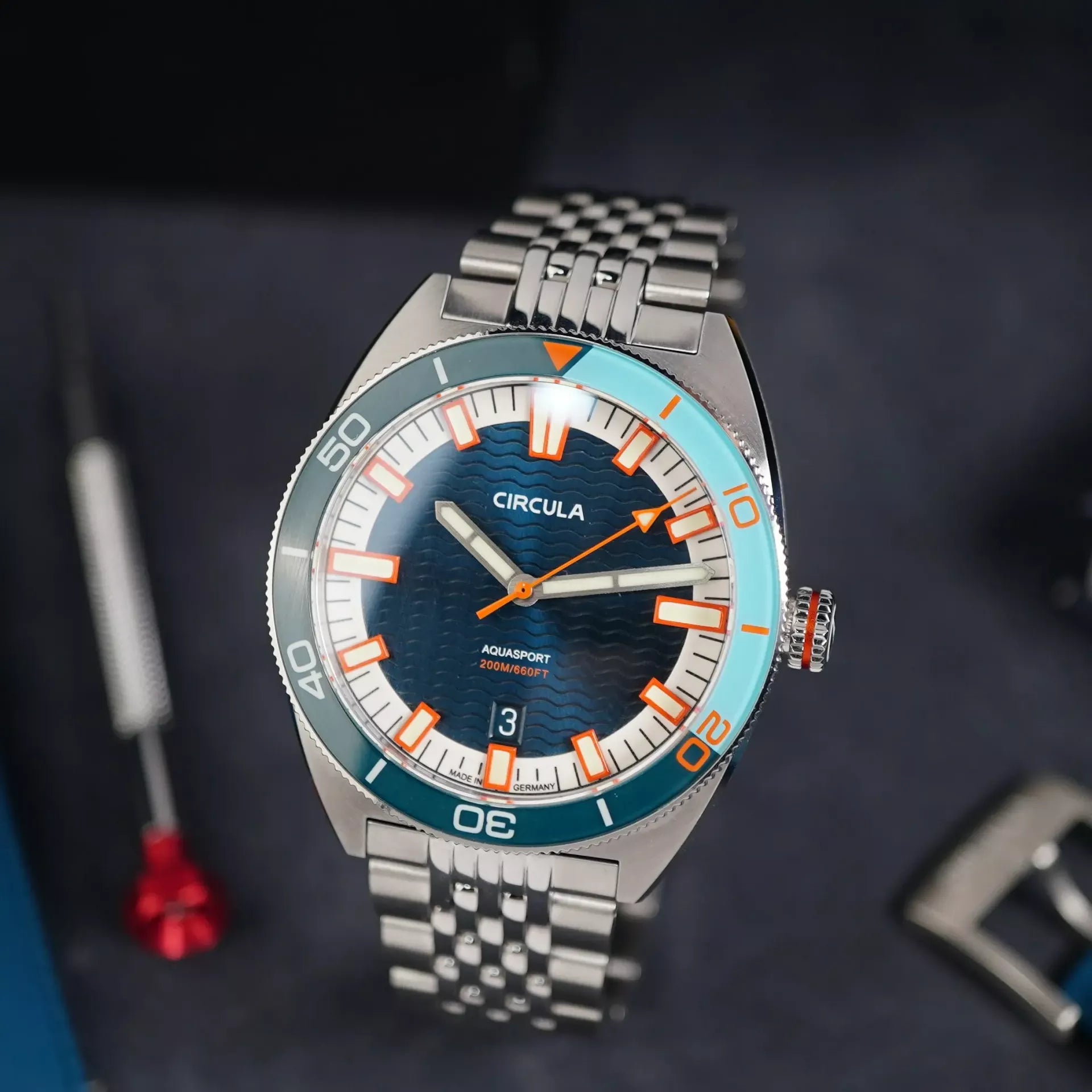 - Linksdrehende, kratzfeste Saphirglas-Lünette mit 120er Rastung und Leuchtindizes aus Swiss Super-LumiNova® BGW9 (blau leuchtend)