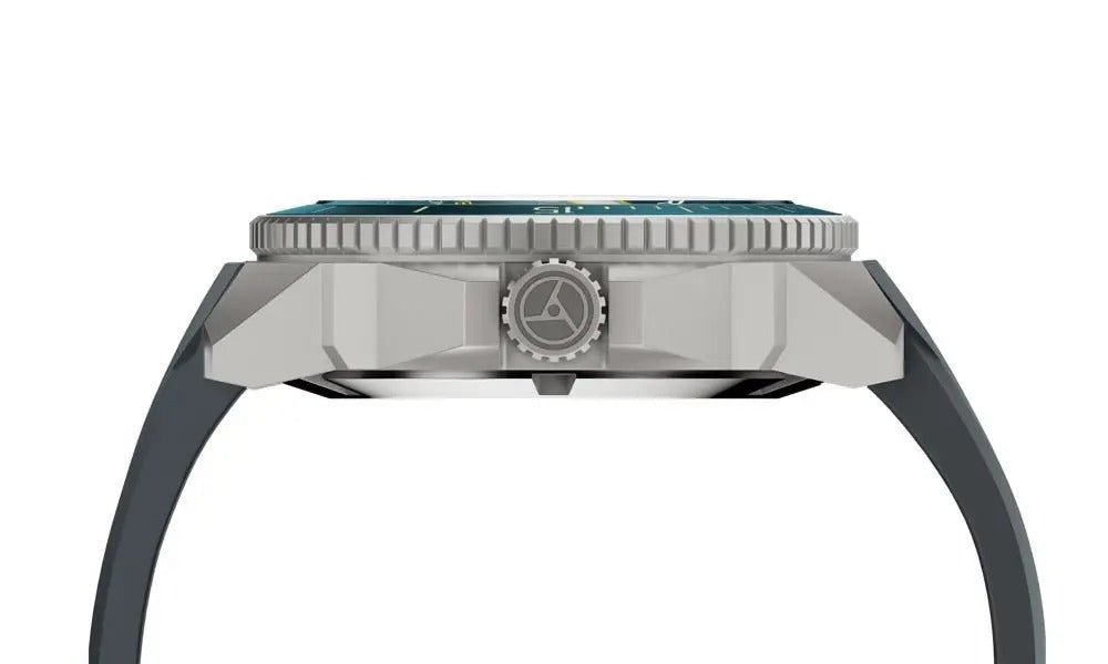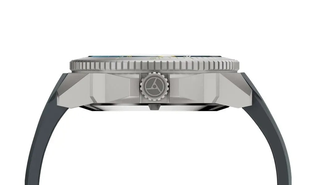 Die Lünette mit ihren zwei sich überlappenden konischen Flächen und ihrem zum Gehäuse hin abfallenden Rand erzeugt einen außergewöhnlichen dreidimensionalen Effekt. Die harmonischen Linien des Gehäuses setzen sich bis zum integrierten Edelstahlarmband fort. Komplexe geometrische Formen fangen das Licht ein und reflektieren es auf vielfältige Weise, je nach Blickwinkel immer wieder neu und faszinierend.