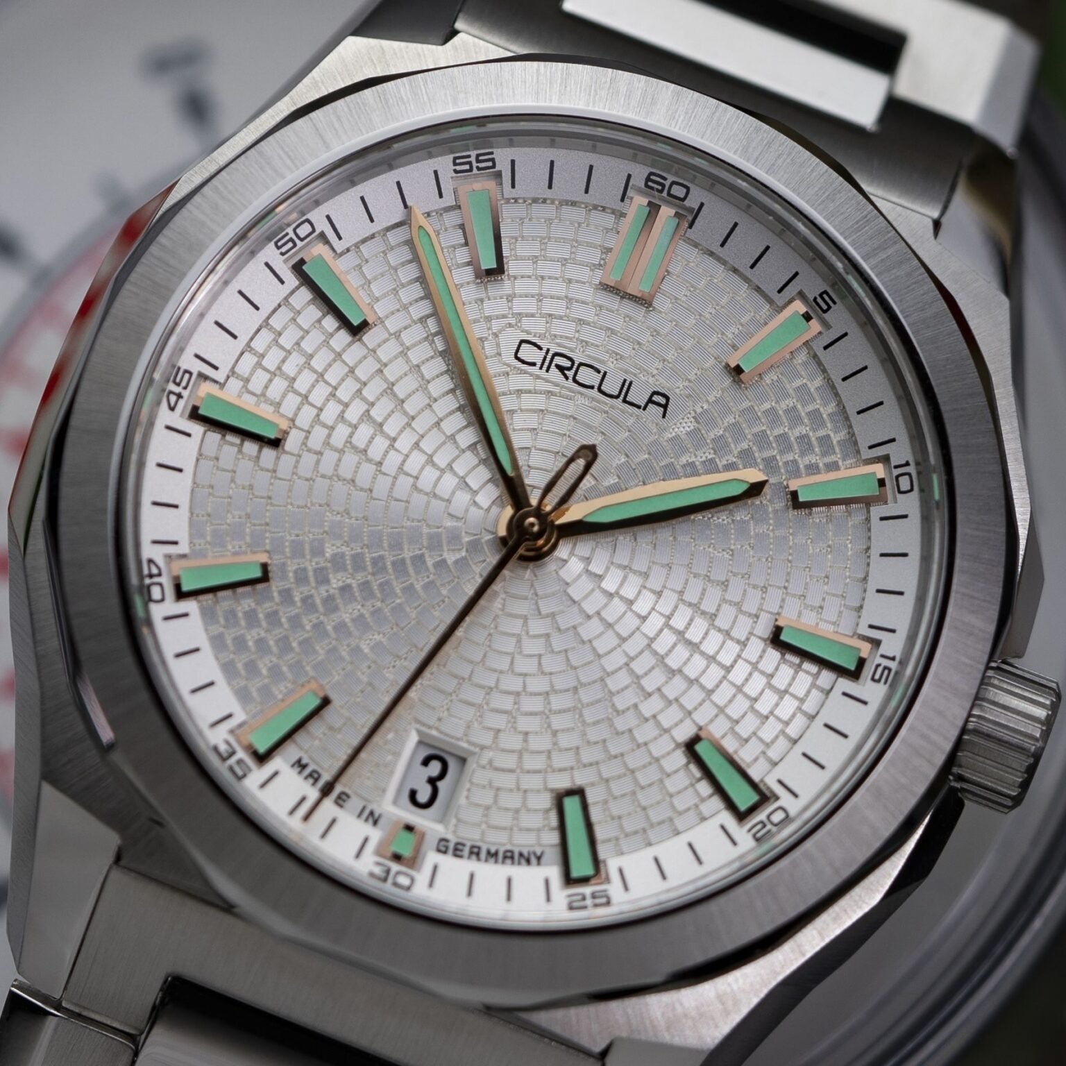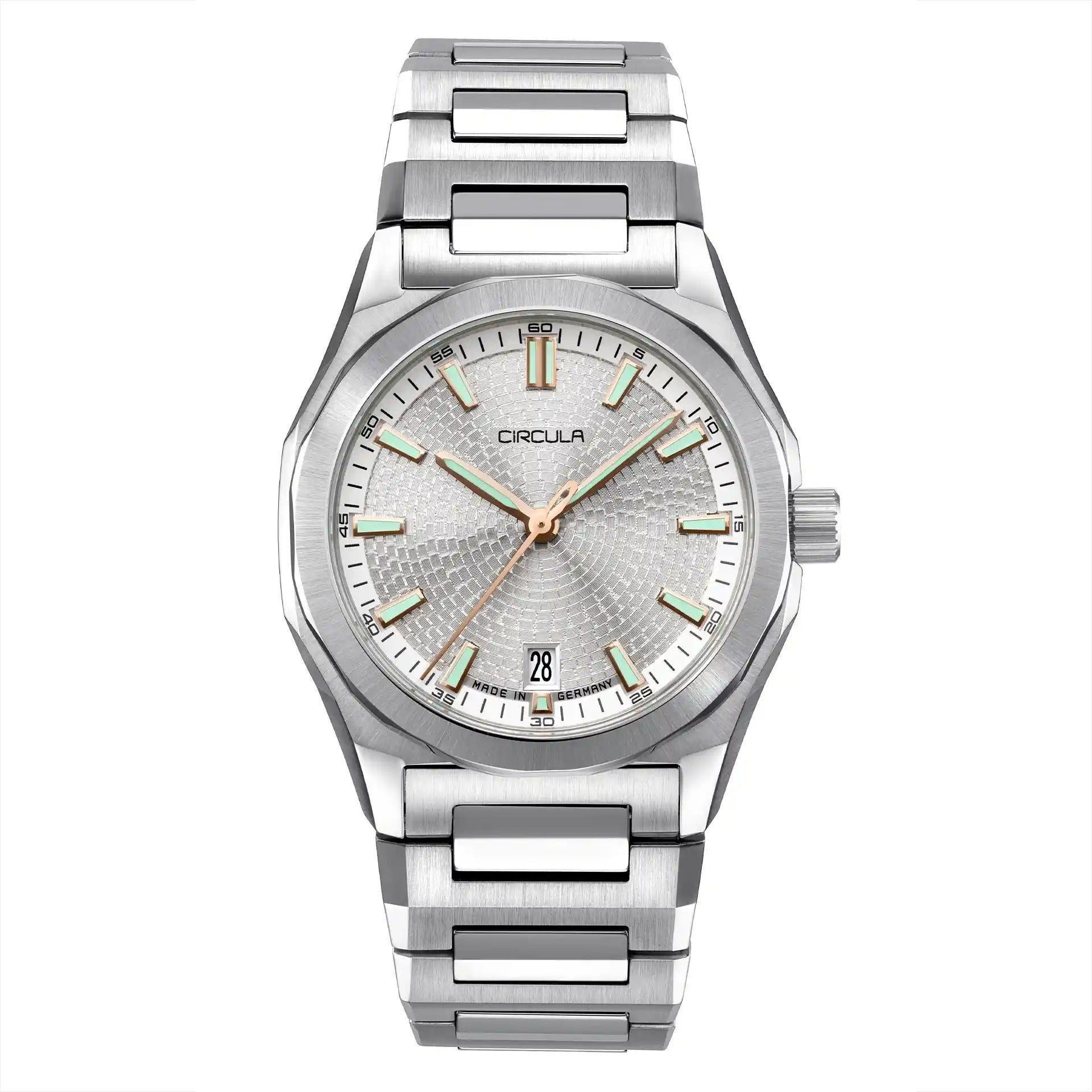 Die neue Facet ist die raffinierteste, hochwertigste und technisch fortschrittlichste Automatikuhr von Circula. Sie repräsentiert für uns ein neues Niveau an Handwerkskunst und Design. Eine moderne Go-Anywhere-Do-Anything-Uhr – GADA – mit einem absolut außergewöhnlichen Look. Die sich kreuzenden linearen Flächen verleihen der Facet nicht nur ihr einzigartiges Aussehen, sondern auch ihren Namen. Die vielfältigen Facetten der Zeiger, Indizes, des Gehäuses und des Armbands bilden den technischen Rahmen für das fast schon opulent detaillierte Zifferblatt.